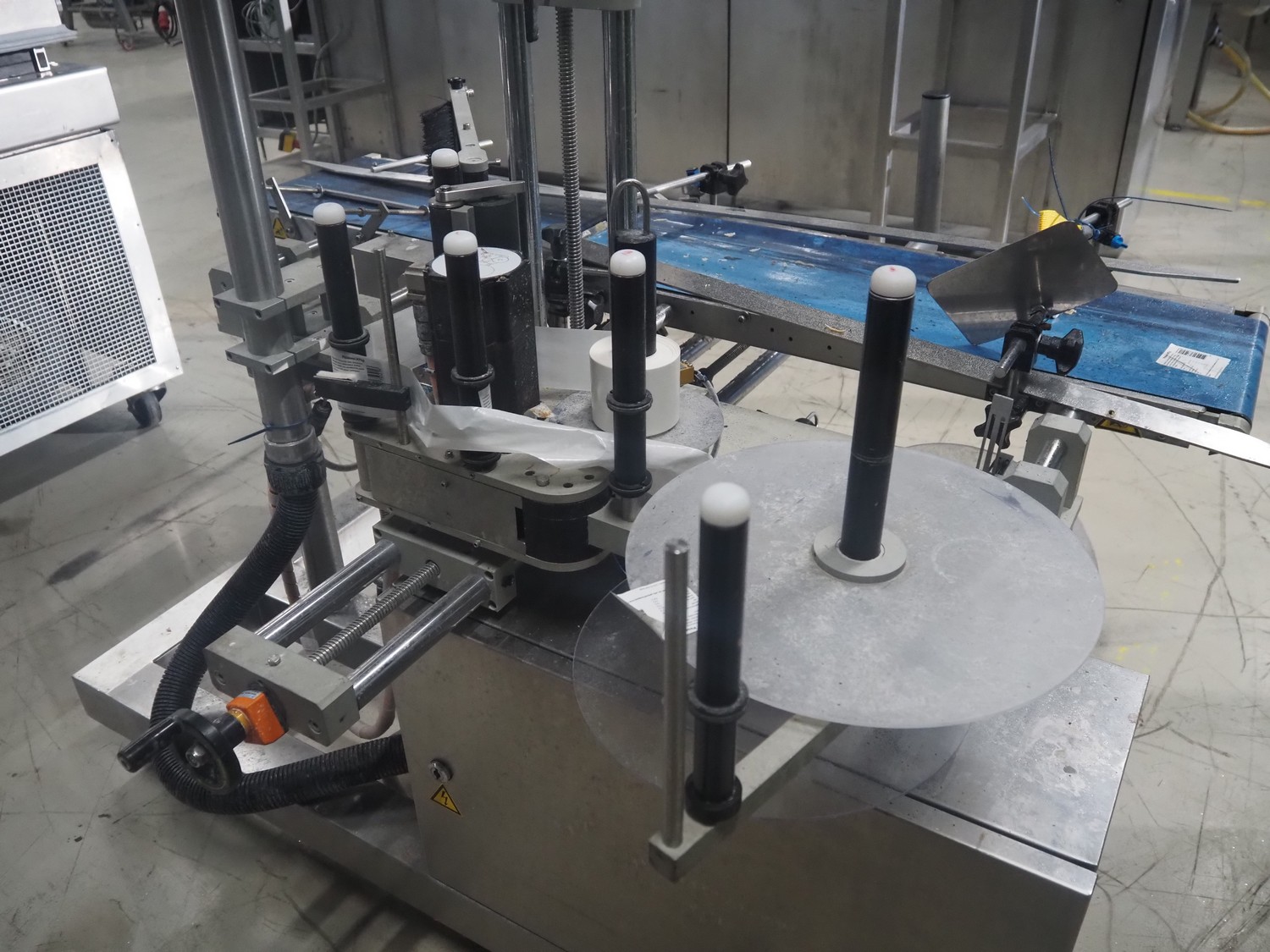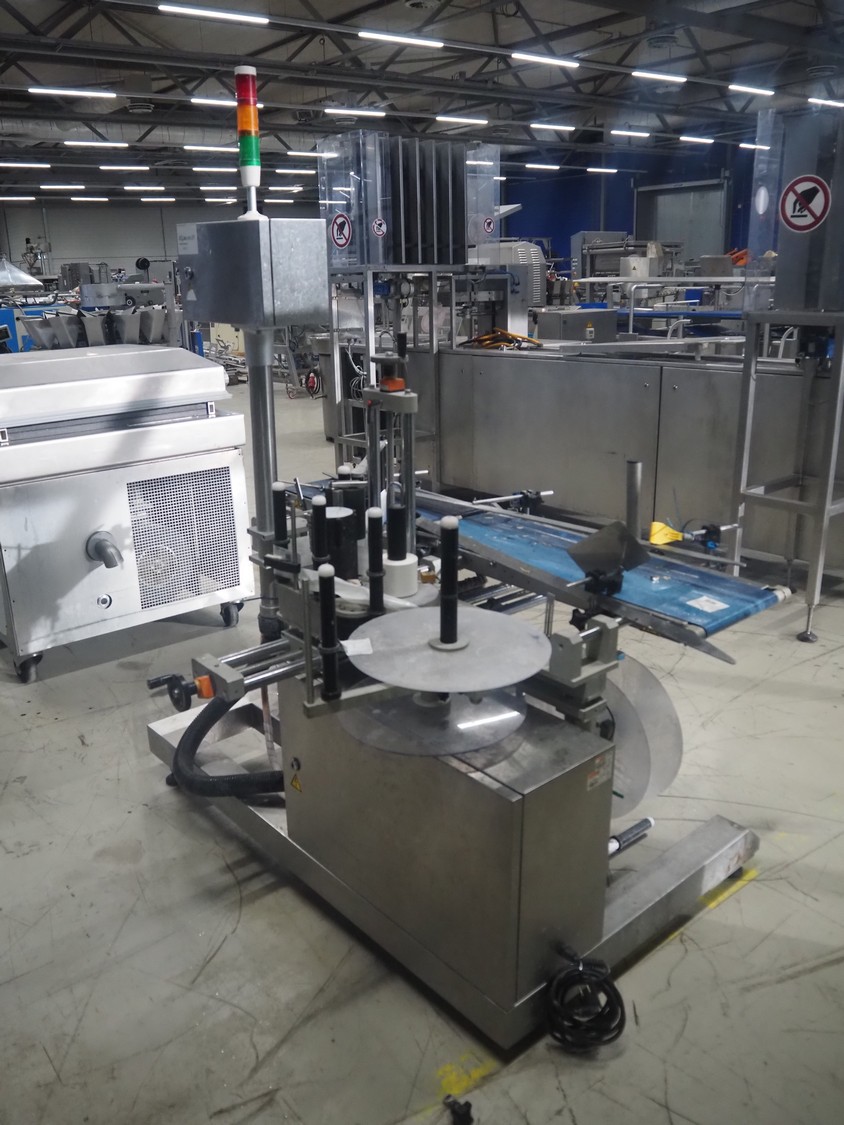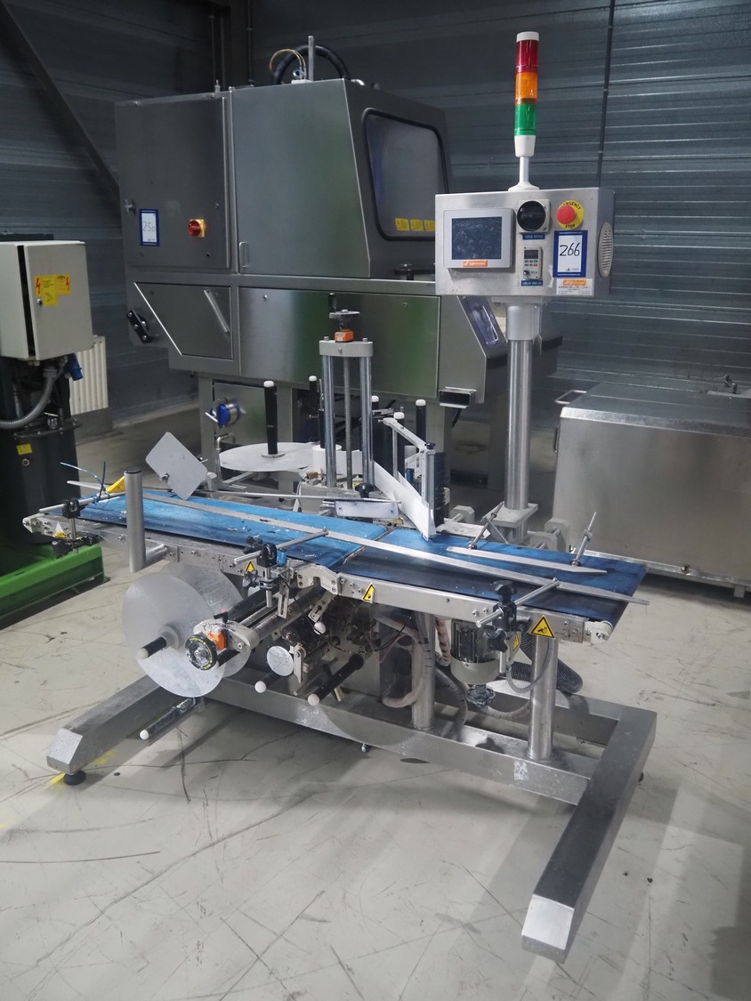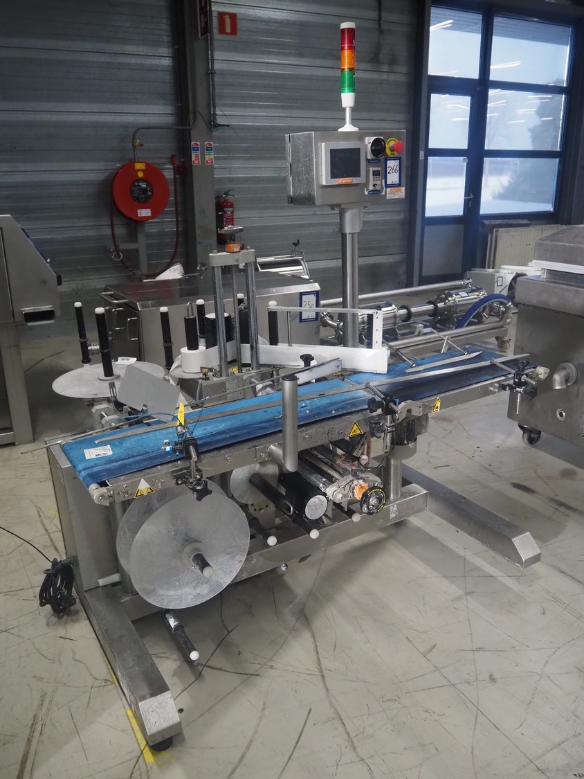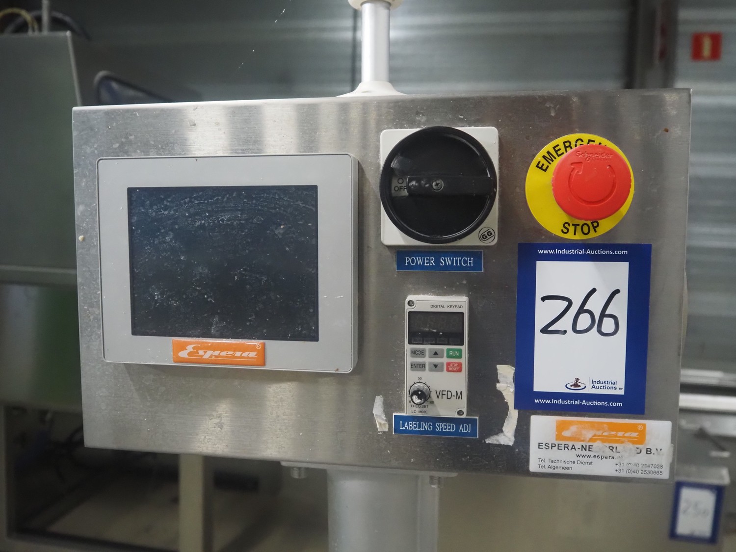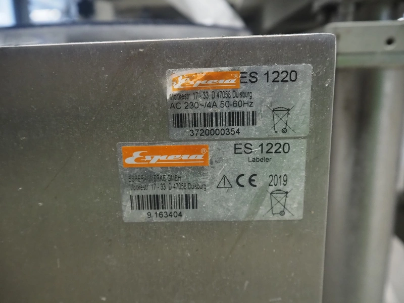 Espera label printer with bottom and side labeller, model: ES 1220, plastic belt, belt width: 300 mm, total dimensions: 1650 mm x 1350 mm x 1900 mm.