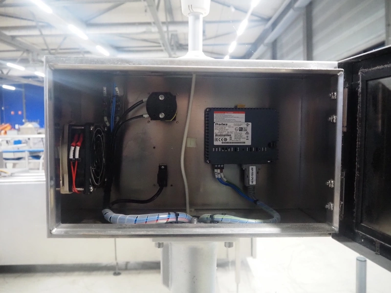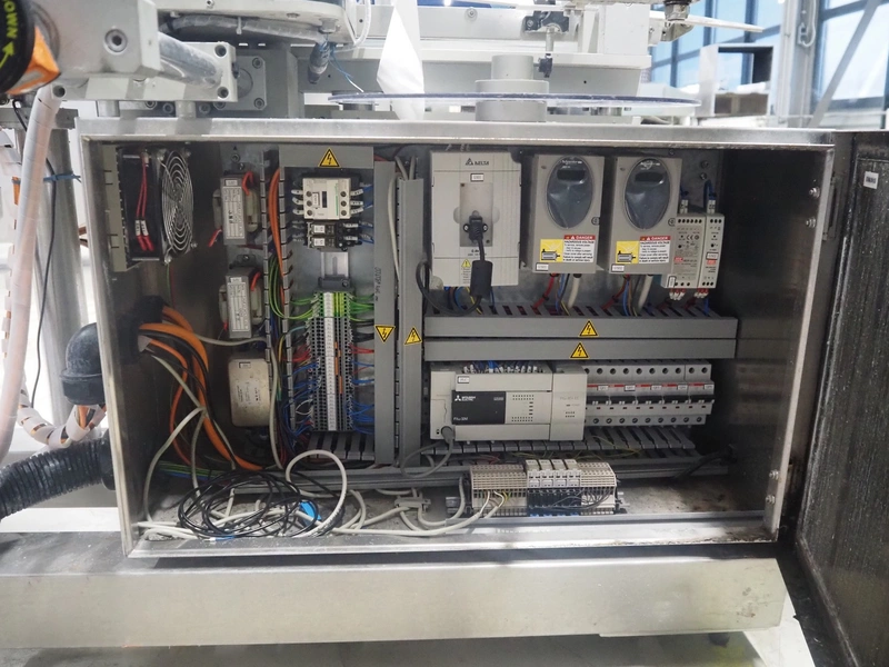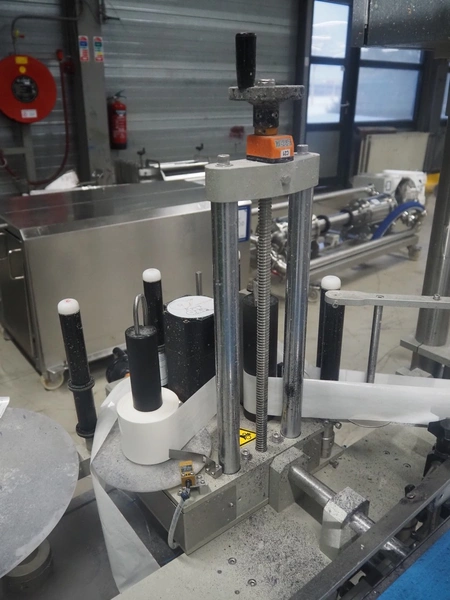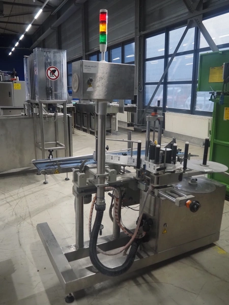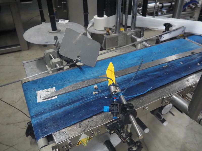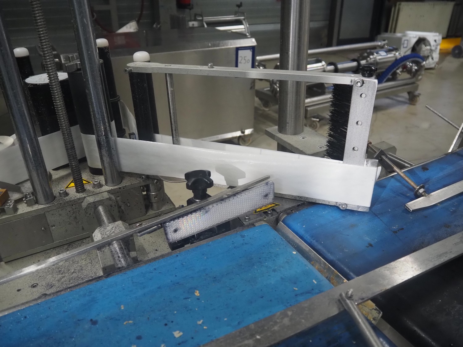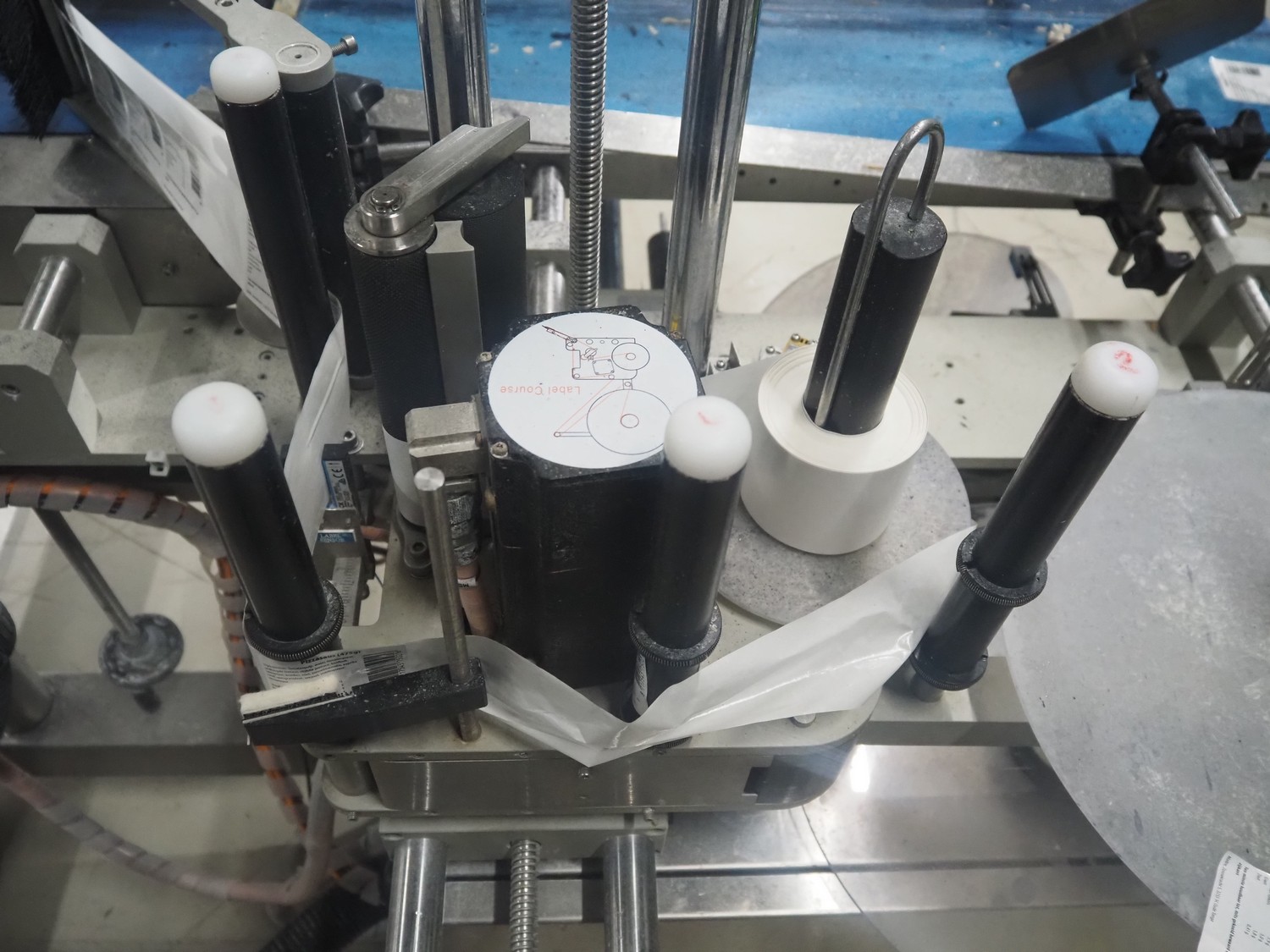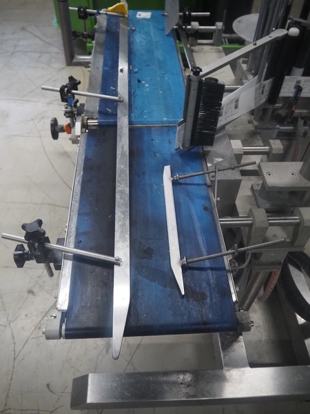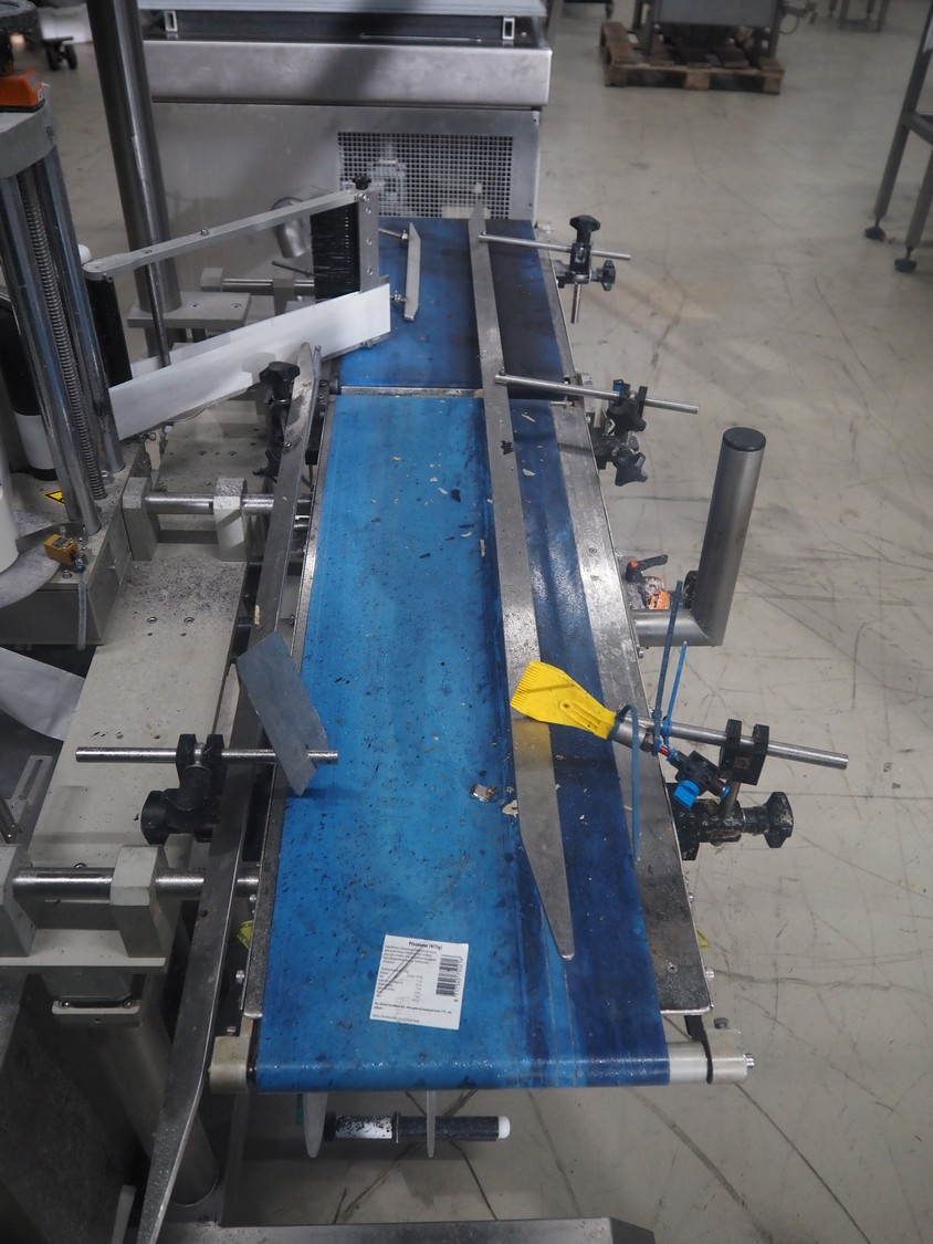 Espera label printer with bottom and side labeller, model: ES 1220, plastic belt, belt width: 300 mm, total dimensions: 1650 mm x 1350 mm x 1900 mm.