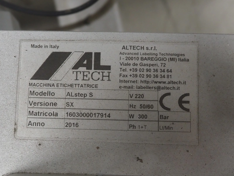 Altech s.r.l. mobile labeller, model: Alstep S, serial number: 1603000017914, year of construction: 2016, 220 V, 1 Ph, 50/60 Hz, 300 W, label width: 50 mm, total dimensions: 1250 mm x 720 mm x 1880 mm.