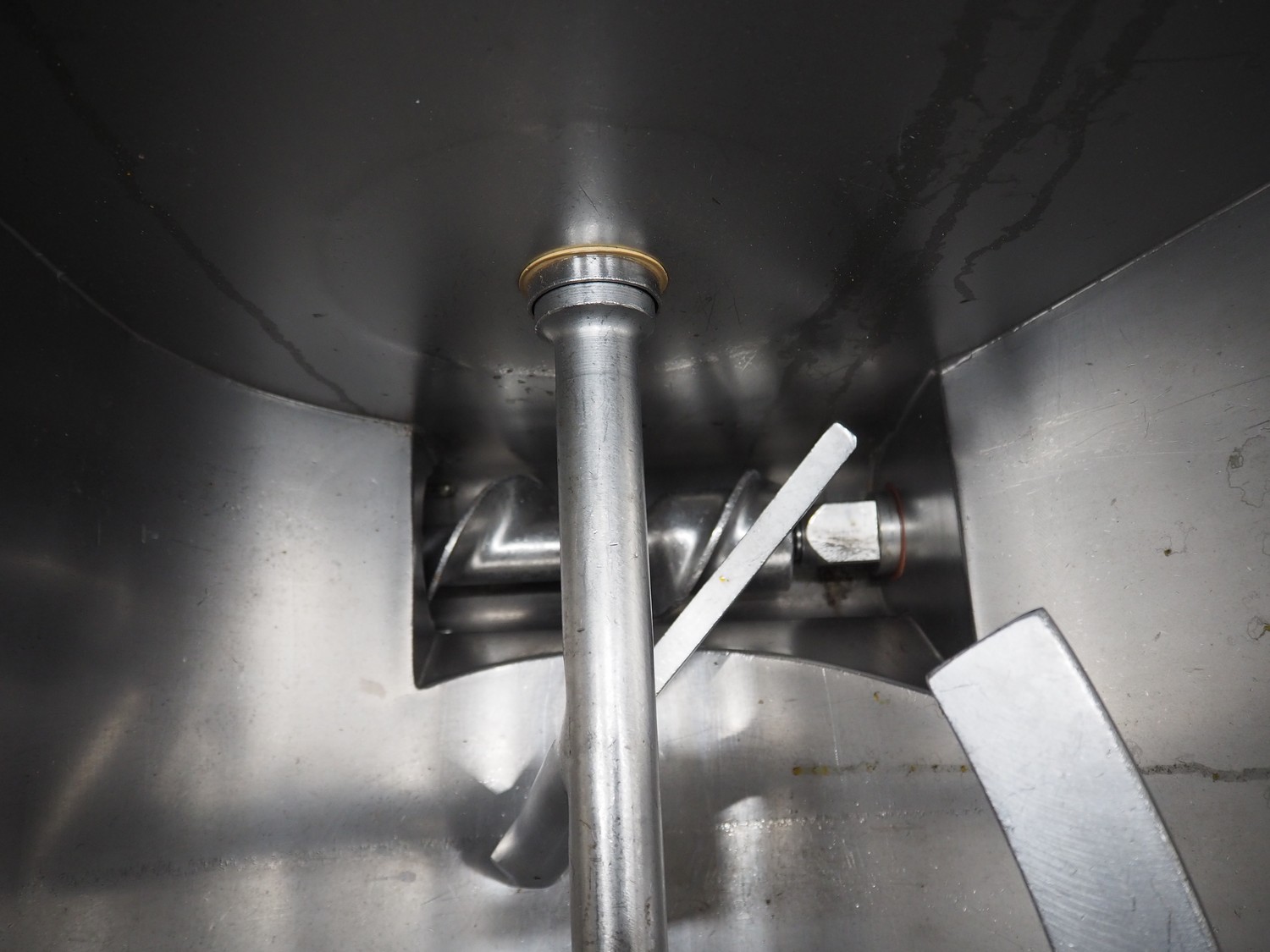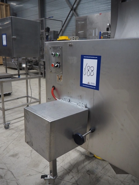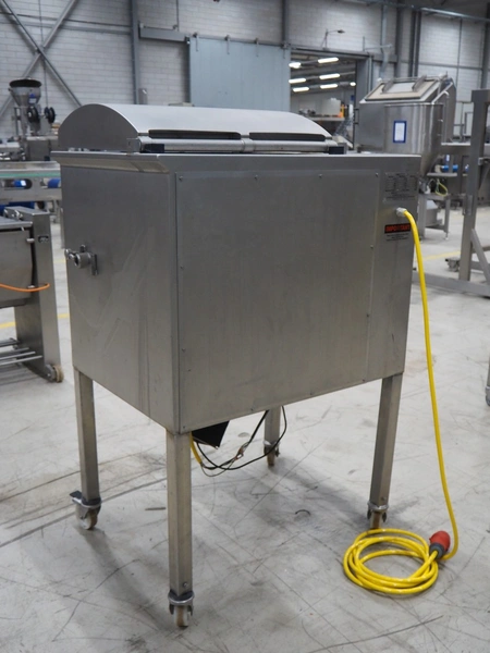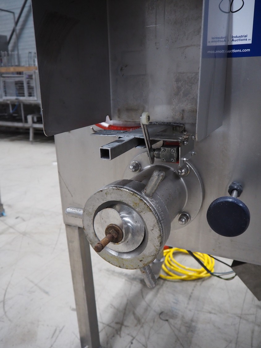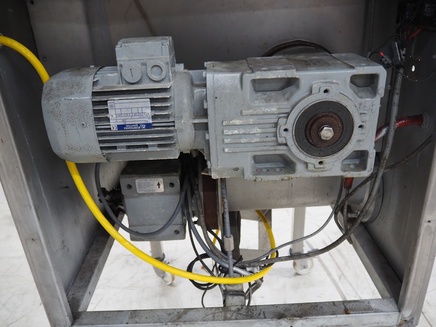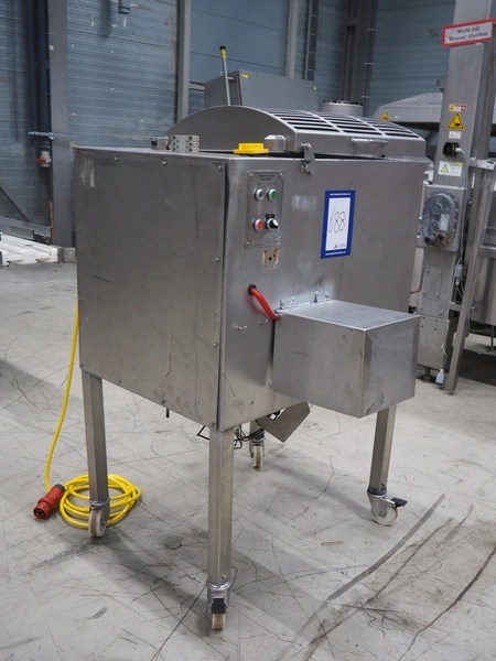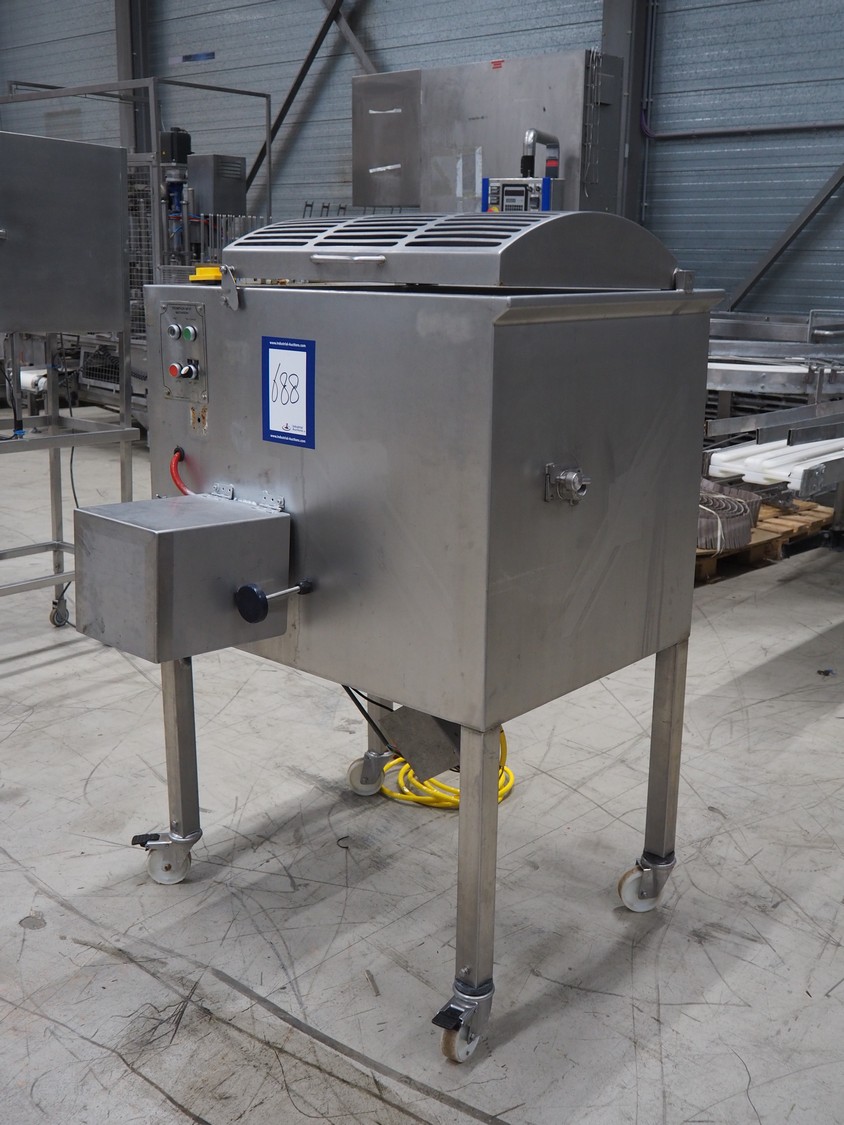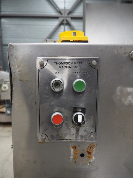 Thompson Meat Machinery mobile paddle-mixer grinder, type: 900 M/M, serial number: 900-M41-2-08, year of construction: 2005, 415 V, 50 Hz, 9.1 A, 4 kW, inside dimensions: 500 mm x 650 mm x 500 mm, diameter plate: 100 mm, total dimensions: 1000 mm x 920 mm x 1500 mm.