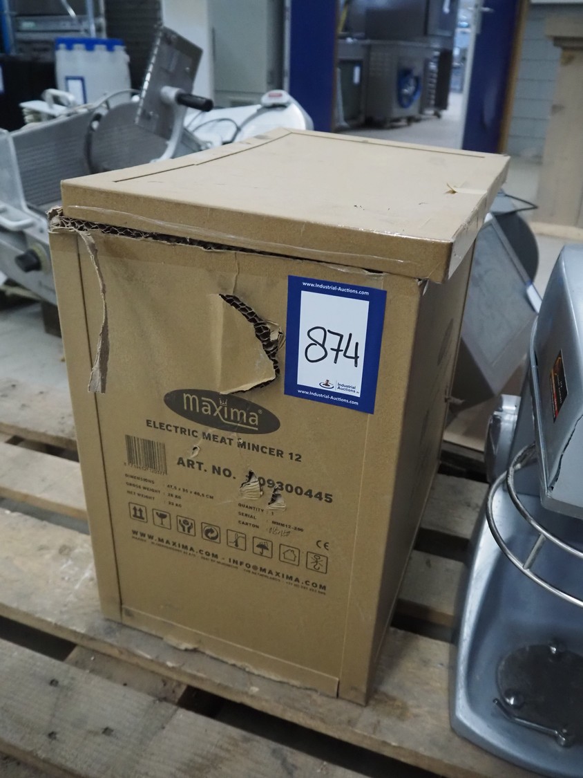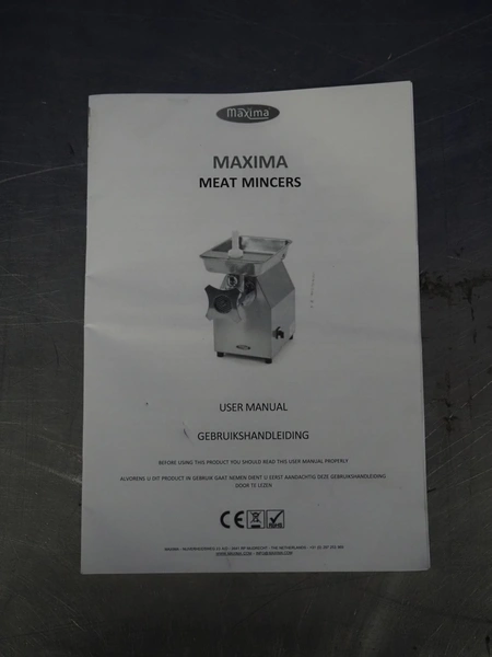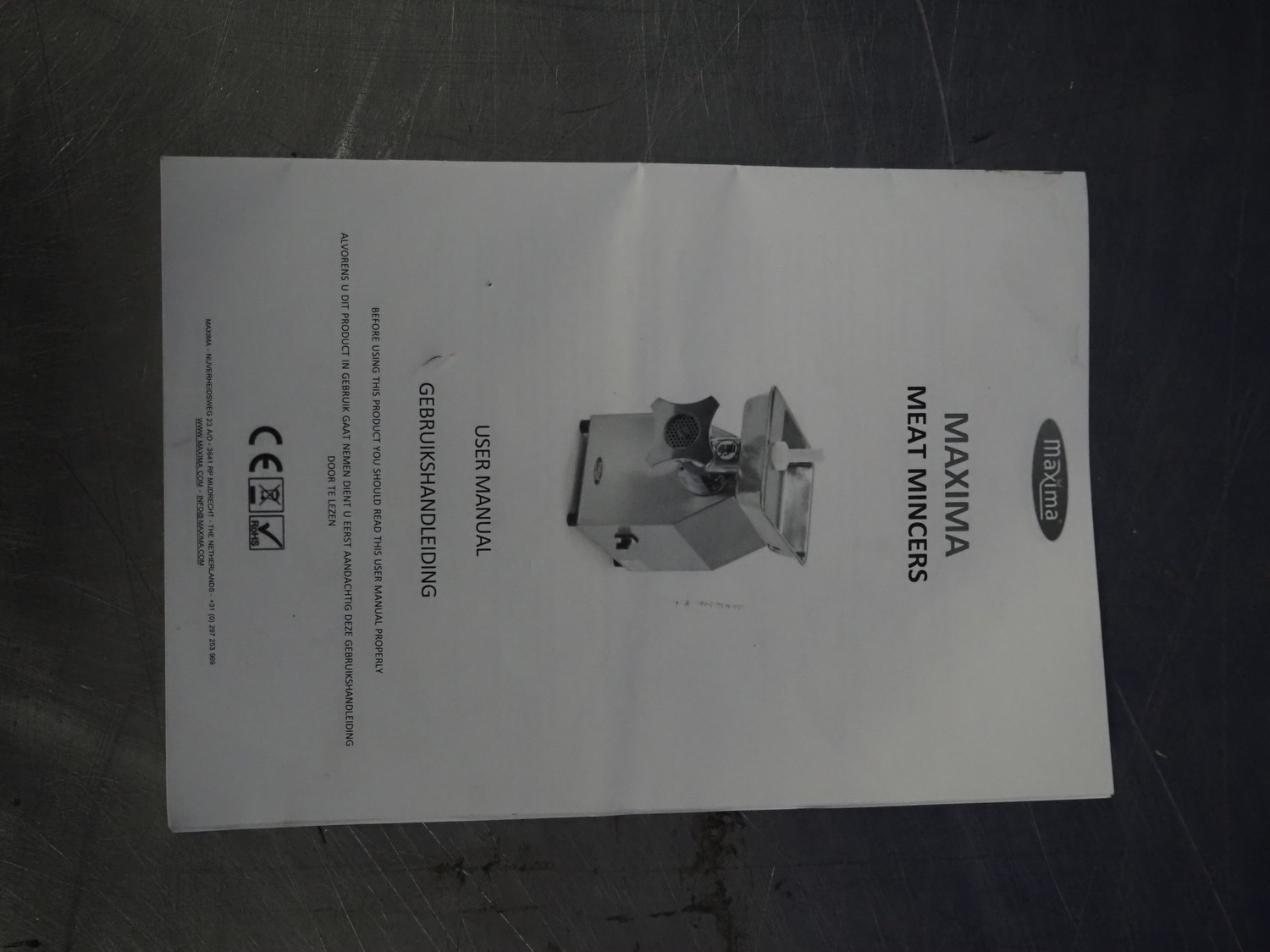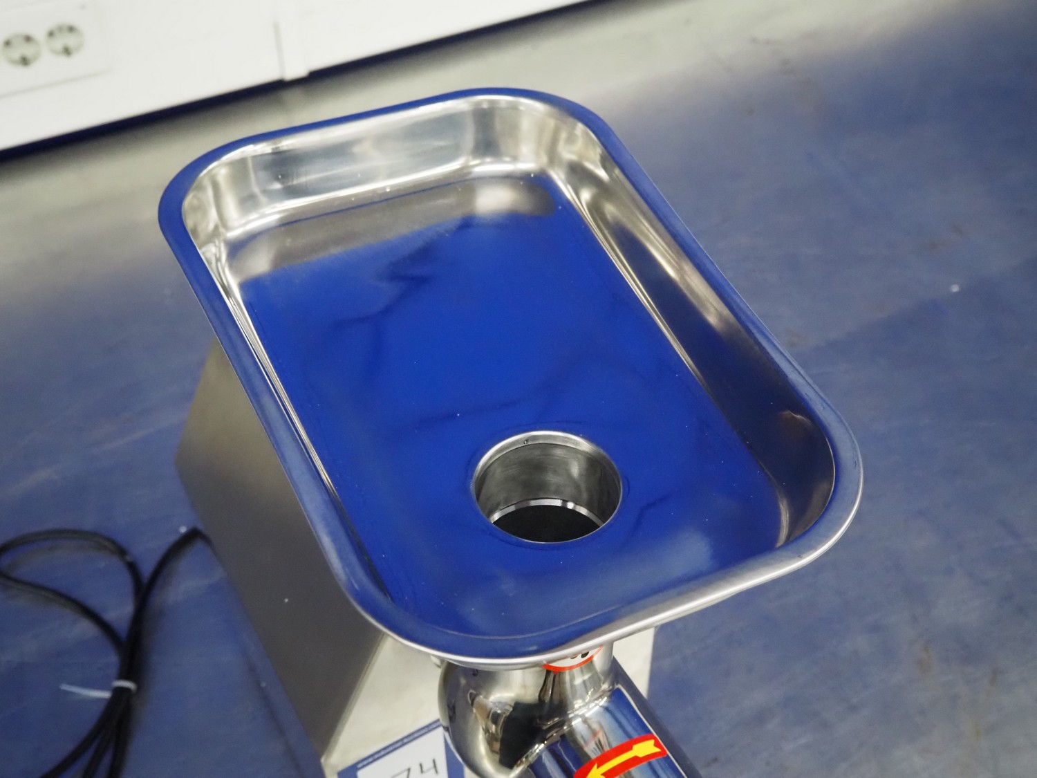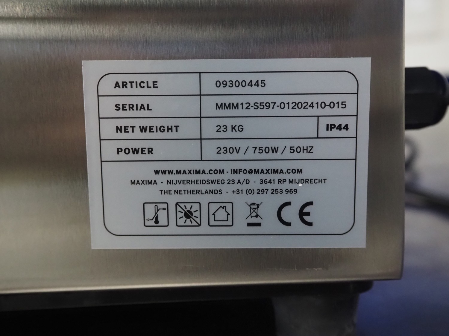 Maxima table model grinder, model: 09300445, serial number: MMM12-S597-01202410-015, 230 V, 1 Ph, 50 Hz, 750 W, weight: 23 kg, plate diameter: 70 mm, total dimensions: 440 mm x 250 mm x 460 mm.