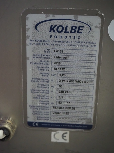 Kolbe grinder, type: LW 82, serial number: 78 1172, year of construction: 2016, 400 V, 3 Ph, 50 Hz, 3.1 A, 1.25 kW, diameter plate: 85 mm, total dimensions: 450 mm x 400 mm x 460 mm.