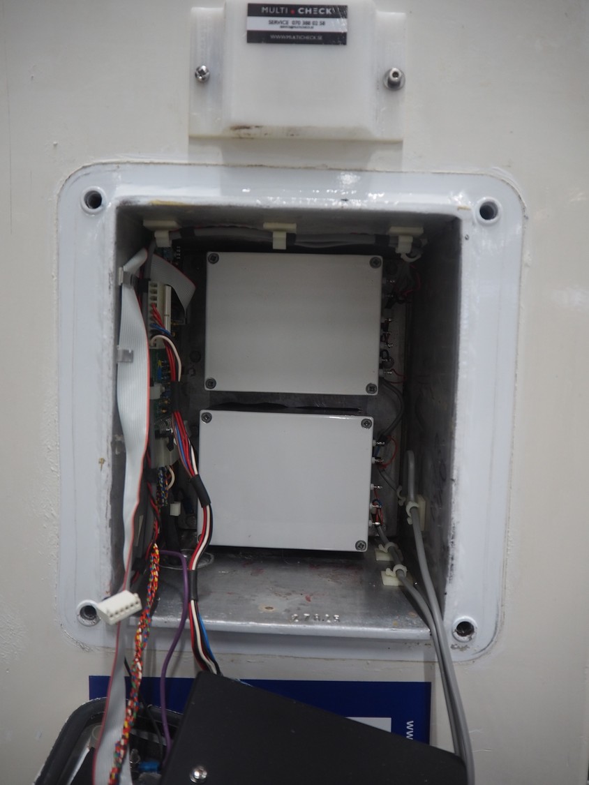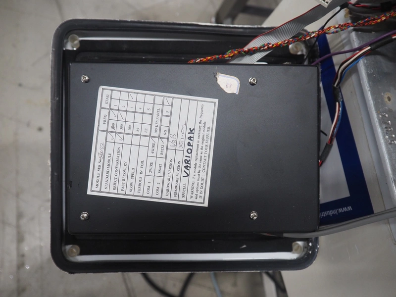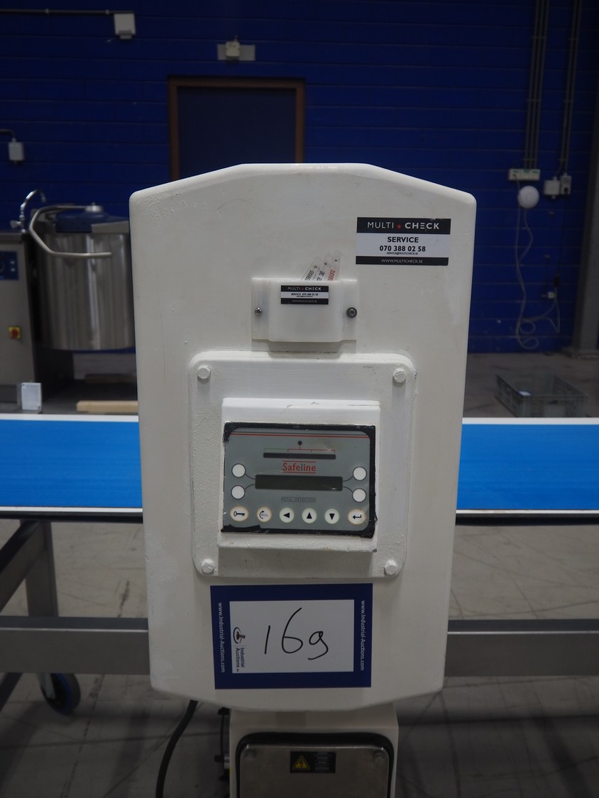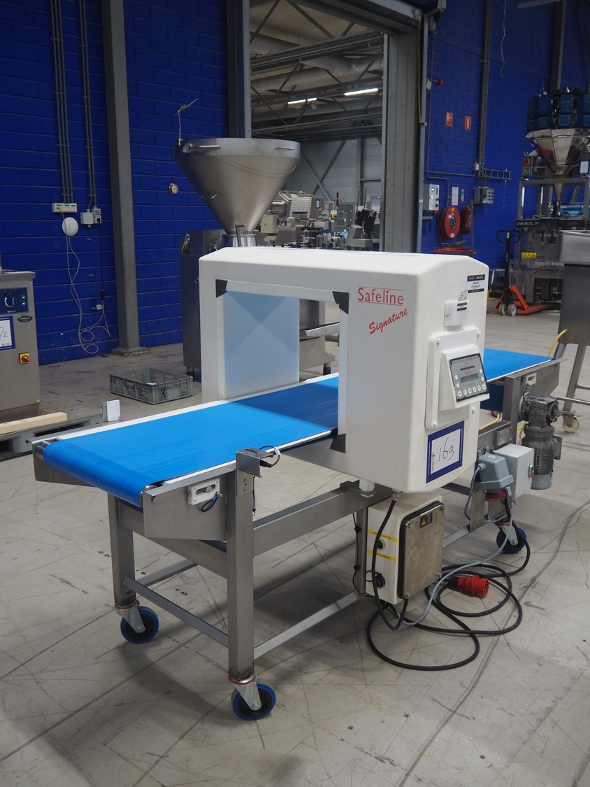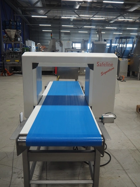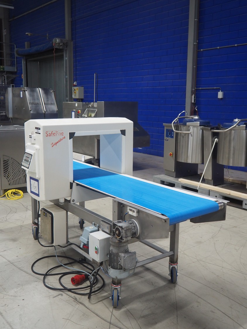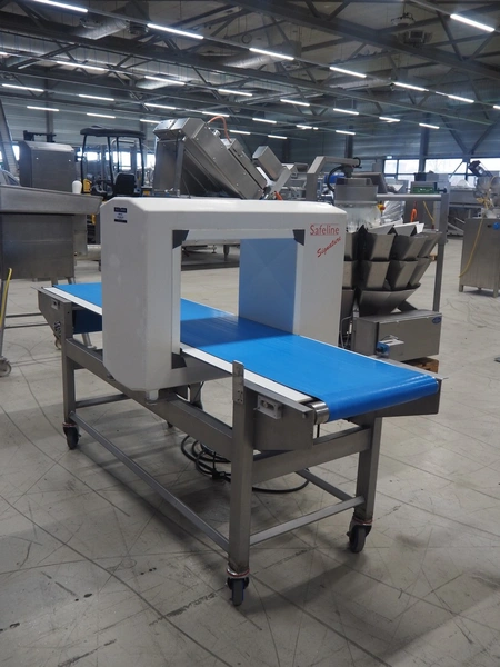 Safeline mobile metal detector, plastic belt, clearance: 500 mm x 370 mm, total dimensions: 2220 mm x 930 mm x 1270 mm.