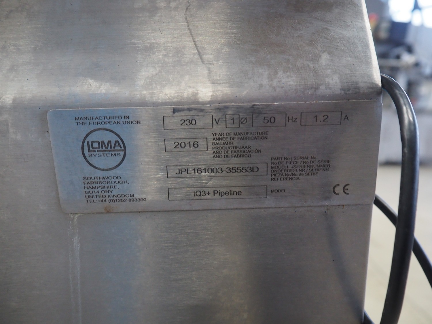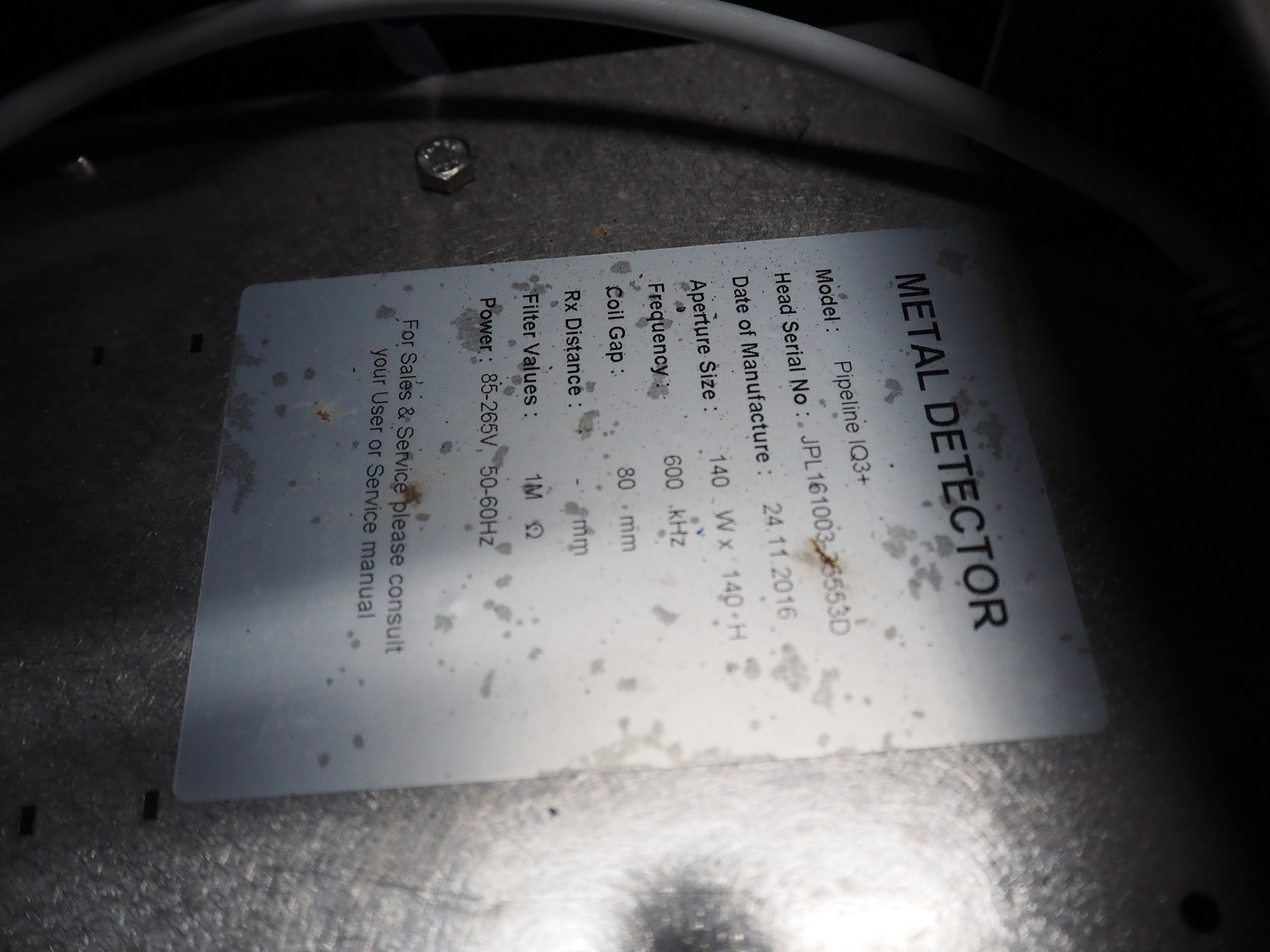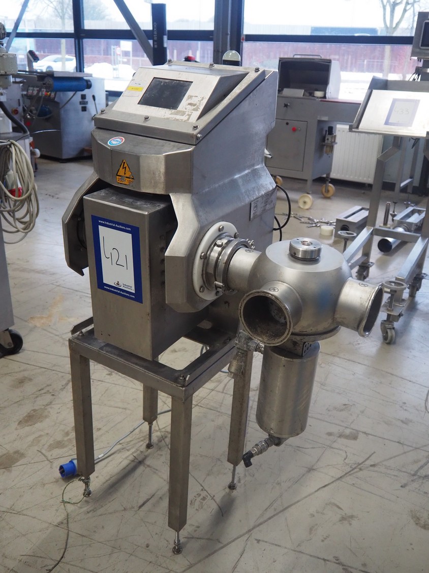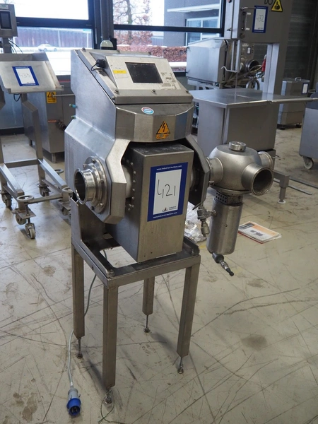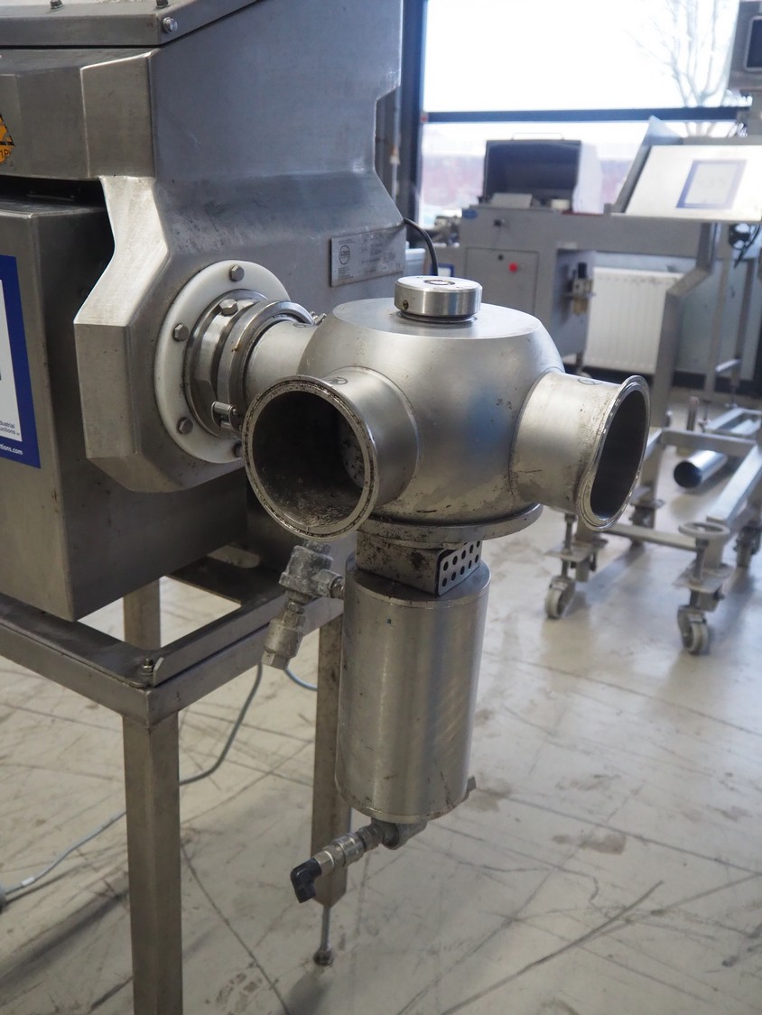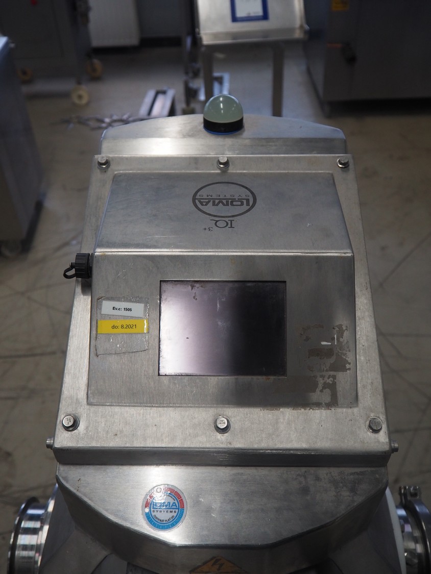 Loma Systems pipeline metal detector with rejecter, model: IQ³+ Pipeline, serial number: JPL161003-35553D, year of construction: 2016, 230 V, 1 Ph, 50 Hz, 1.2 A, pipe diameter: 100 mm, total dimensions: 900 mm x 600 mm x 1400 mm. Technical condition unknown.