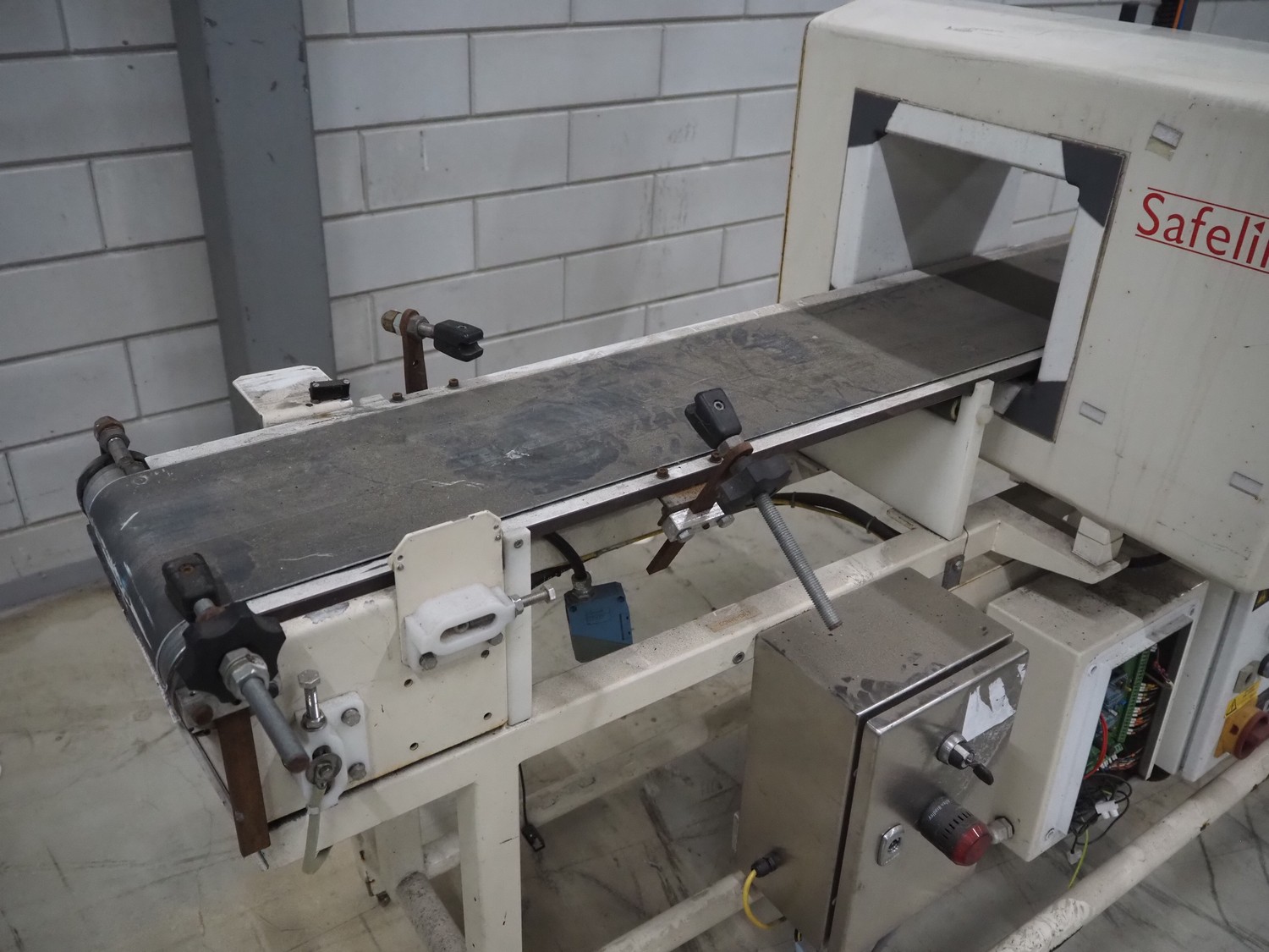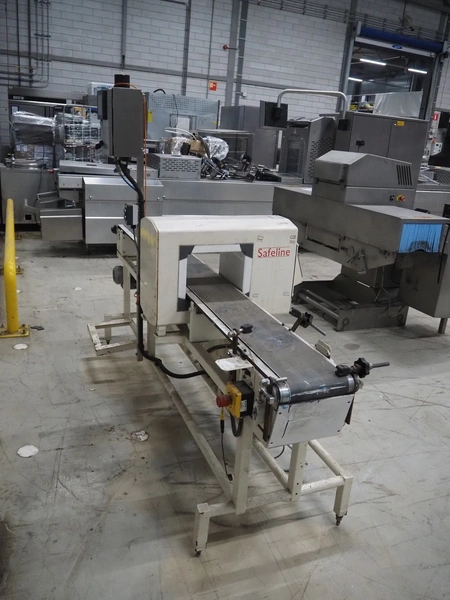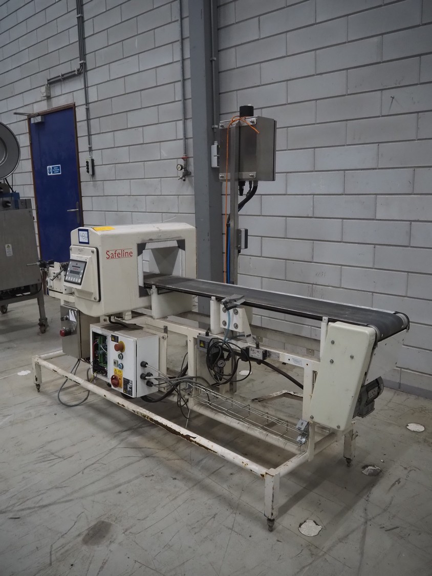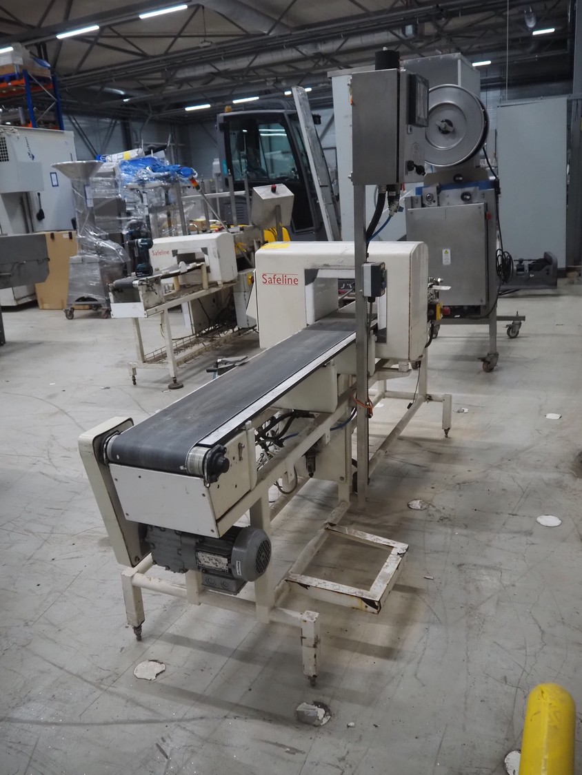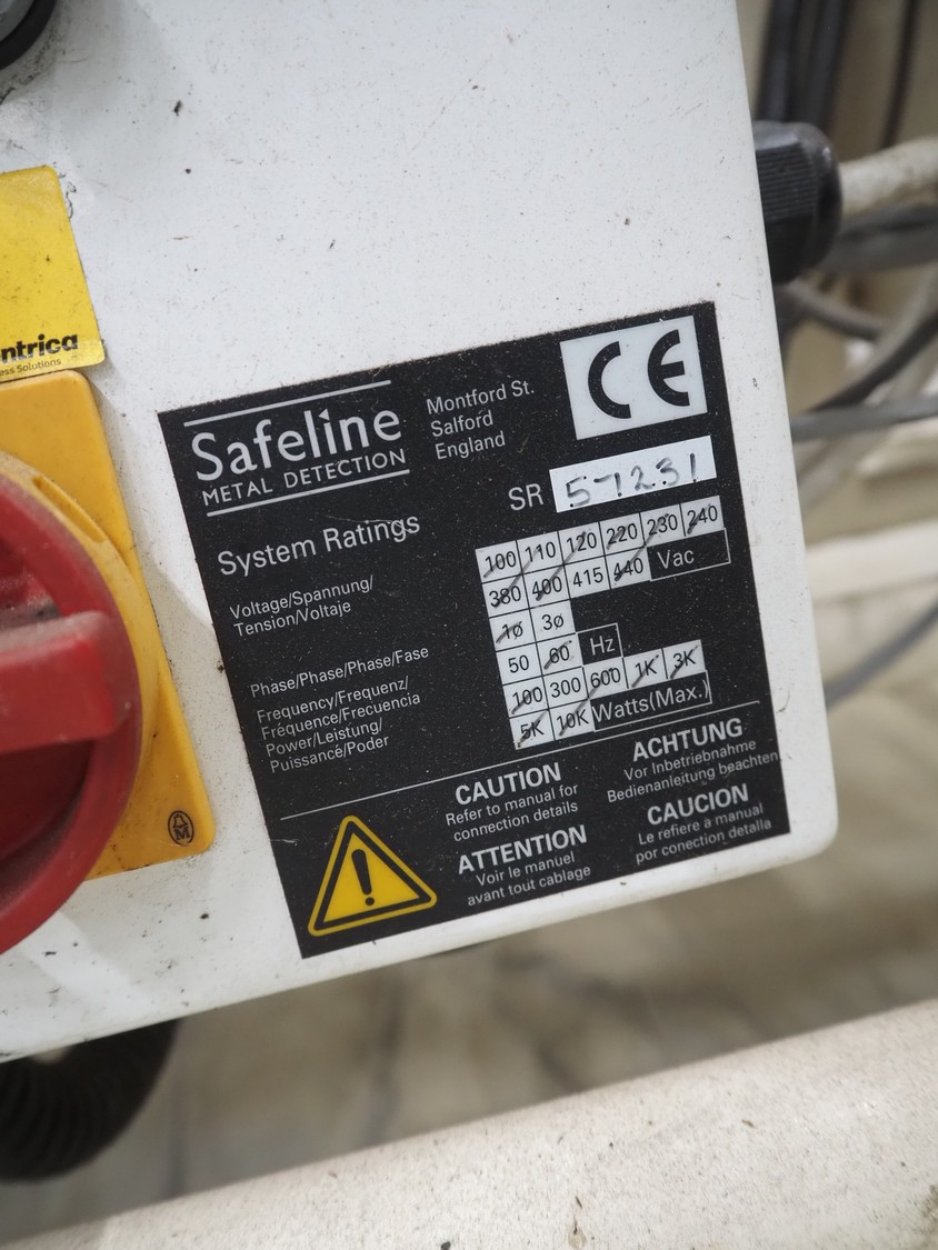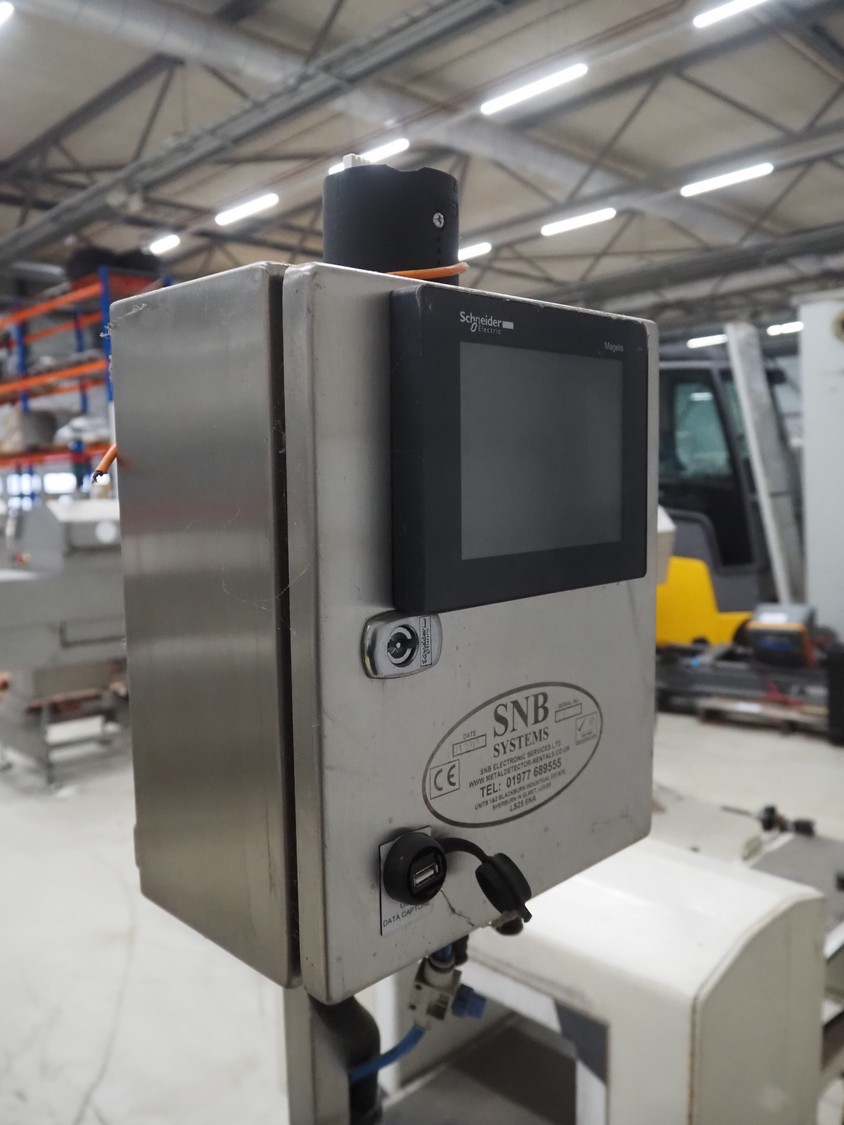 SNB Systems / Mettler Toledo Safeline metal detector, serial number: 57231, plastic belt, belt width: 200 mm, clearance: 255 mm x 170 mm, total dimensions: 2500 mm x 800 mm x 1700 mm. Missing cover.