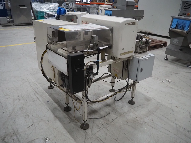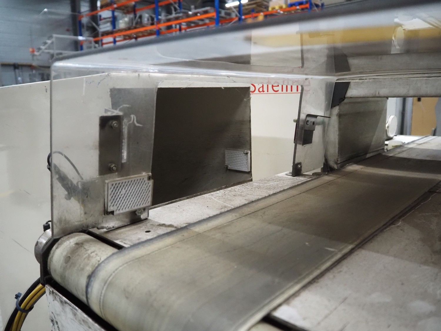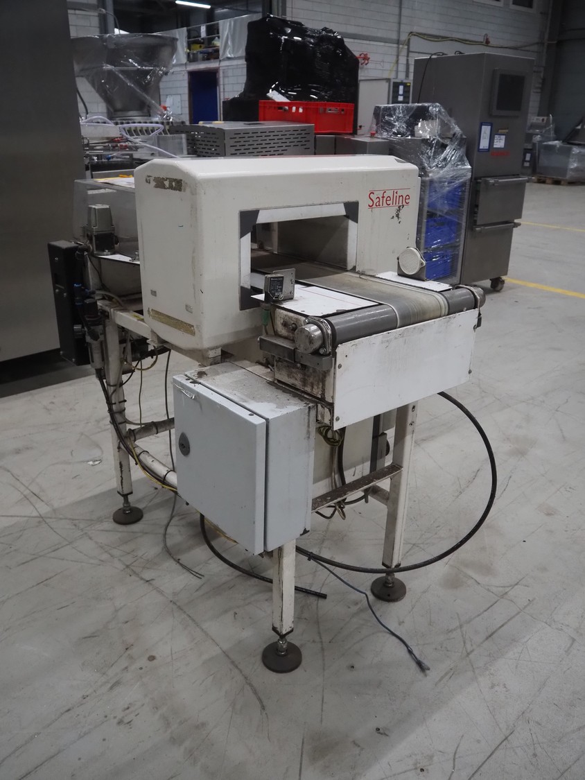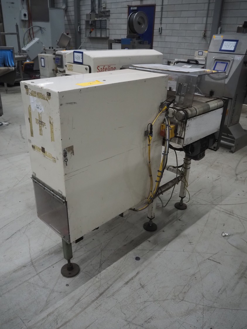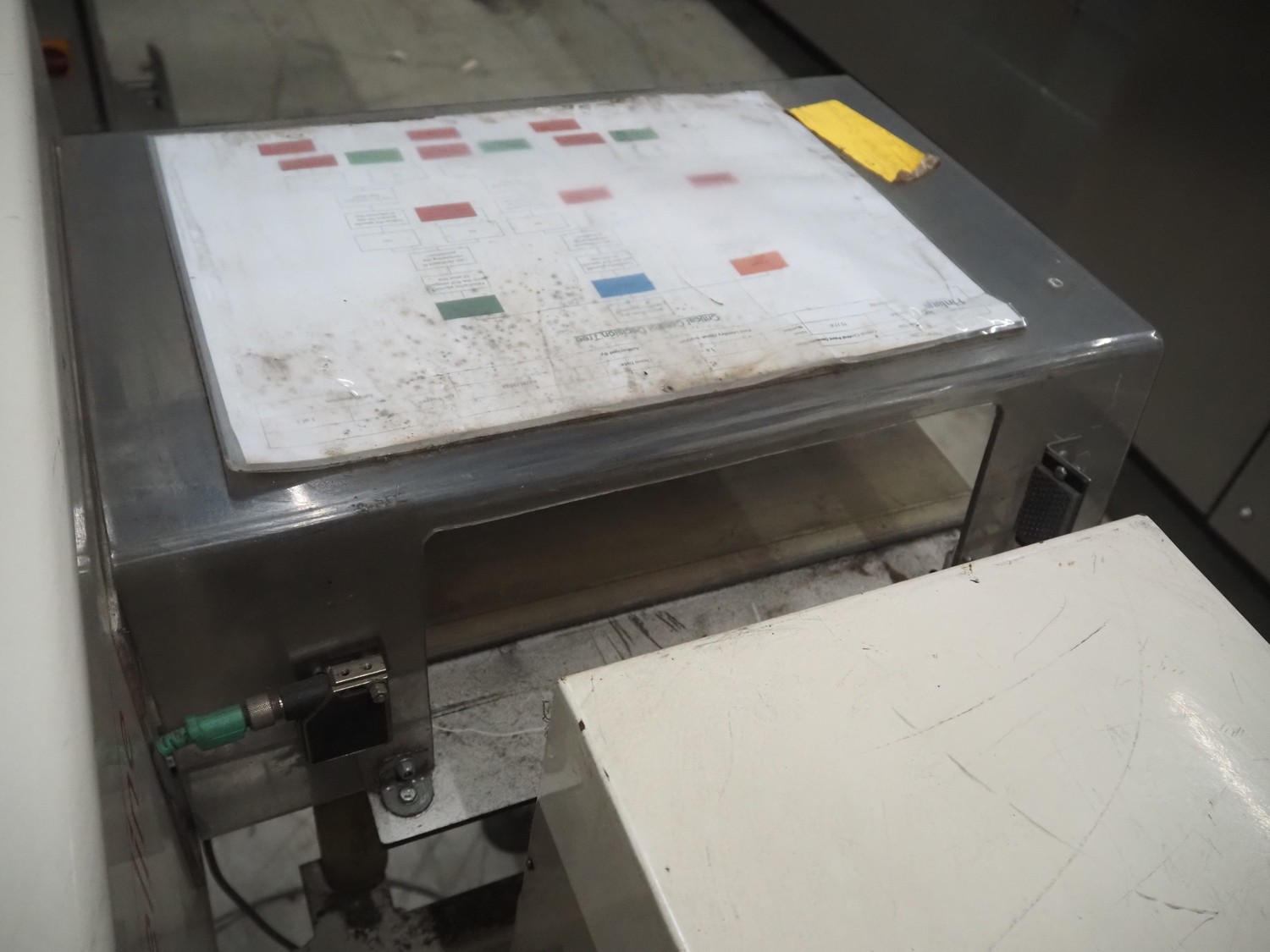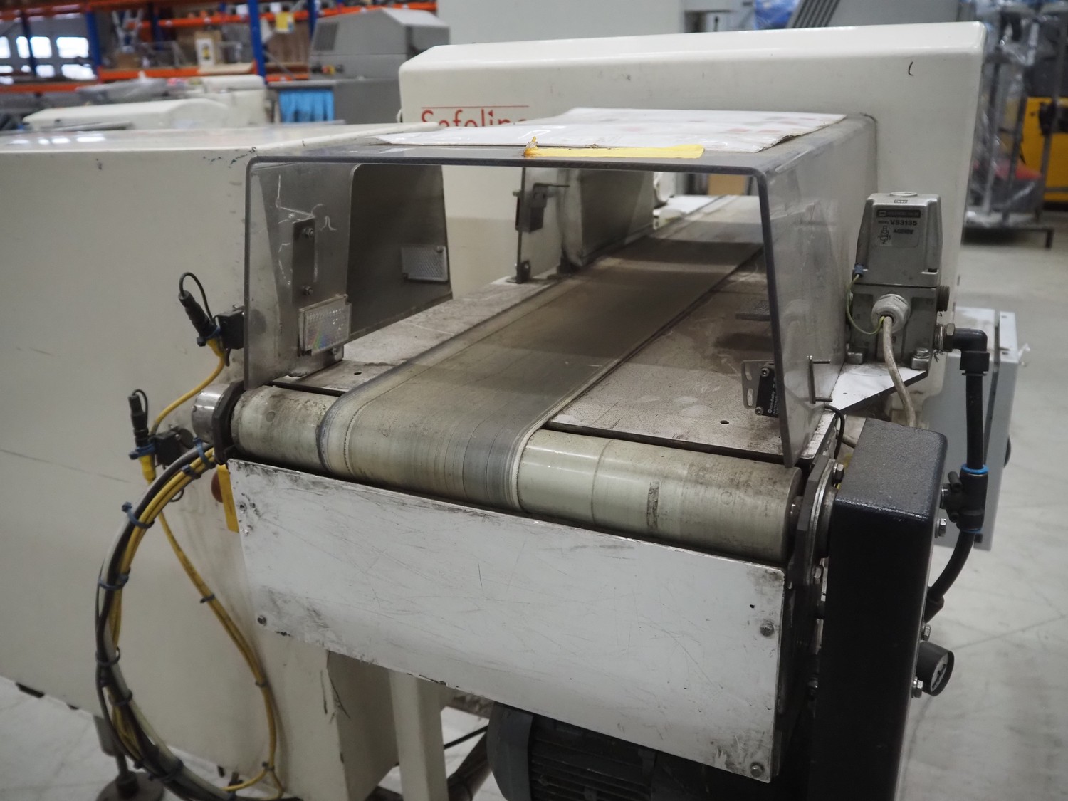 Mettler Toledo Safeline metal detector with rejector, serial number: 20195, plastic belt, belt width: 170 mm, clearance: 305 mm x 135 mm, total dimensions: 1250 mm x 1250 mm x 1200 mm.