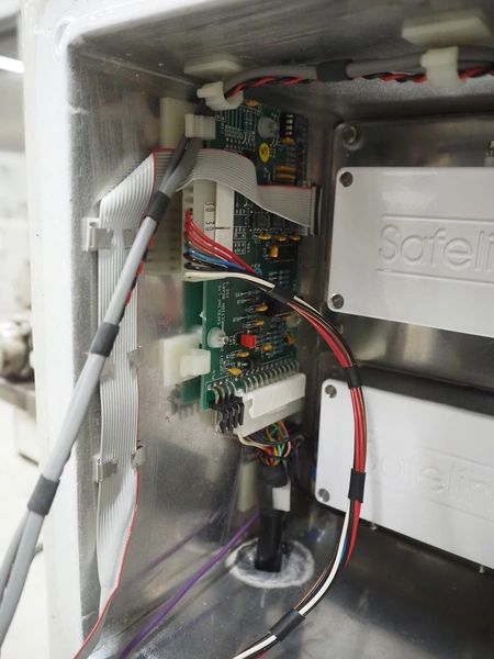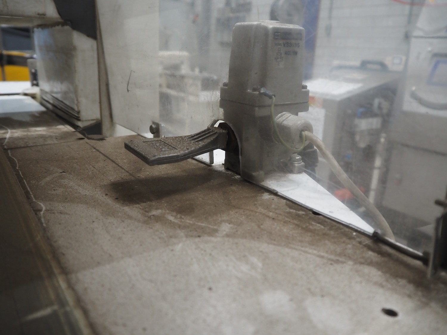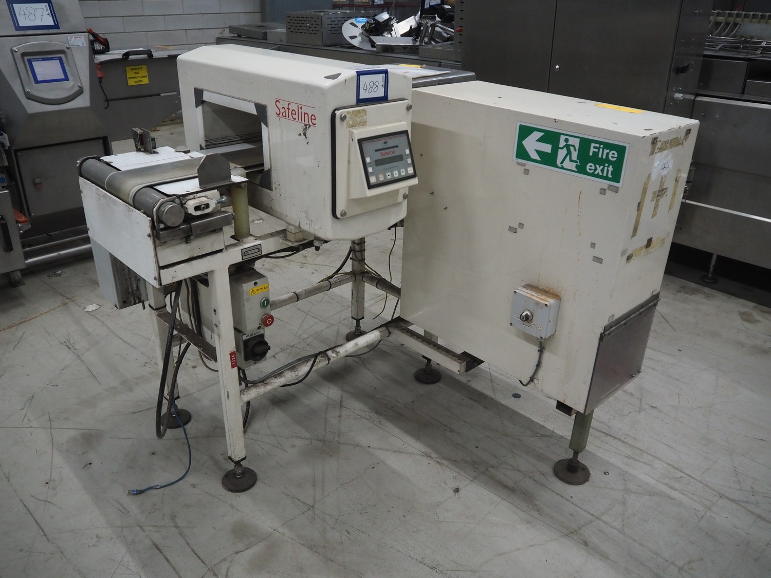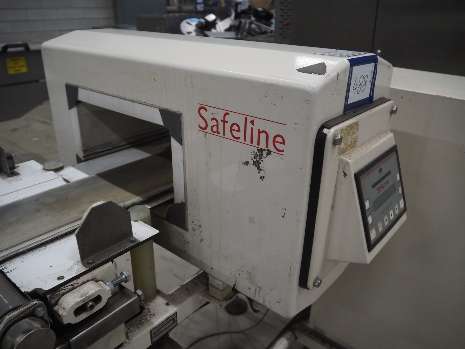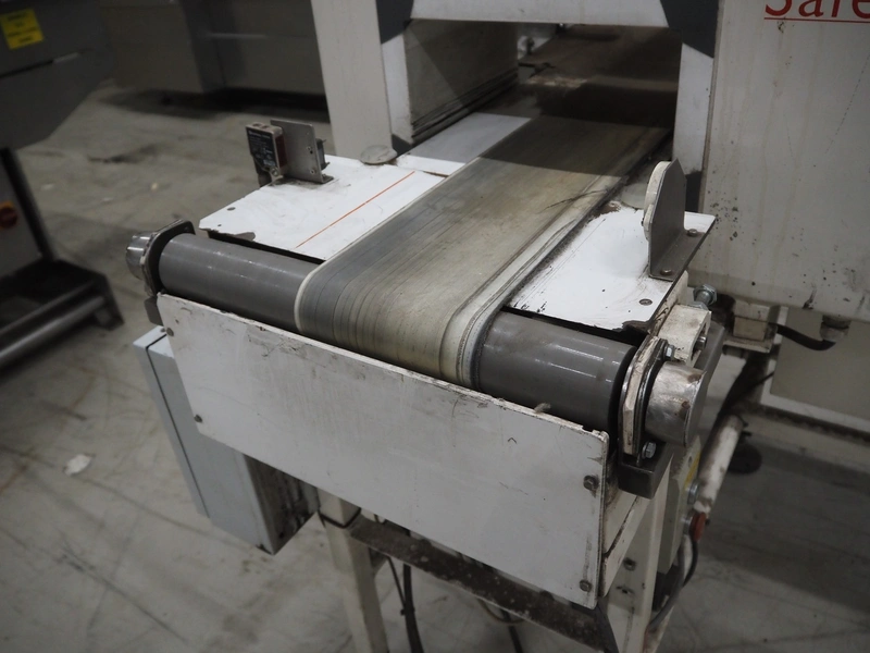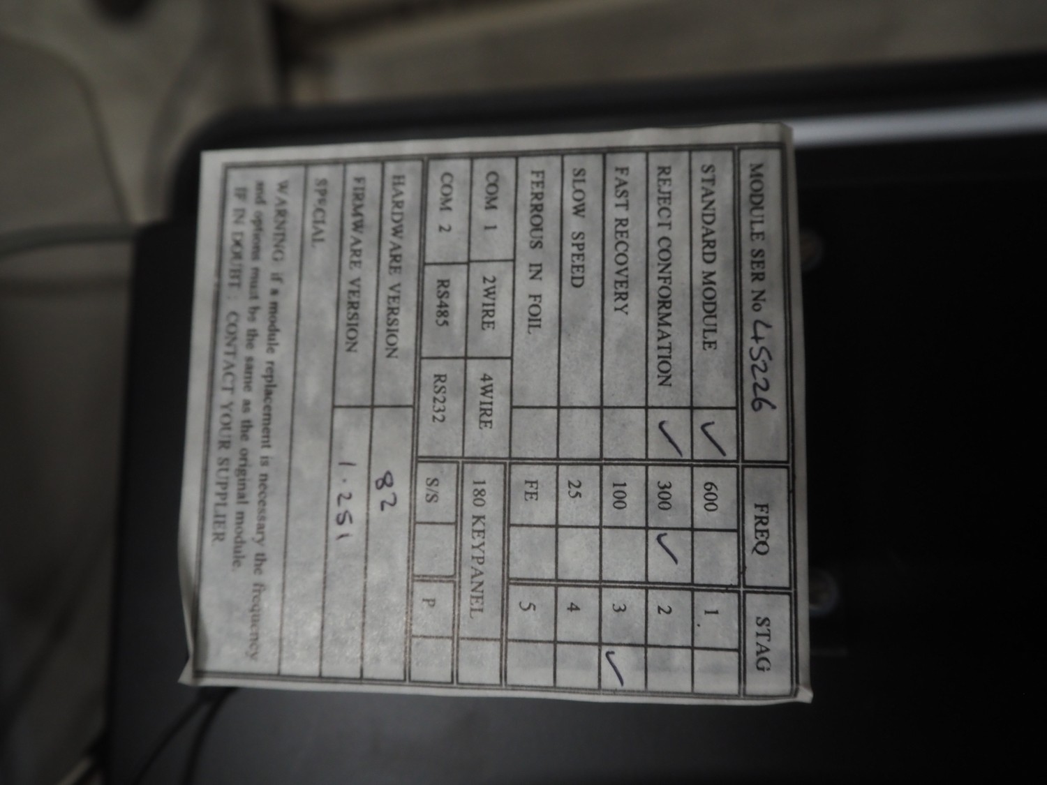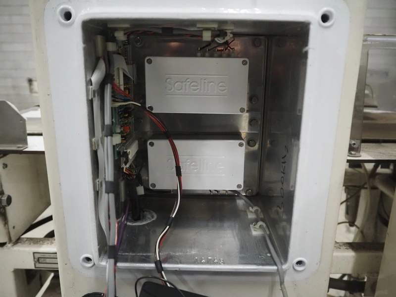 Mettler Toledo Safeline metal detector with rejector, serial number: 20195, plastic belt, belt width: 170 mm, clearance: 305 mm x 135 mm, total dimensions: 1250 mm x 1250 mm x 1200 mm.