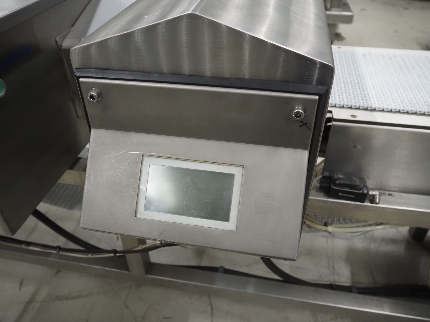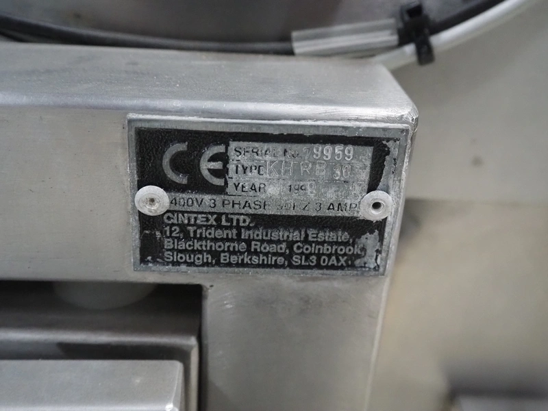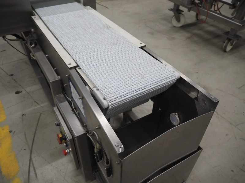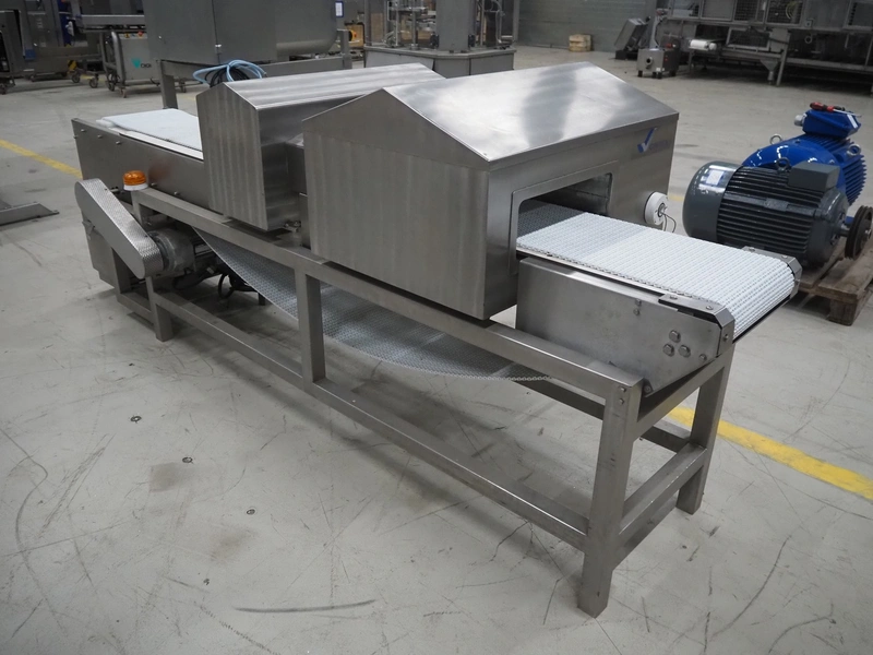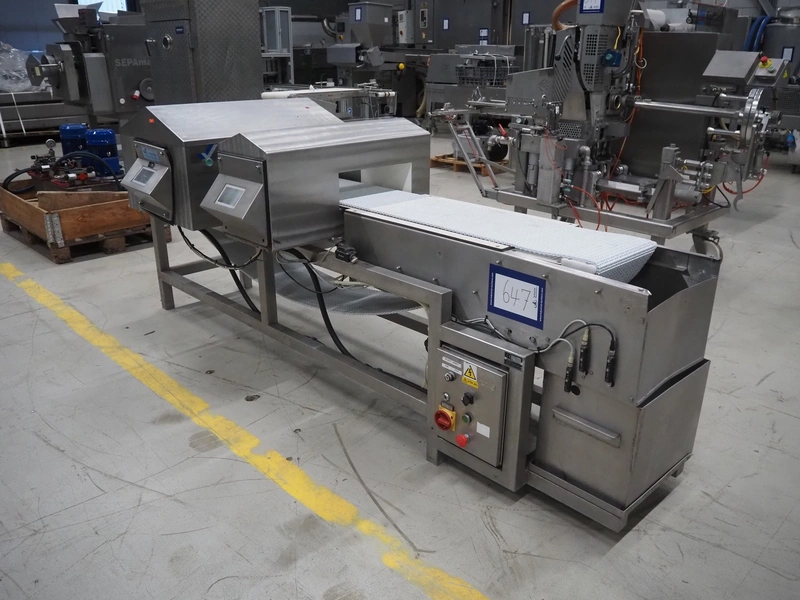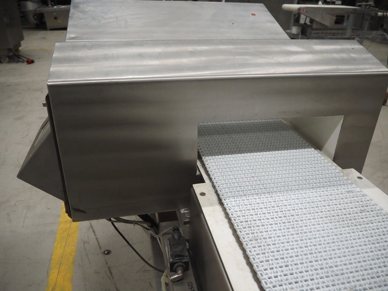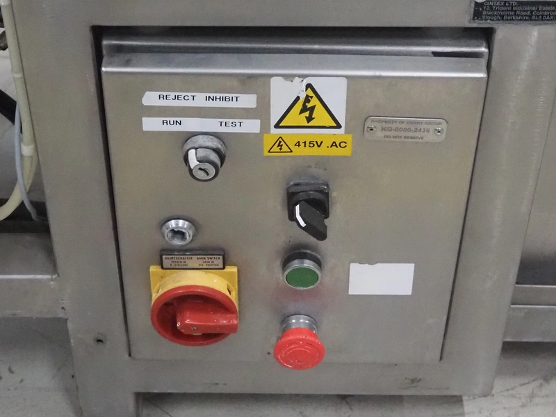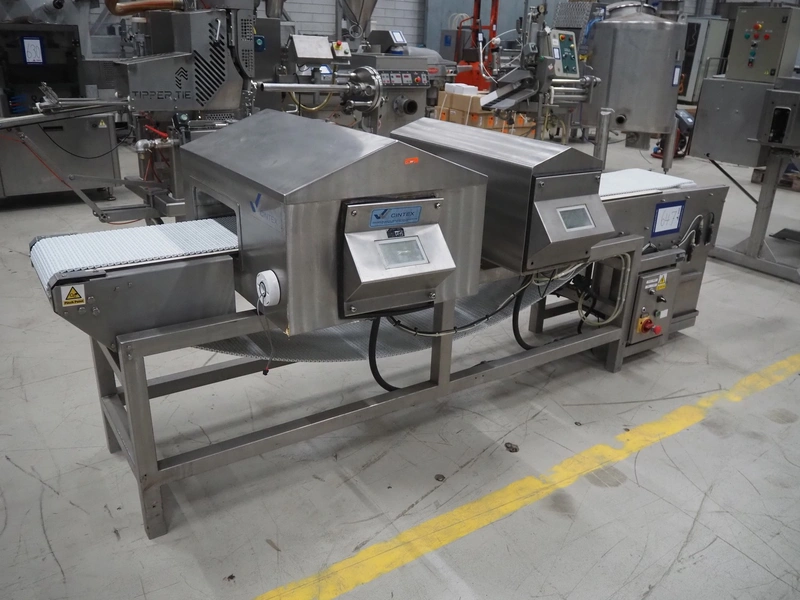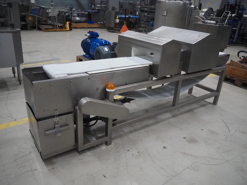 Cintex LTD metal detector with 2 metal detector heads and rejecting belt, type: KHRB30, serial number: 79959, year of construction: 1998, 400 V, 3 Ph, 50 Hz, 3 A, plastic mesh belt, belt width: 300 mm, total dimensions: 2720 mm x 880 mm x 1100 mm. Damaged.