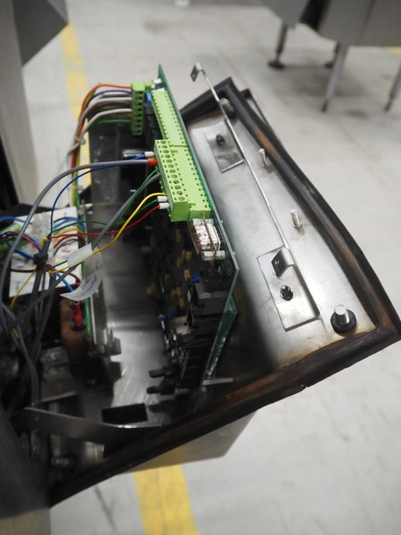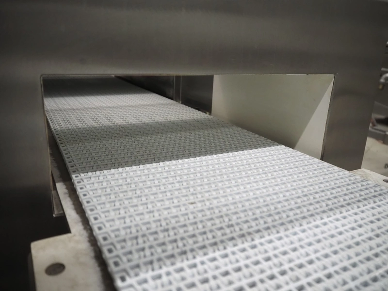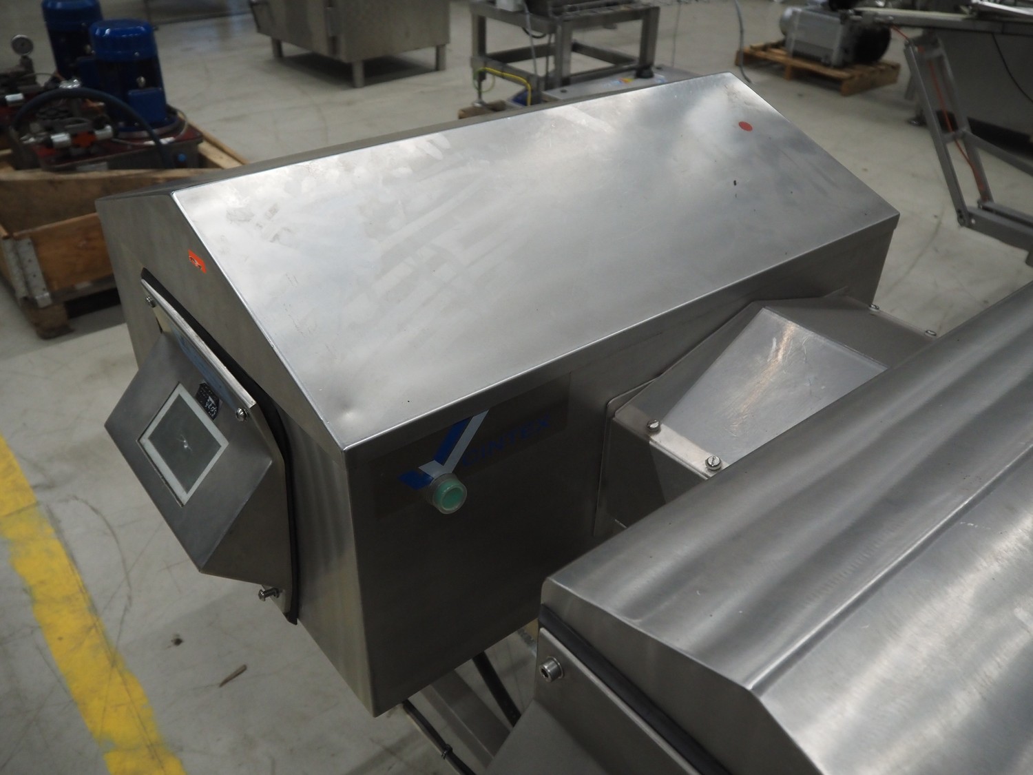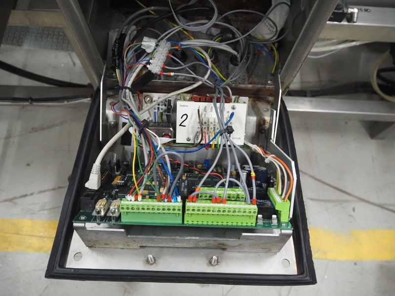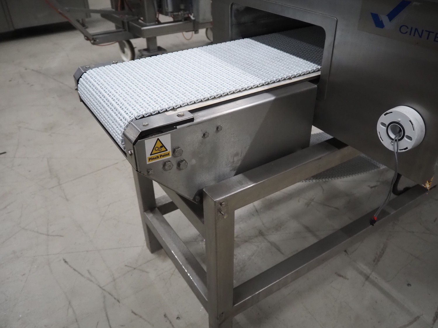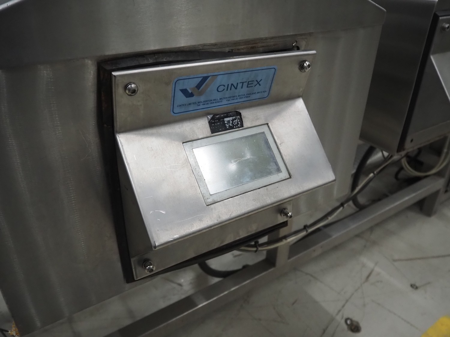 Cintex LTD metal detector with 2 metal detector heads and rejecting belt, type: KHRB30, serial number: 79959, year of construction: 1998, 400 V, 3 Ph, 50 Hz, 3 A, plastic mesh belt, belt width: 300 mm, total dimensions: 2720 mm x 880 mm x 1100 mm. Damaged.
