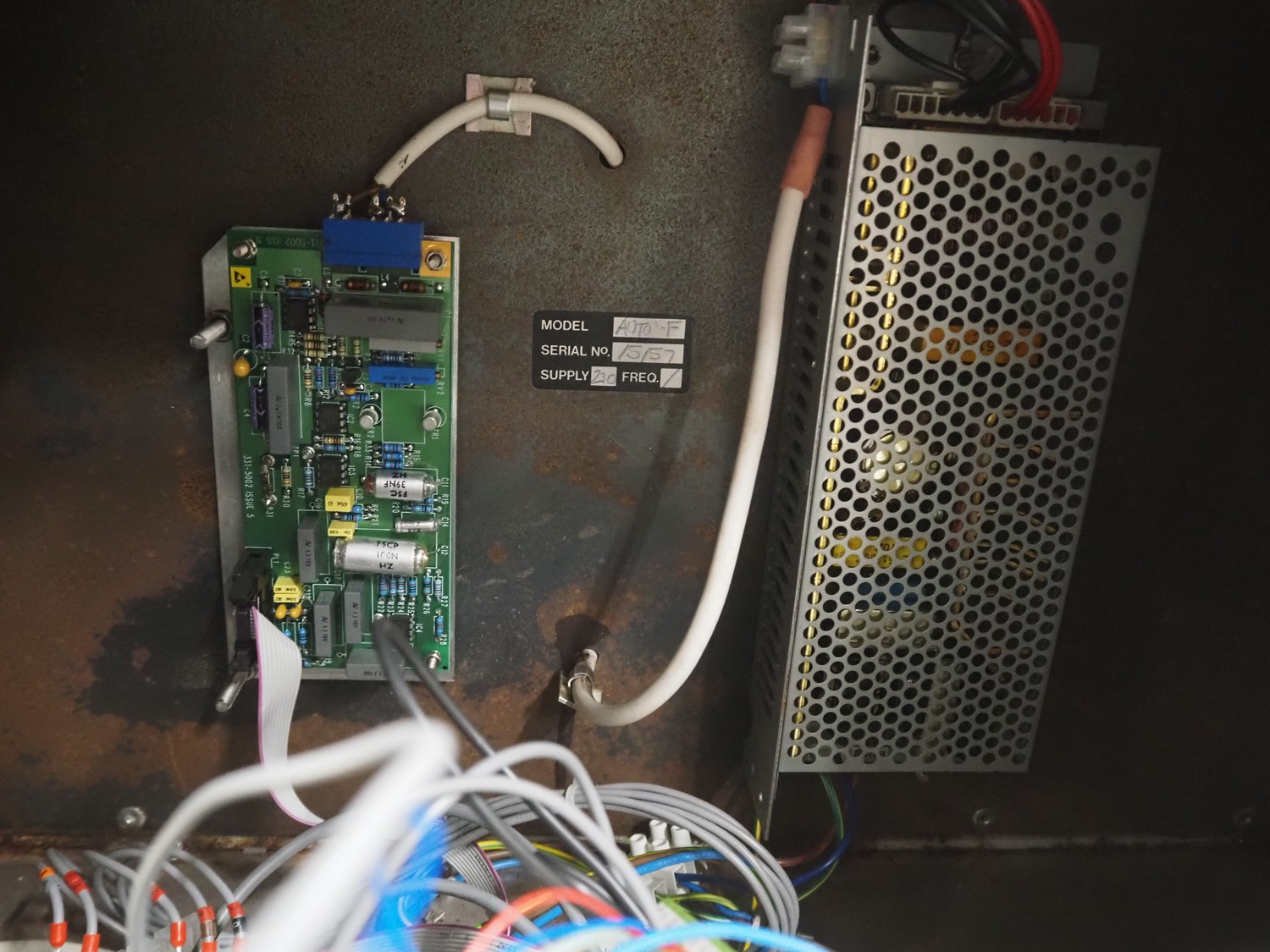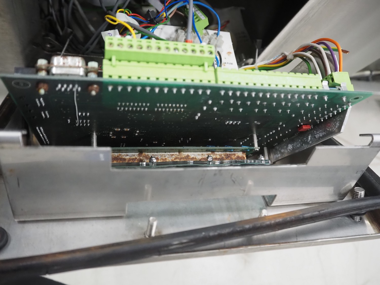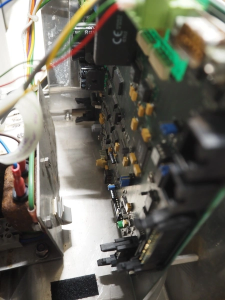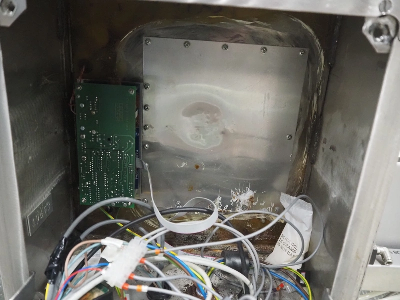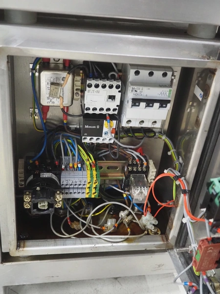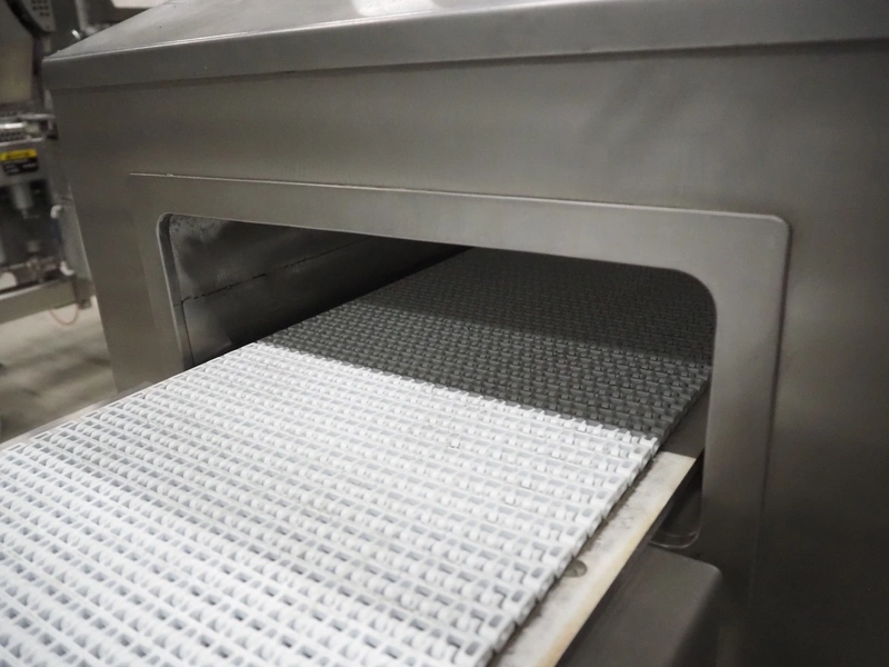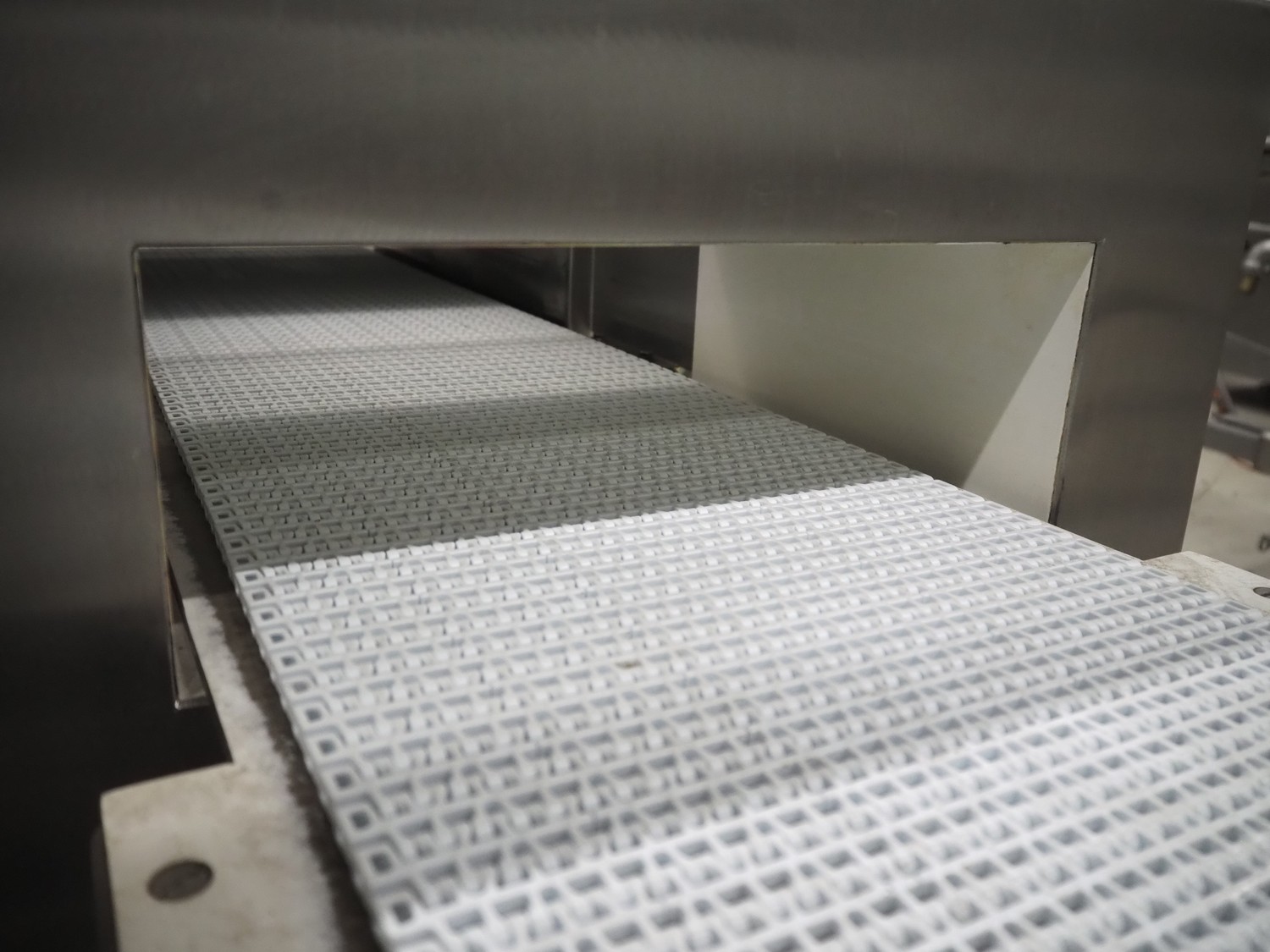 Cintex LTD metal detector with 2 metal detector heads and rejecting belt, type: KHRB30, serial number: 79959, year of construction: 1998, 400 V, 3 Ph, 50 Hz, 3 A, plastic mesh belt, belt width: 300 mm, total dimensions: 2720 mm x 880 mm x 1100 mm. Damaged.