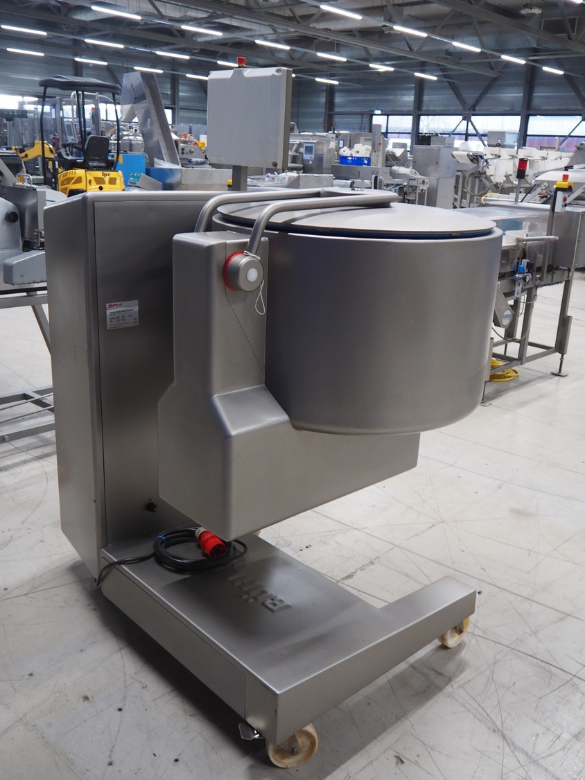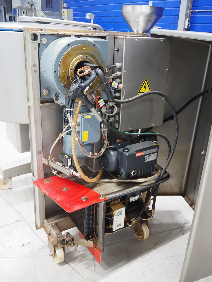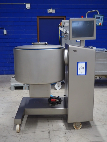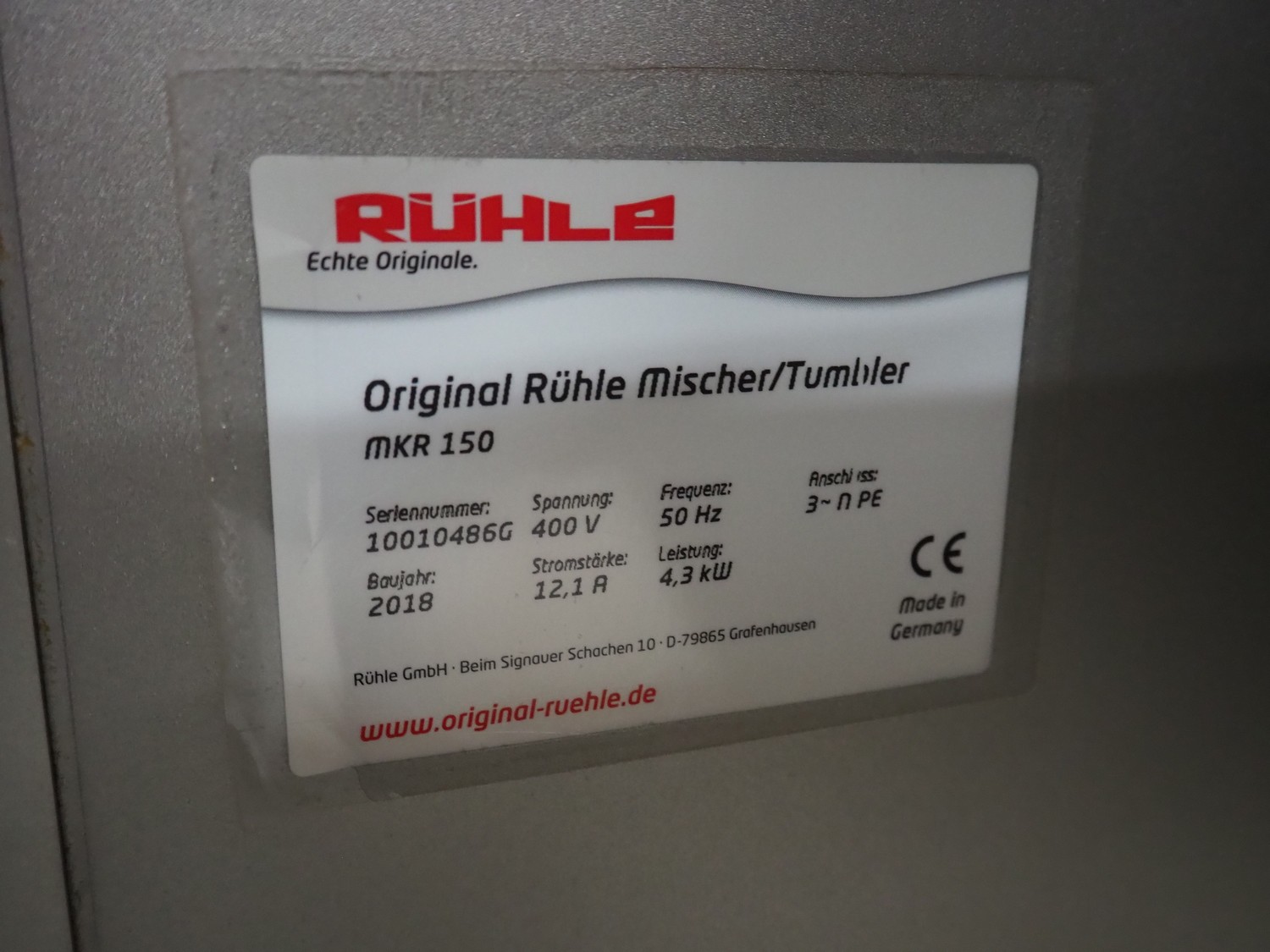 Rühle mobile tiltable cooled vacuum mixer, type: MKR150, serial number: 10010486G, year of construction: 2018, 400 V, 3 Ph, 50 Hz, 12.1 A, 4.3 kW, volume: 150 liter, Busch vacuum pump, type: KC 0010 E 3Z0, capacity: 12 m³ per hour, dimensions: 1000 mm x 1200 mm x 1750 mm.
