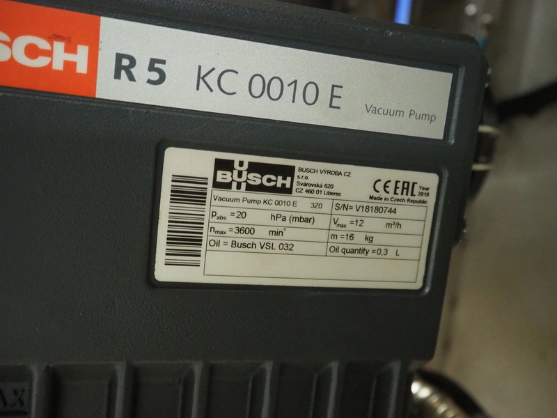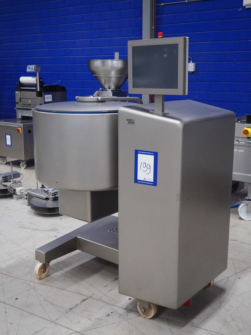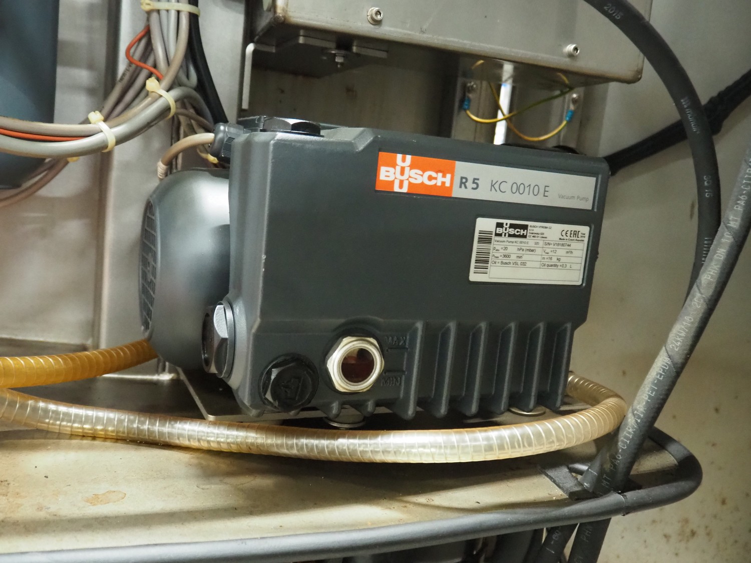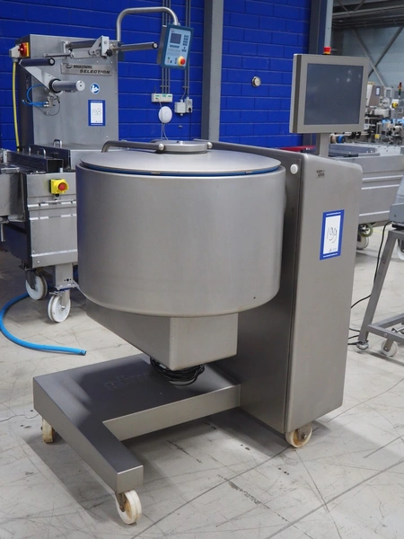 Rühle mobile tiltable cooled vacuum mixer, type: MKR150, serial number: 10010486G, year of construction: 2018, 400 V, 3 Ph, 50 Hz, 12.1 A, 4.3 kW, volume: 150 liter, Busch vacuum pump, type: KC 0010 E 3Z0, capacity: 12 m³ per hour, dimensions: 1000 mm x 1200 mm x 1750 mm.
