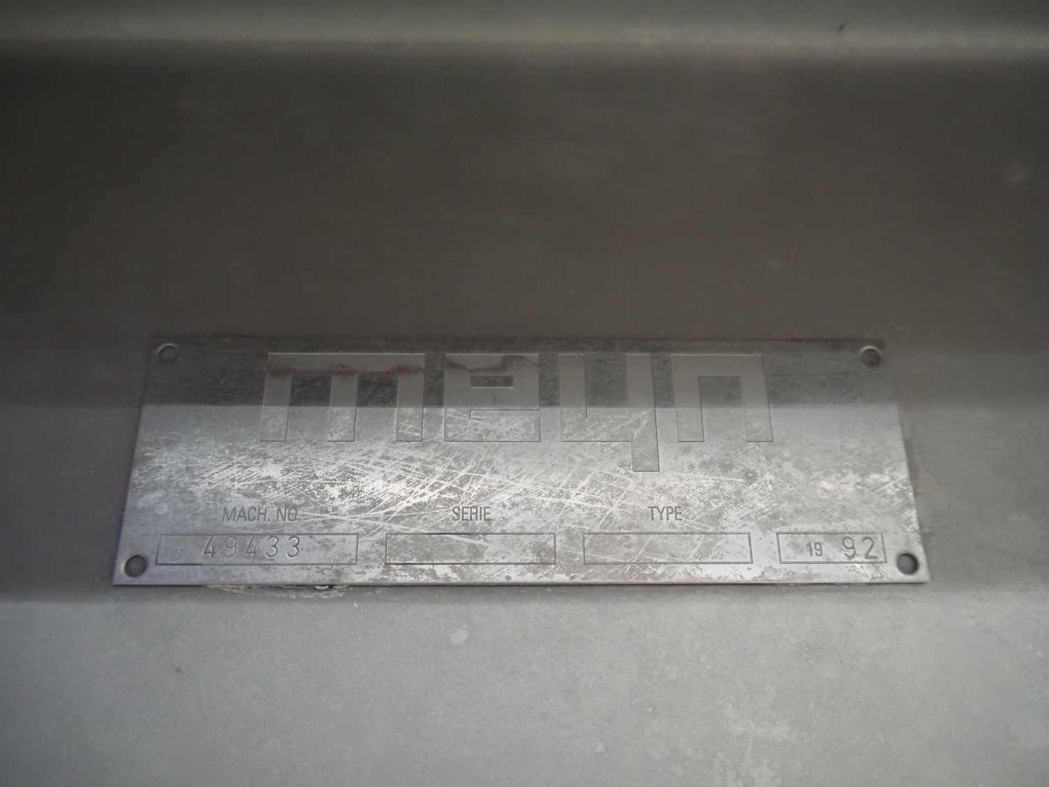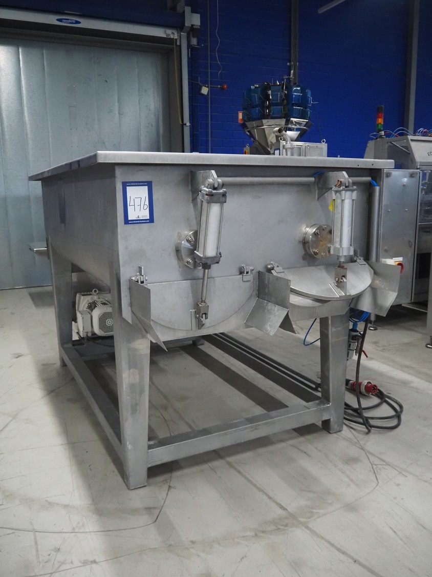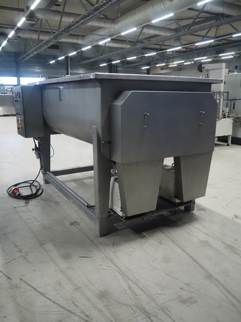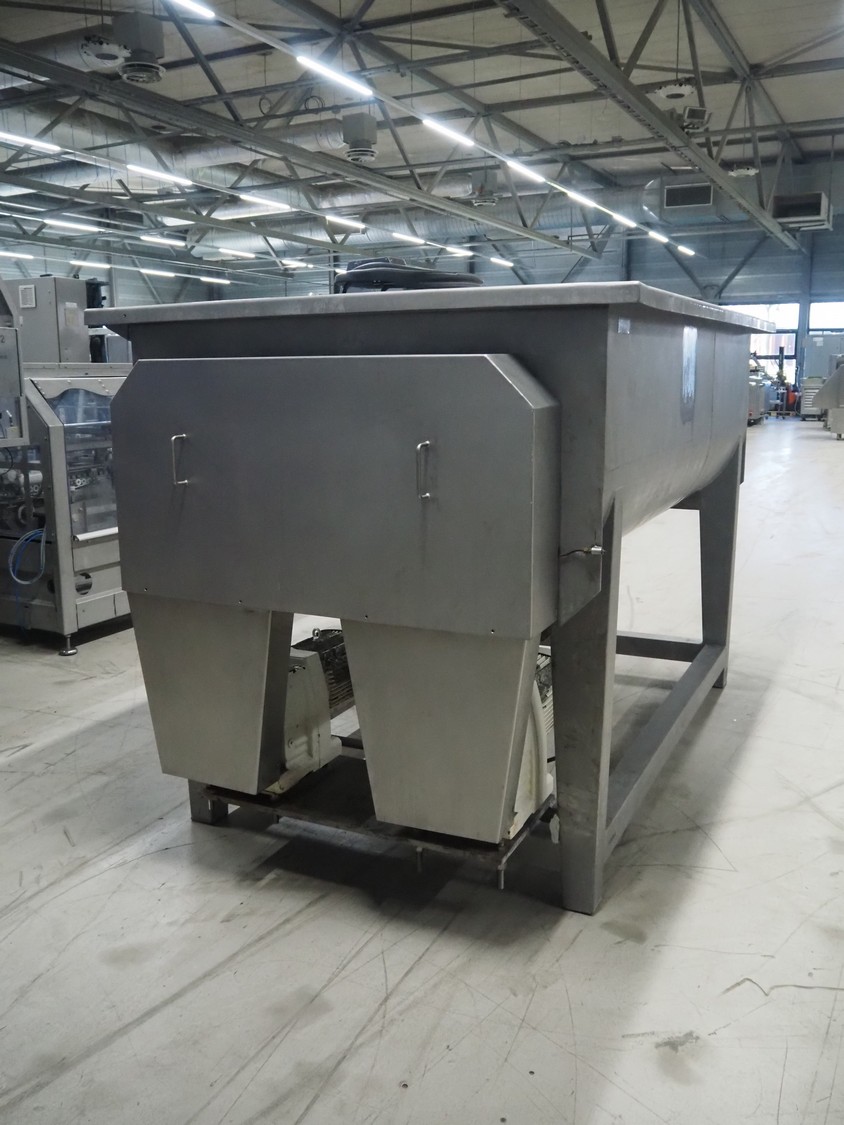 Meyn double shaft paddle mixer on weighing cells, machine number: 49433, year of construction: 1992, inside dimensions: 2500 mm x 1500 mm x 700 mm, total dimensions: 3100 mm x 1800 mm x 1850 mm.