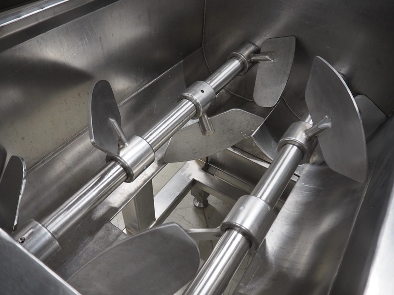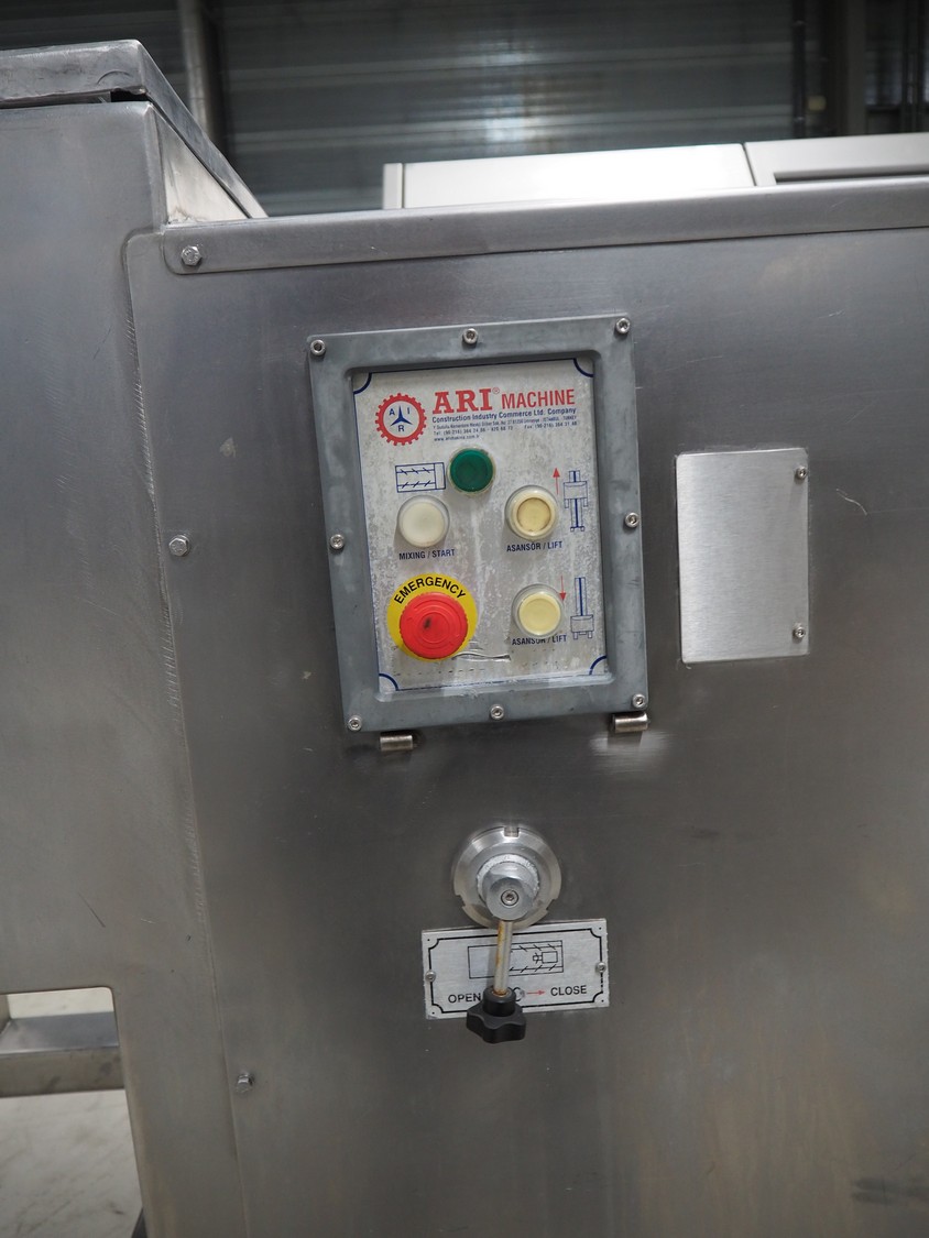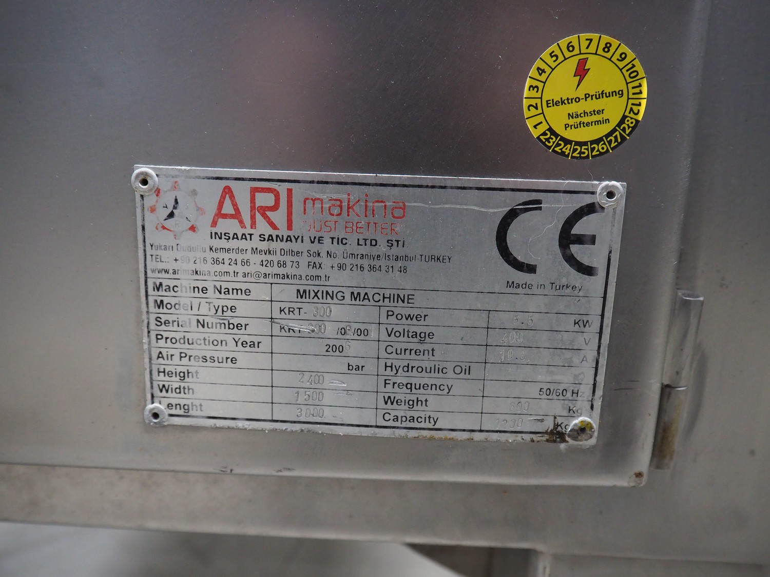 ARI Makina double shaft paddle mixer, model: KRT-300, serial number: KRT-300/06/00, year of construction: 2006, 400 V, 50/60 Hz, 10.3 A, 5.5 kW, volume: 300 litres, capacity: 1200 kg, weight: 600 kg, dimensions: 2150 mm x 800 mm x 1770 mm.