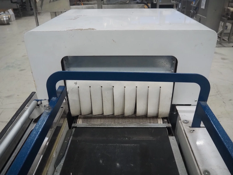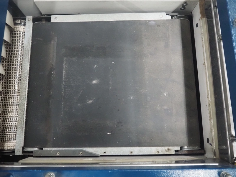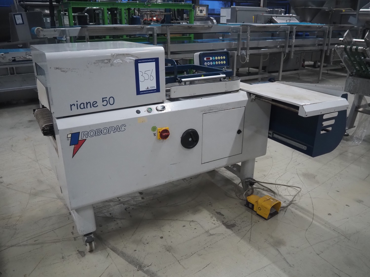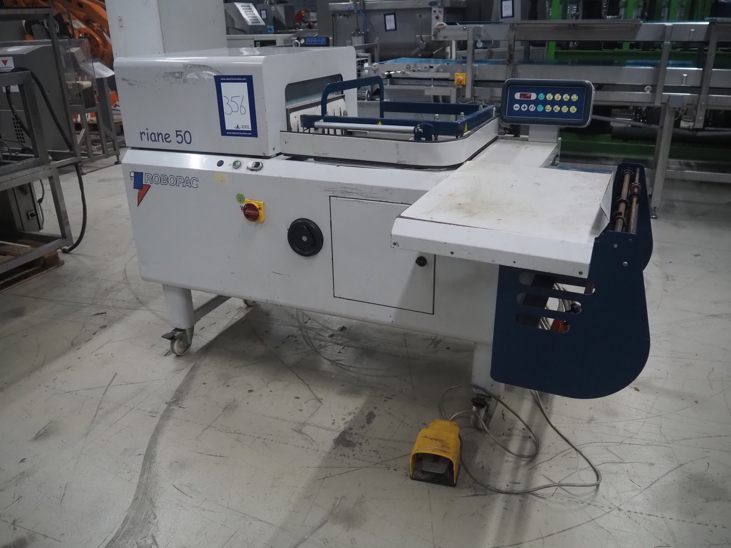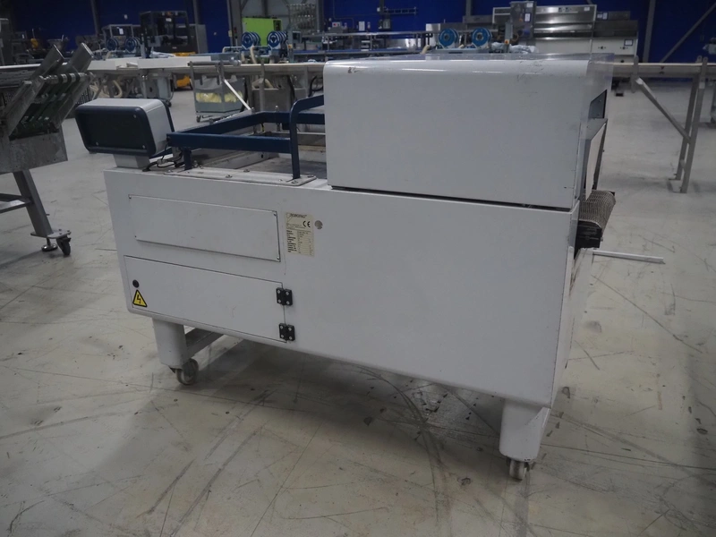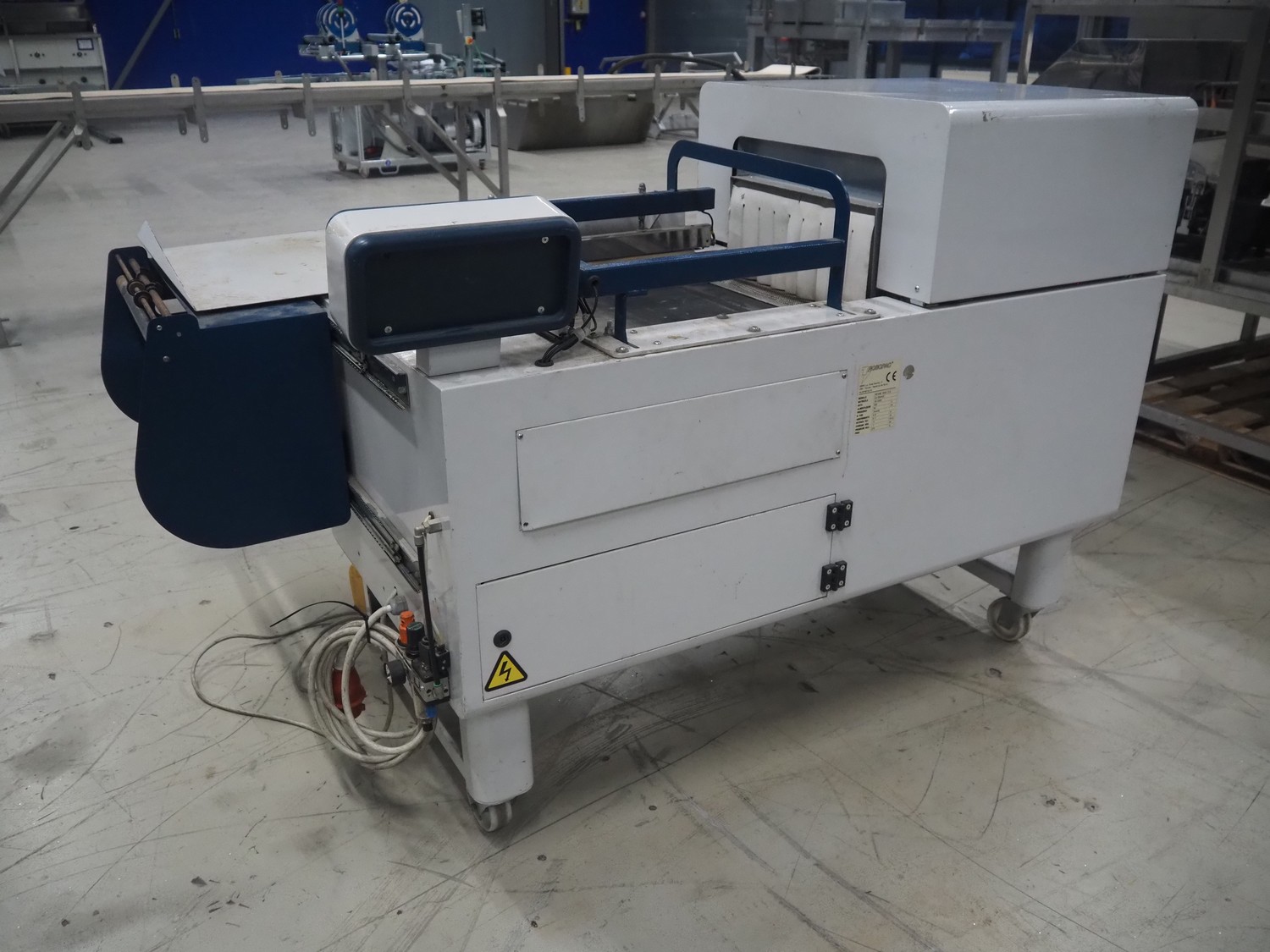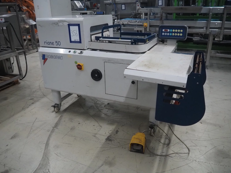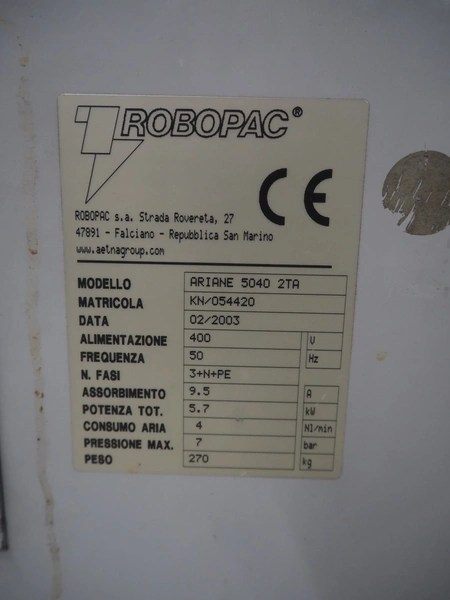 Robopac mobile automatic shrink wrapping machine, model: Ariane 5040 2TA, serial number: KN/054420, year of construction: 02/2003, 400 V, 3 Ph, 50 Hz, 9.5 A, 5.7 kW, seal length: 470 mm and 370 mm, plastic outfeed rollers, roller width: 450 mm, total dimensions: 2200 mm x 2250 mm x 1200 mm.