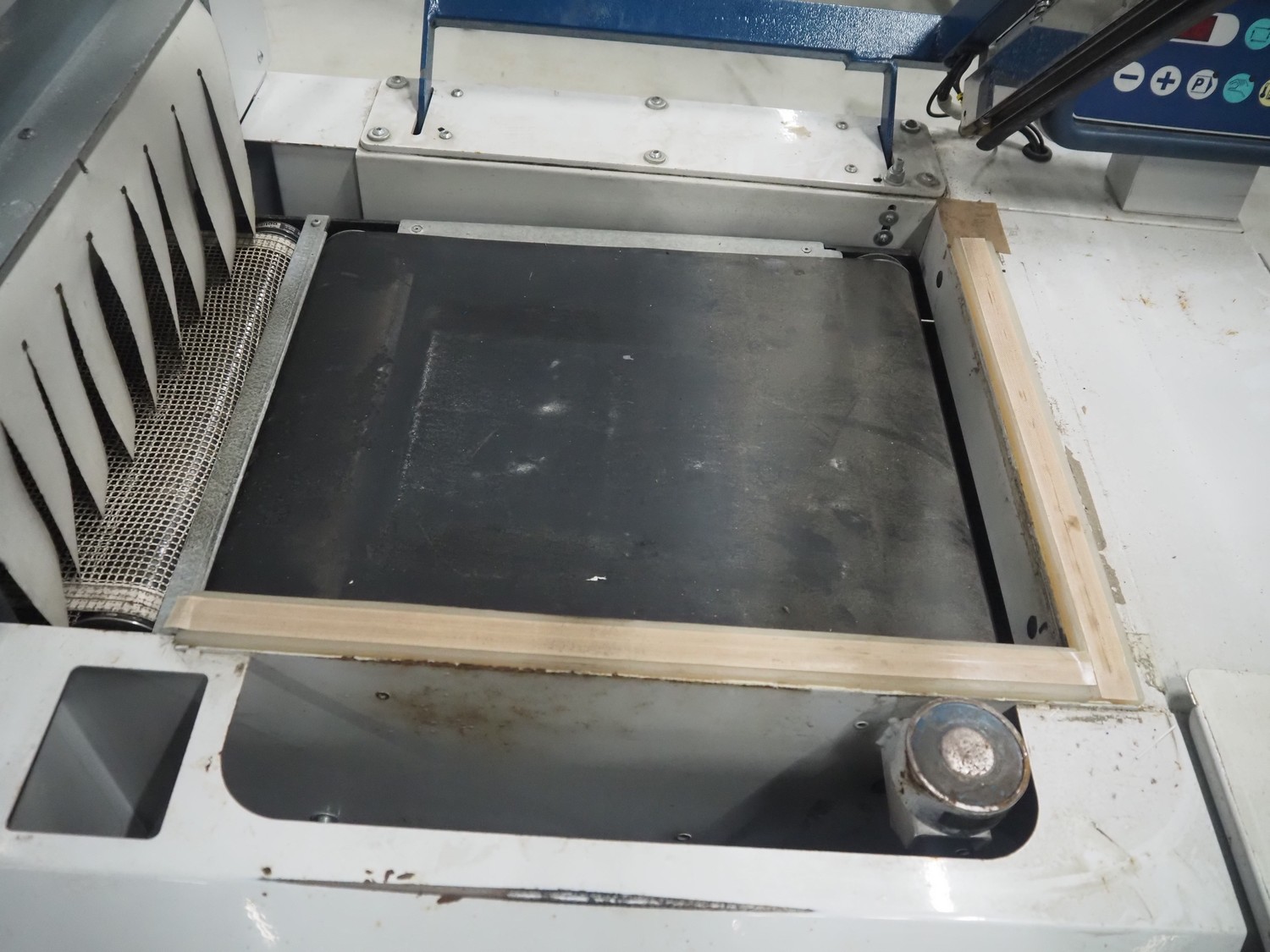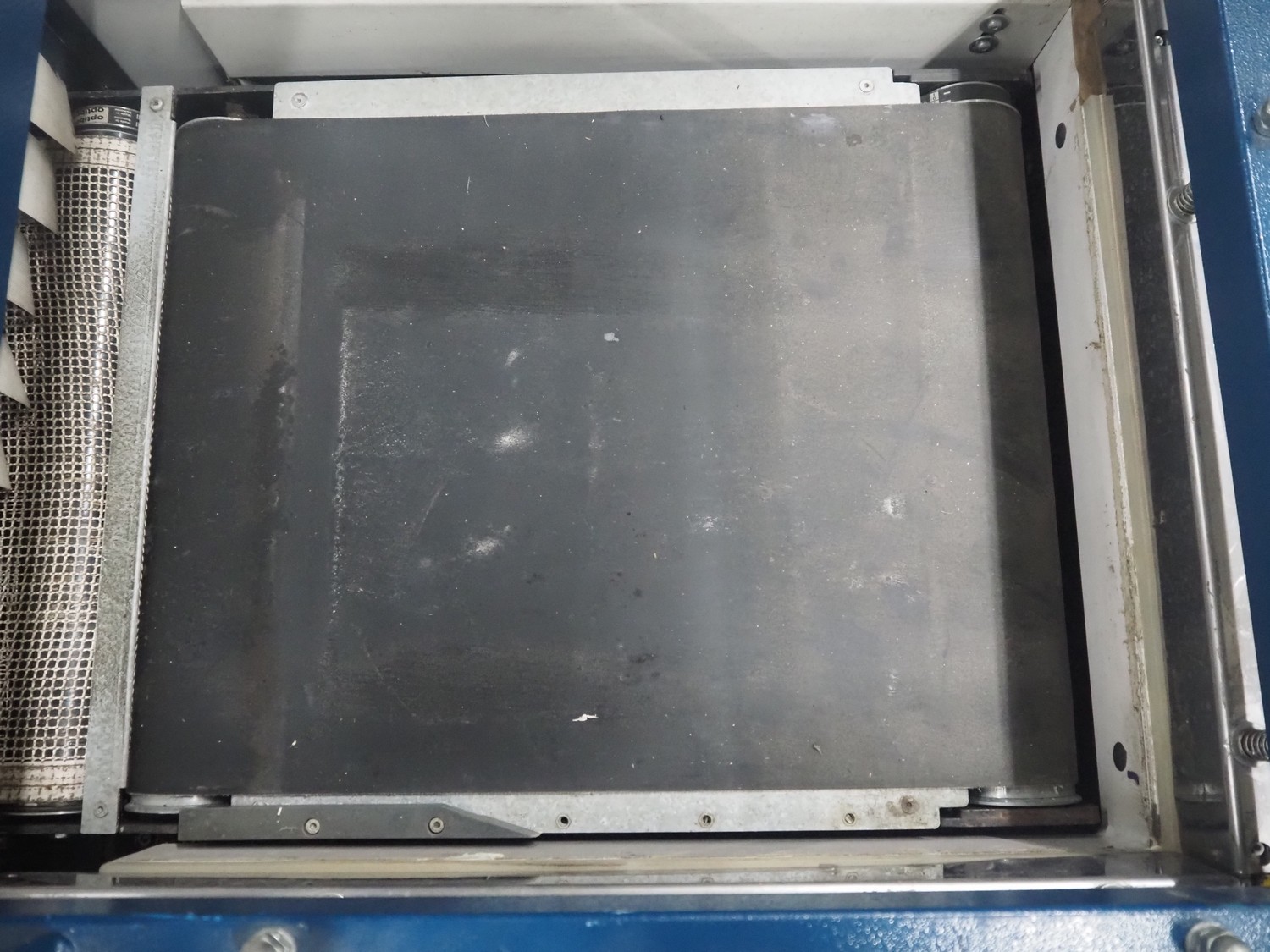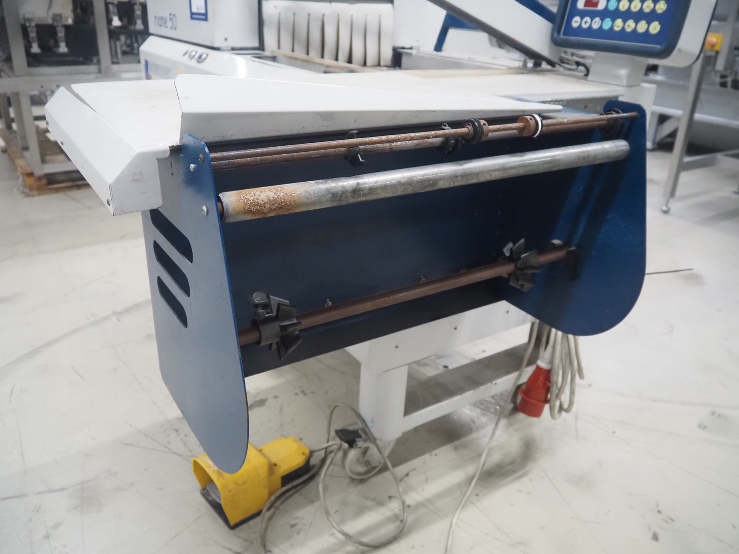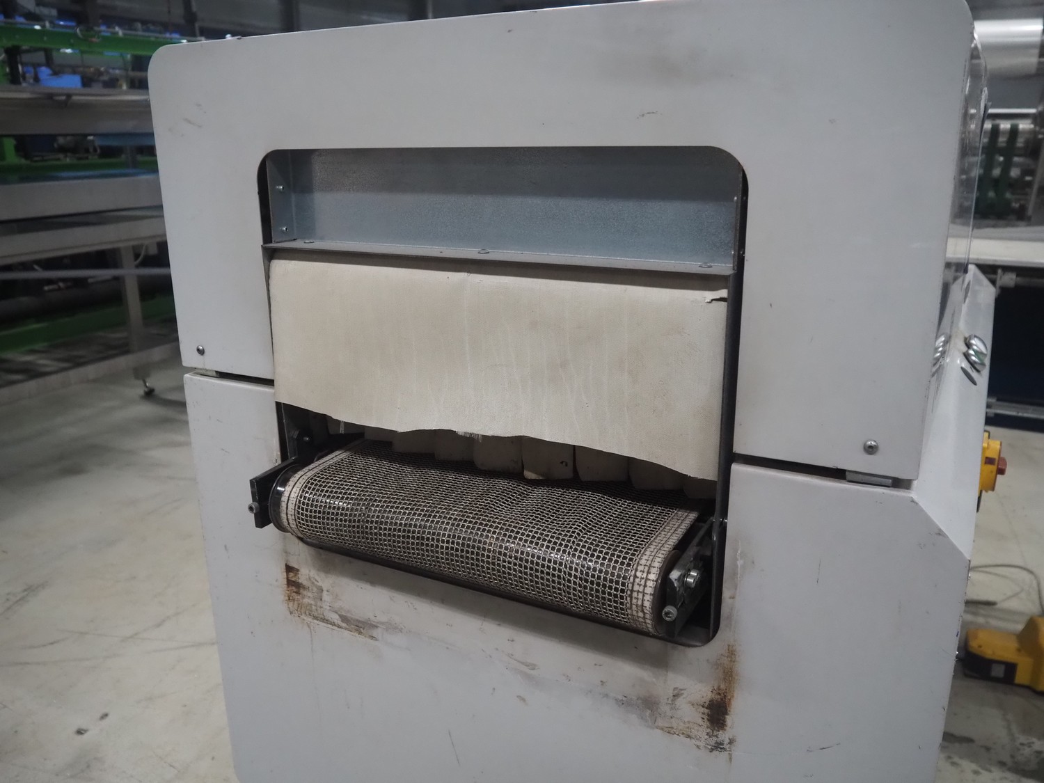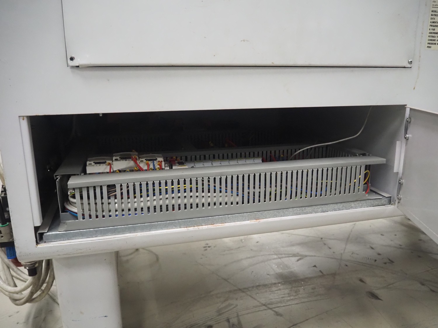 Robopac mobile automatic shrink wrapping machine, model: Ariane 5040 2TA, serial number: KN/054420, year of construction: 02/2003, 400 V, 3 Ph, 50 Hz, 9.5 A, 5.7 kW, seal length: 470 mm and 370 mm, plastic outfeed rollers, roller width: 450 mm, total dimensions: 2200 mm x 2250 mm x 1200 mm.
