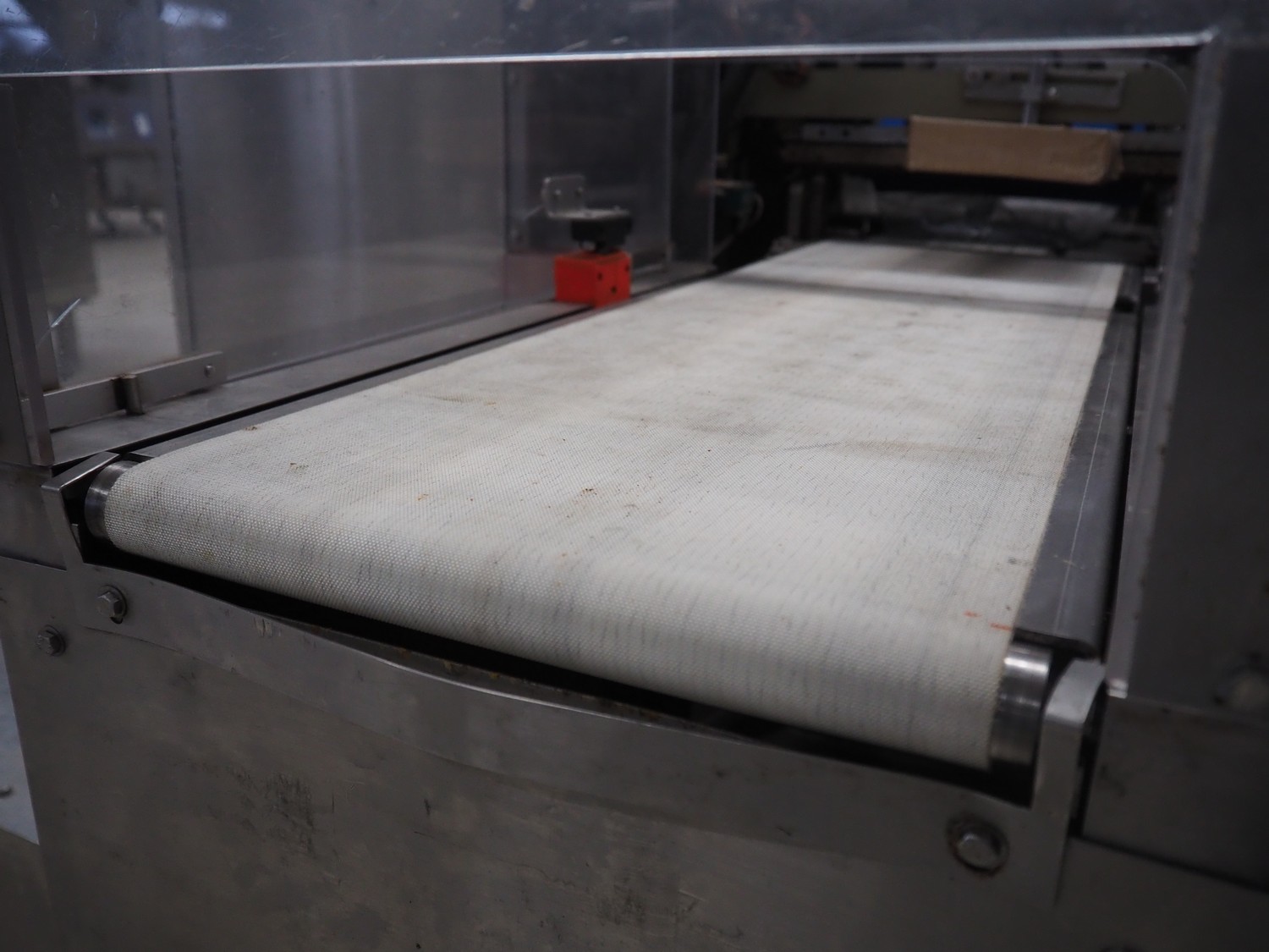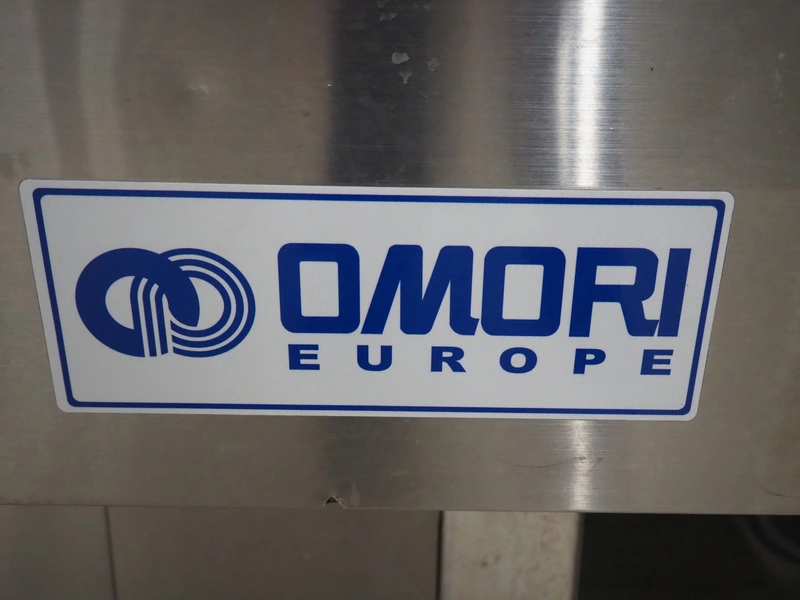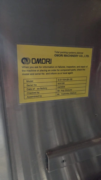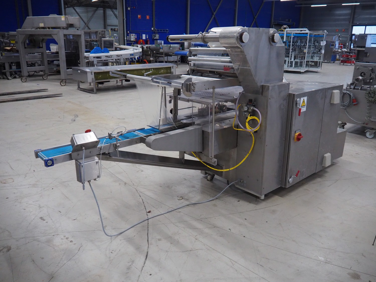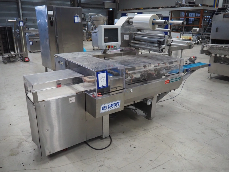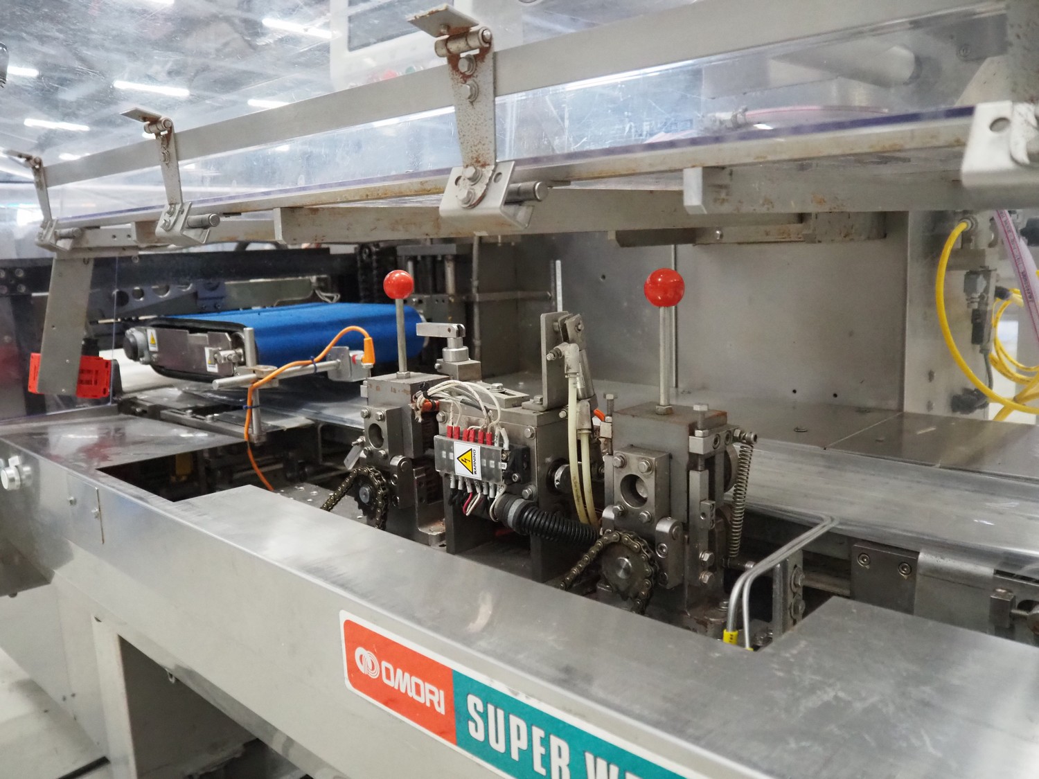 Omori flowpacker, model: S-5115A-BX-3S, serial number: WX100, year of construction: 04/2004, film width: 350 mm, seal width: 400 mm, plastic belt, belt width: 280 mm, total dimensions: 3850 mm x 1200 mm x 1740 mm.