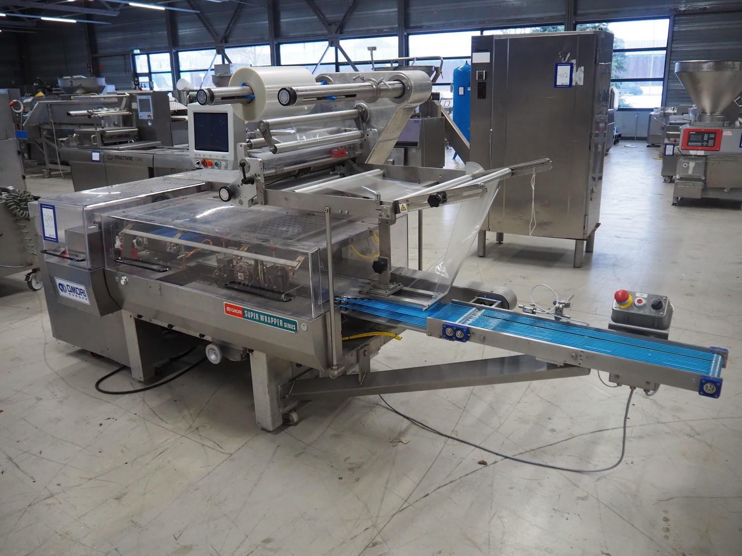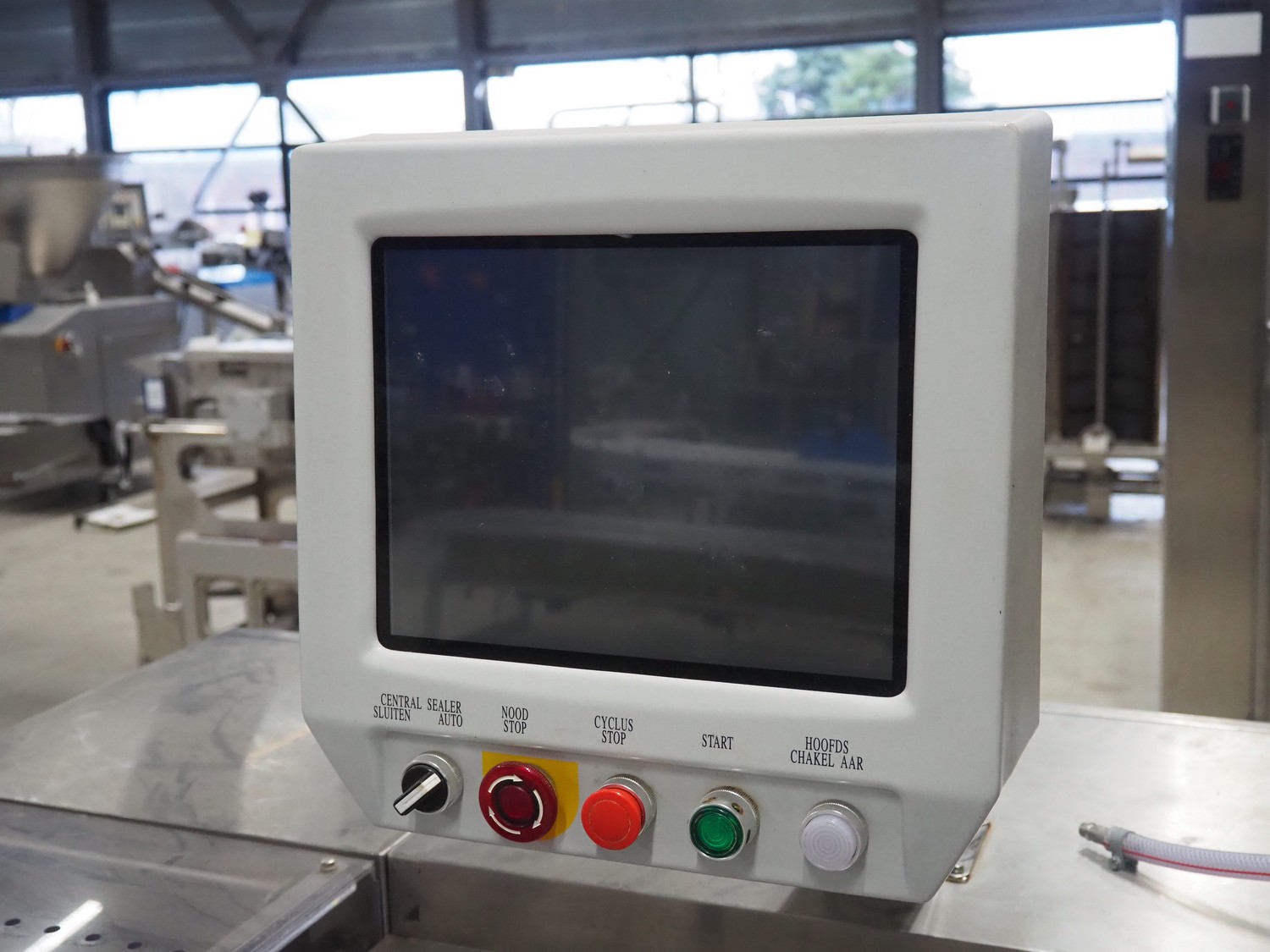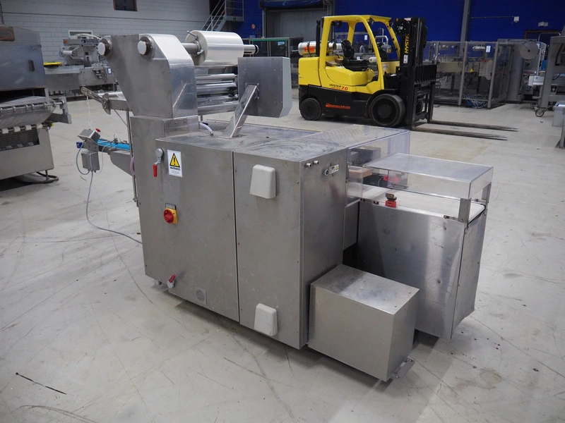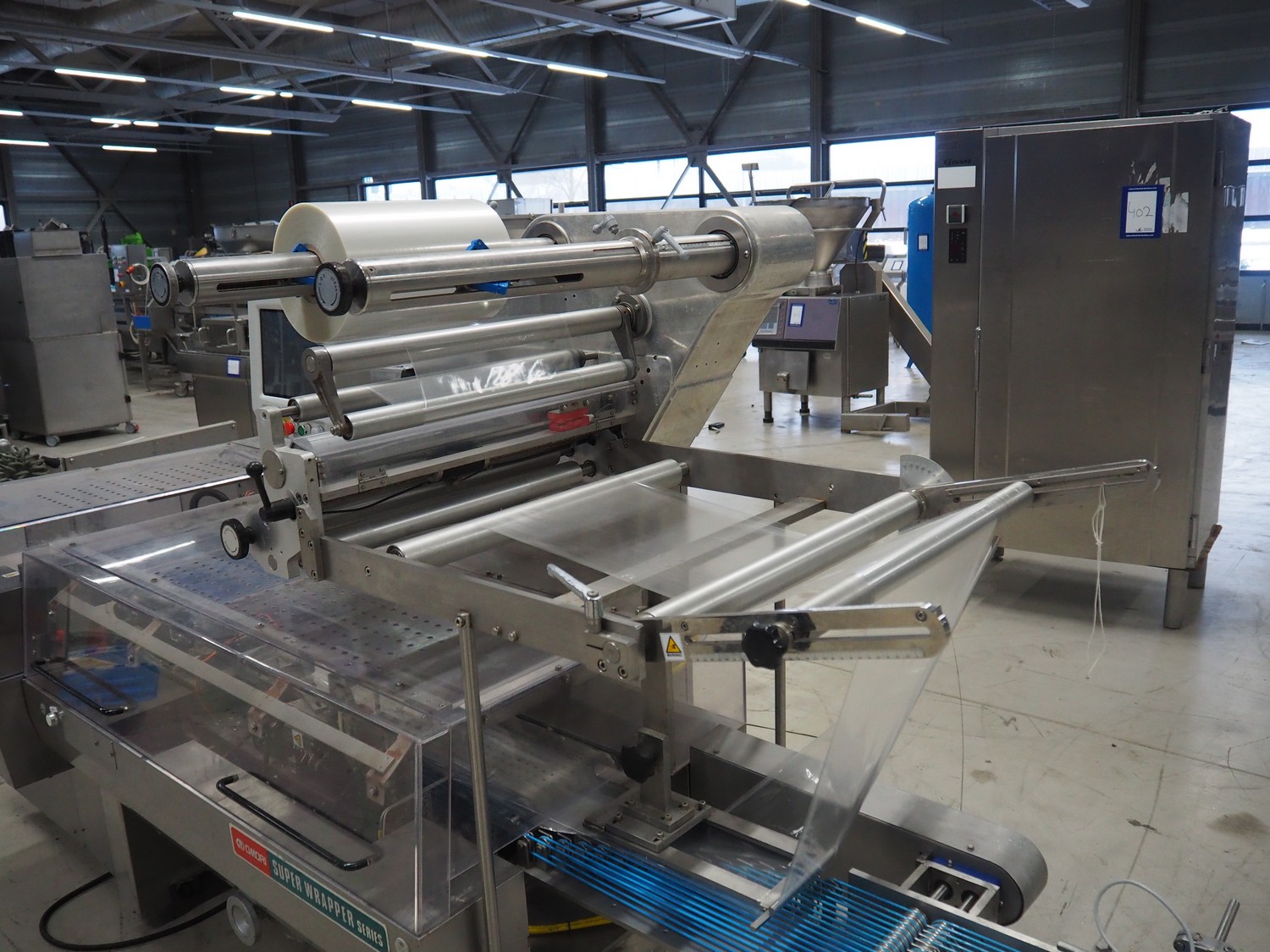 Omori flowpacker, model: S-5115A-BX-3S, serial number: WX100, year of construction: 04/2004, film width: 350 mm, seal width: 400 mm, plastic belt, belt width: 280 mm, total dimensions: 3850 mm x 1200 mm x 1740 mm.