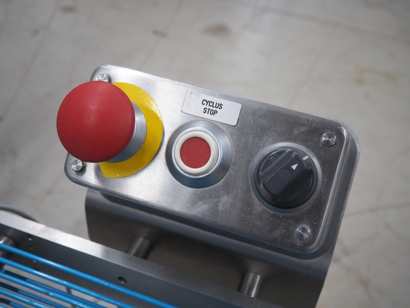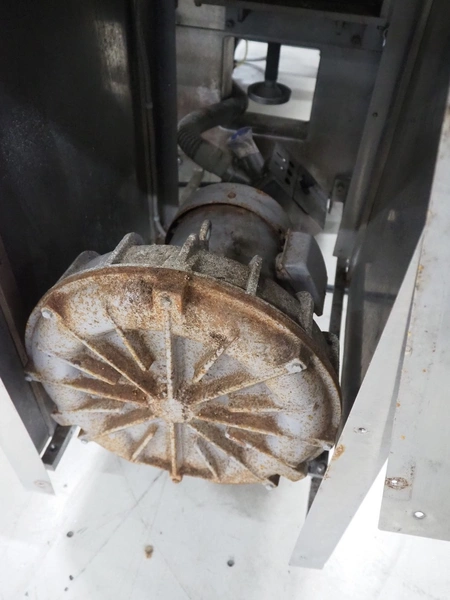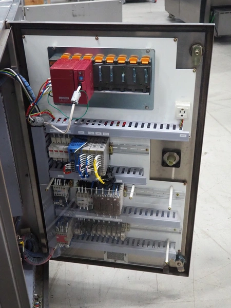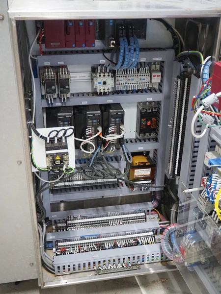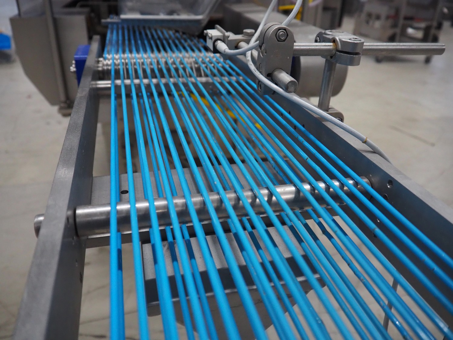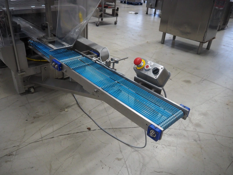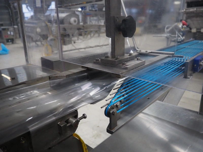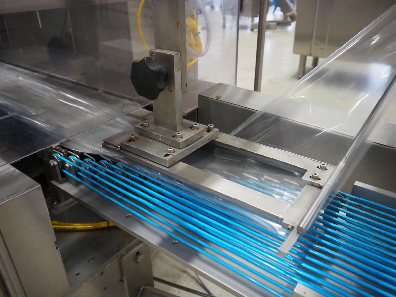 Omori flowpacker, model: S-5115A-BX-3S, serial number: WX100, year of construction: 04/2004, film width: 350 mm, seal width: 400 mm, plastic belt, belt width: 280 mm, total dimensions: 3850 mm x 1200 mm x 1740 mm.