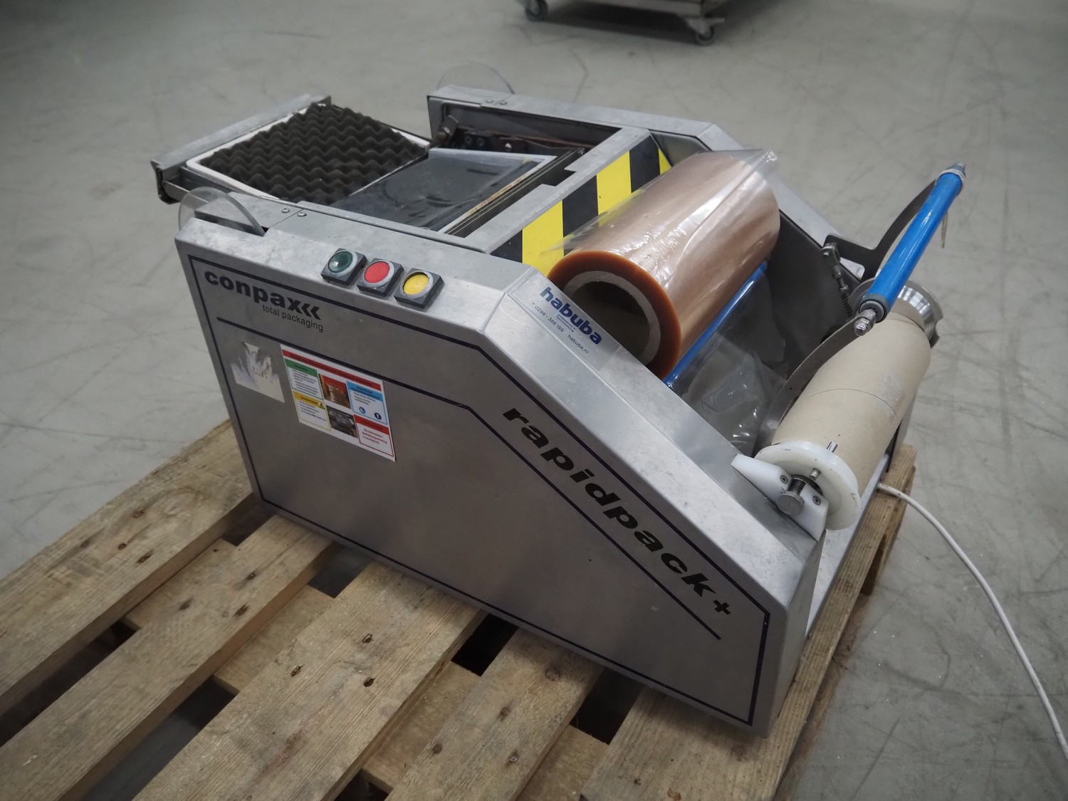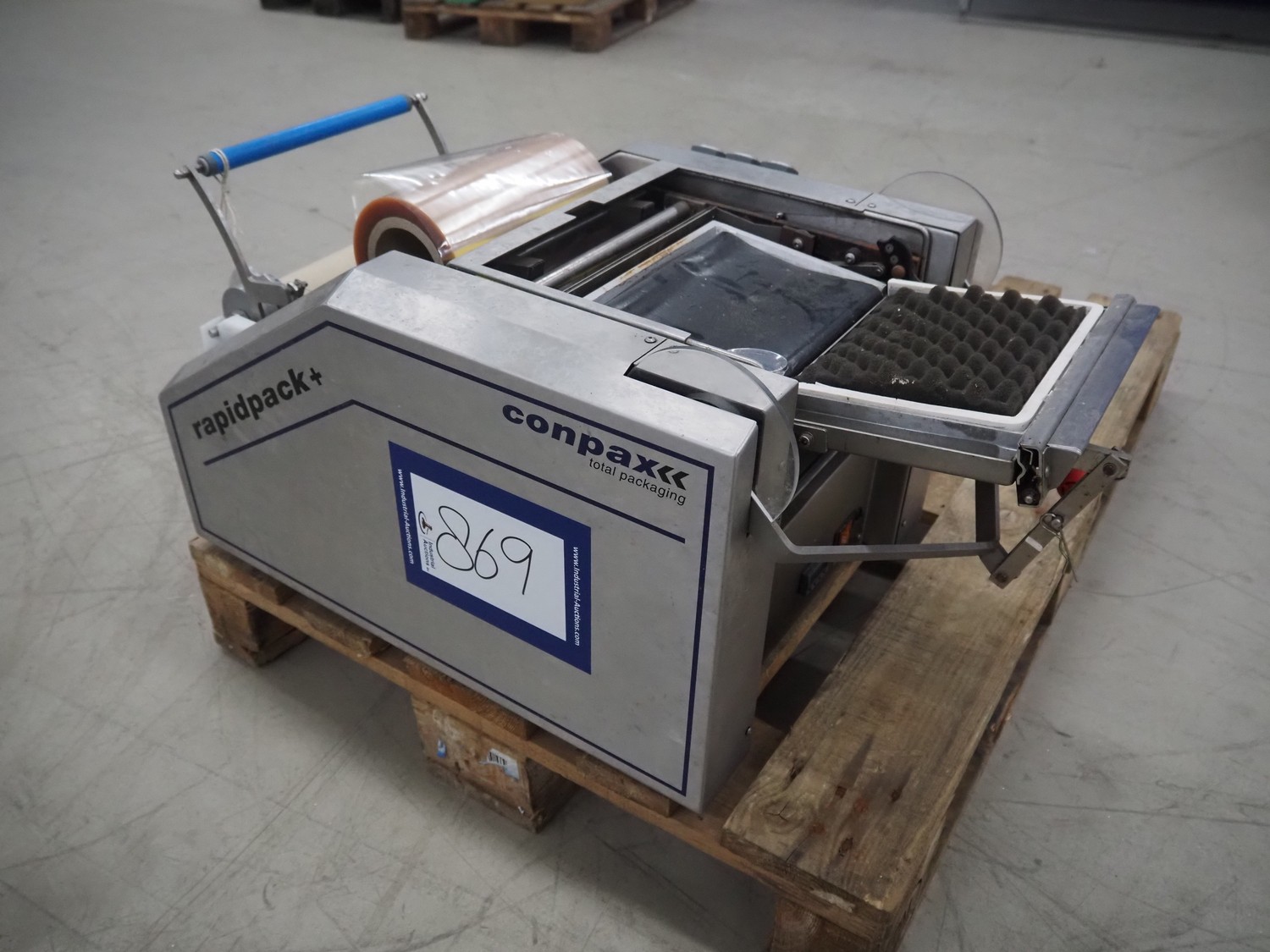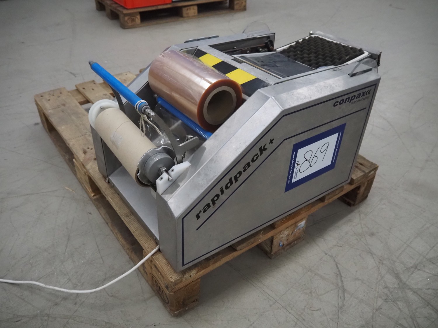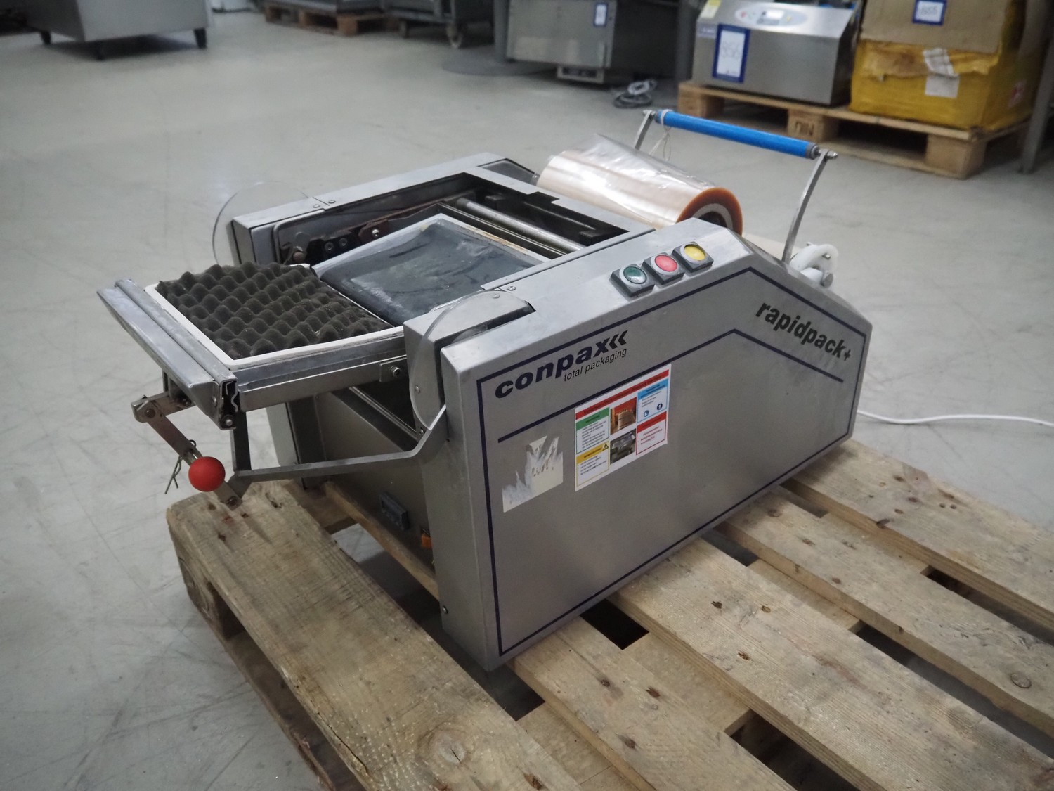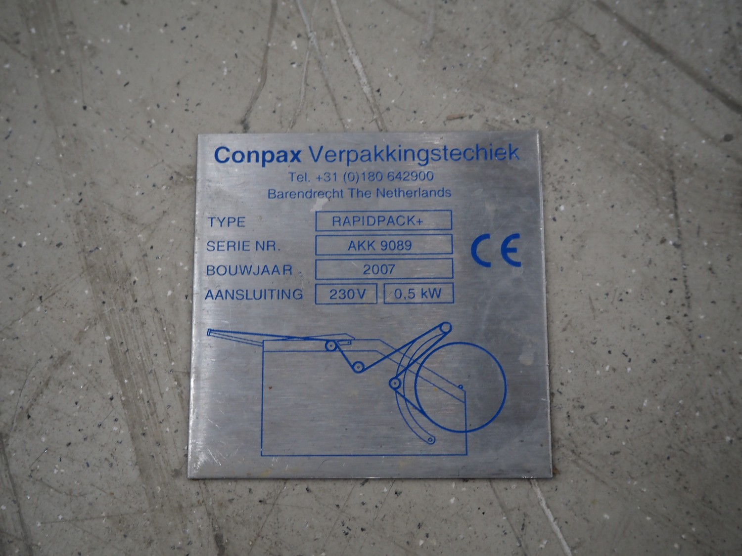 Conpax packaging machine, type: Rapidpack+, serial number: AKK 9089, year of construction: 2007, 230 V, 0.5 kW, film width: 230 mm, seal length: 170 mm x 220 mm, total dimensions: 700 mm x 490 mm x 520 mm.