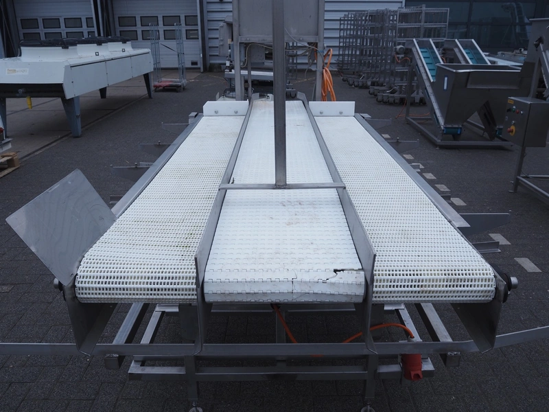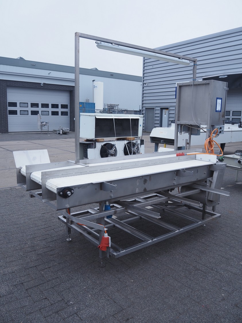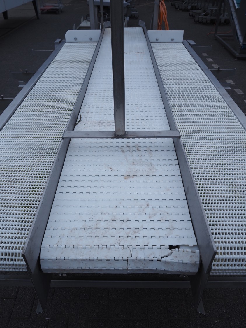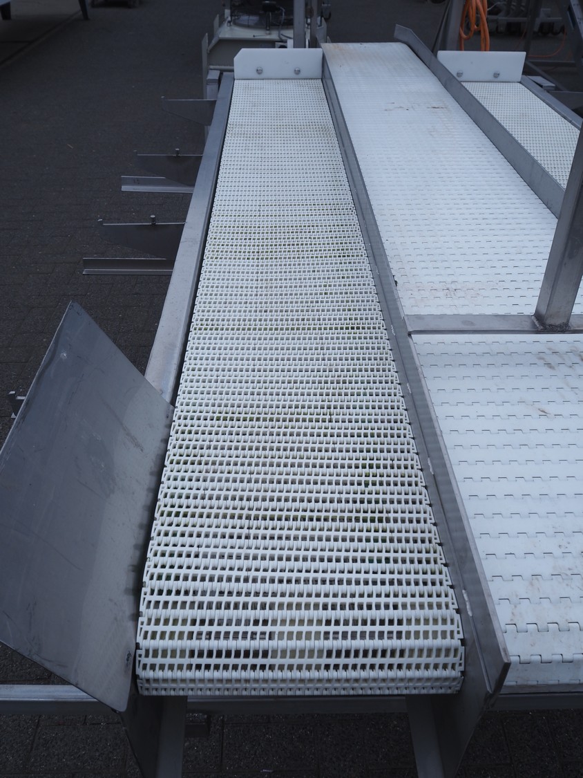 Packaging table, plastic belt, belt width: 300 mm, 2 plastic mesh belts, belt width: (2x) 380 mm, total dimensions: 2900 mm x 1700 mm x 2300 mm.