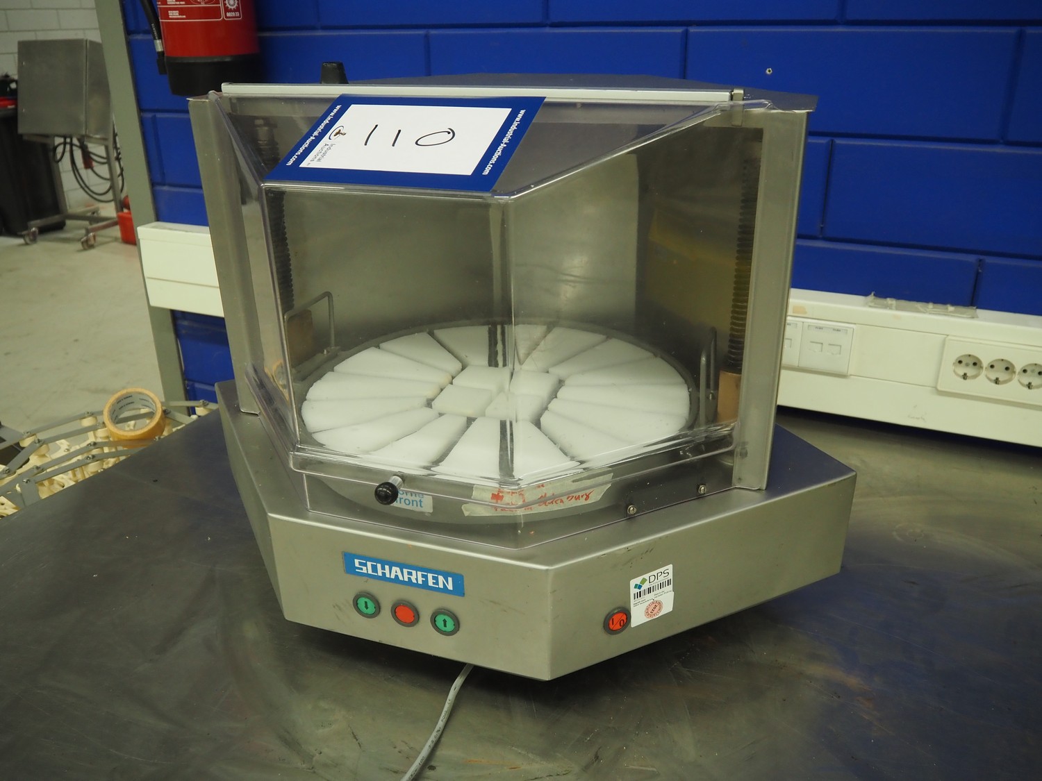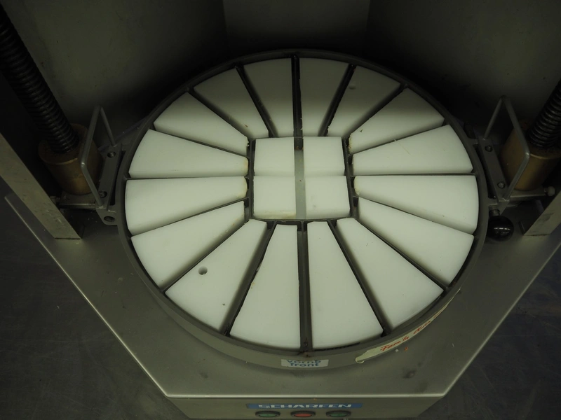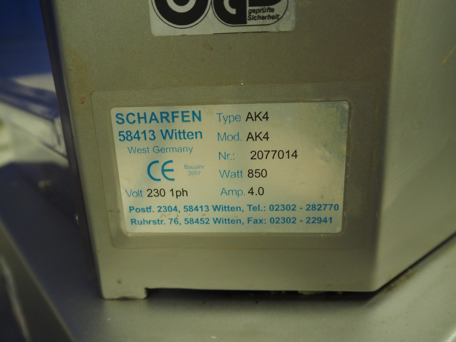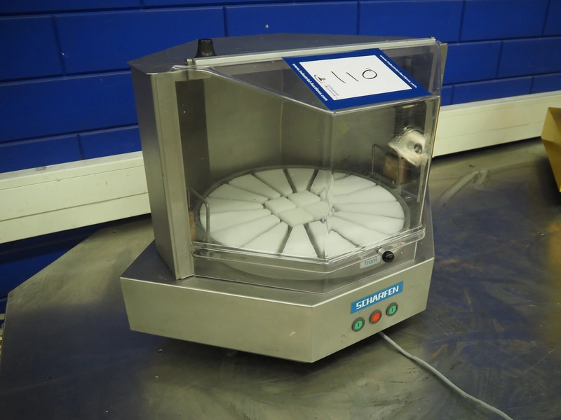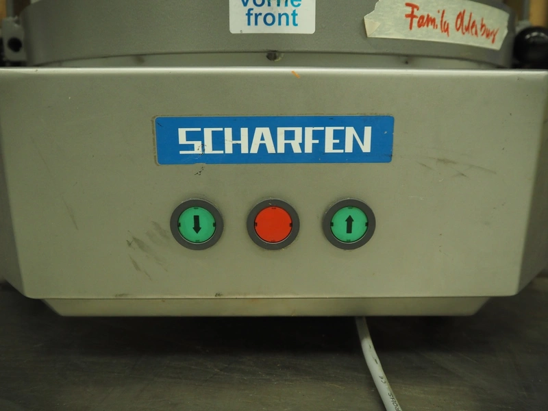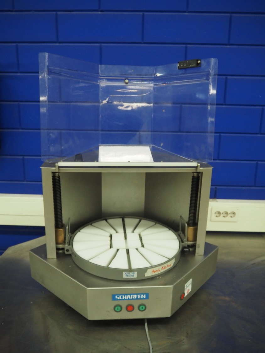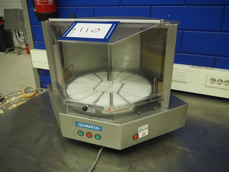 Scharfen cheese portioning machine, type: AK4, model: AK4, number: 2077014, 230 V, 1 Ph, 850 A, 4.0 A, dimensions: 550 mm x 550 mm x 520 mm.