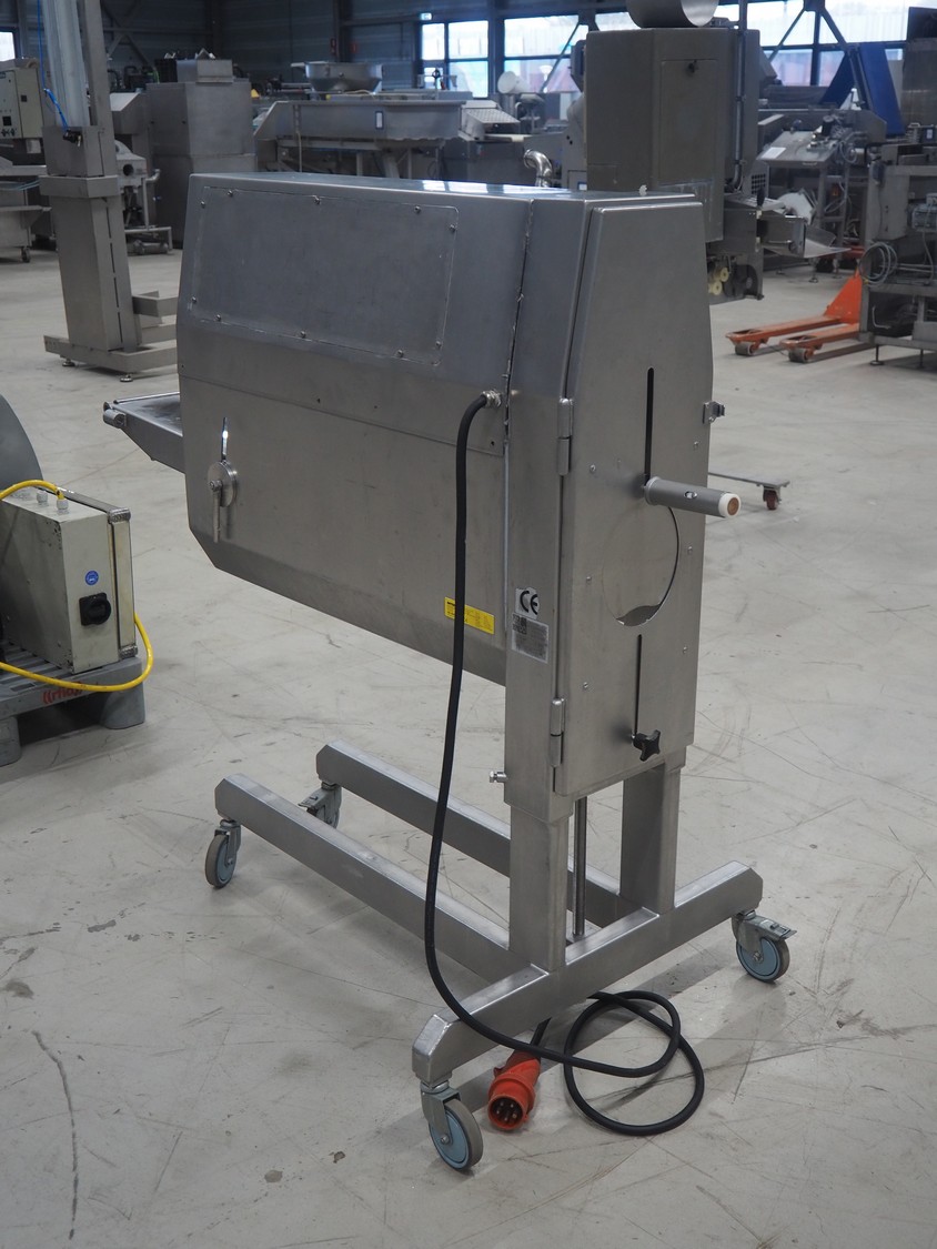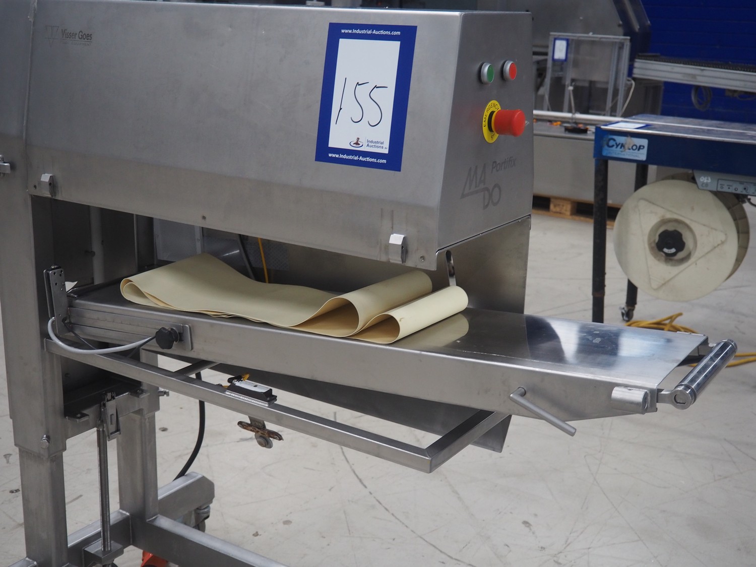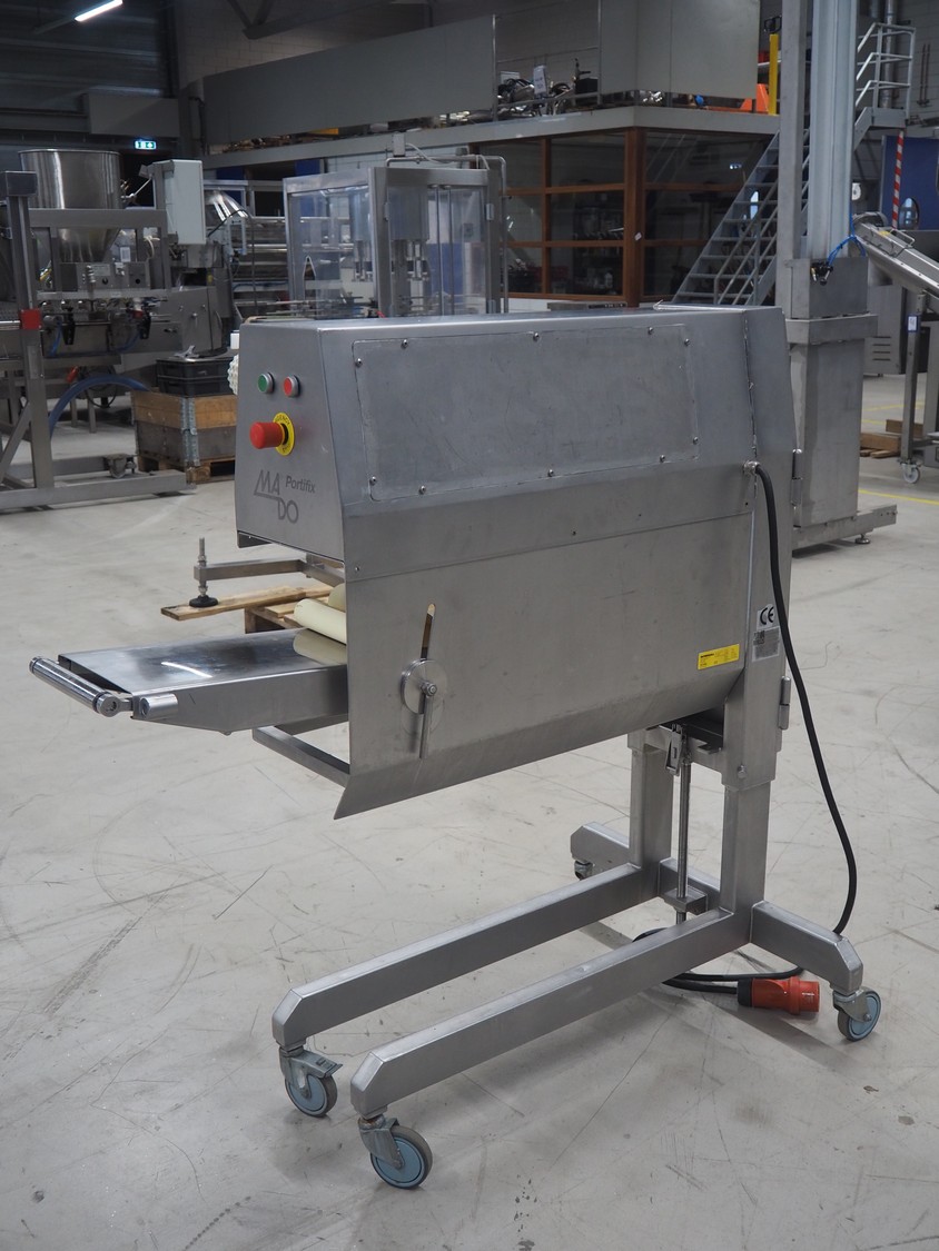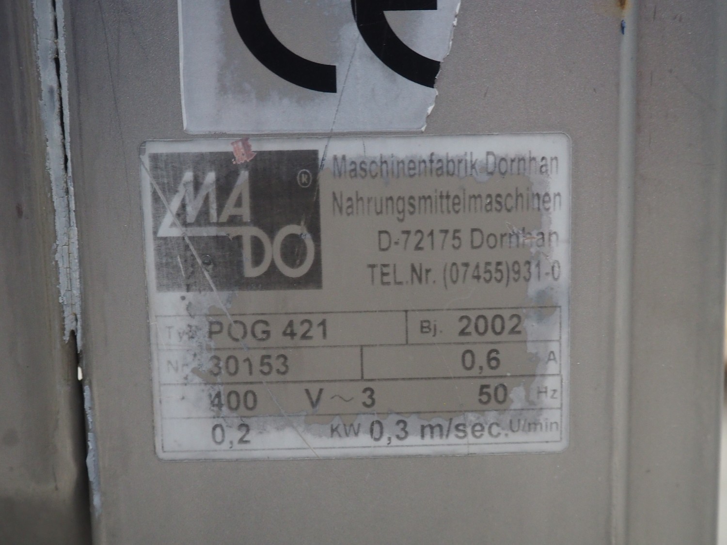 Mado mobile portioning machine, type: POG 421, number: 30153, year of construction: 2002, 400 V, 3 Ph, 50 Hz, 0.6 A, 0.2 kW, plastic belt, belt width: 195 mm, diameter clearance: 160 mm, total dimensions: 1480 mm x 760 mm x 1330 mm. Incomplete.