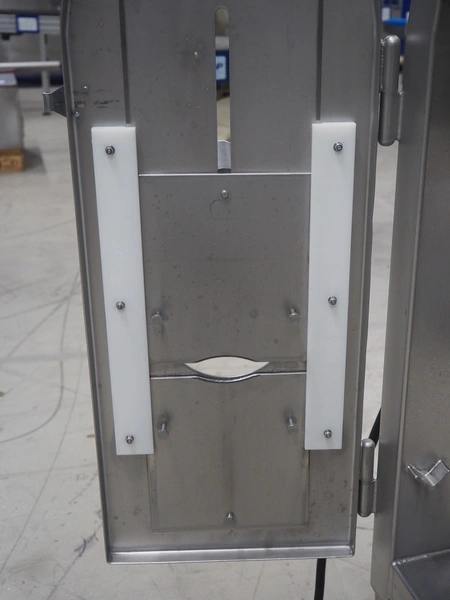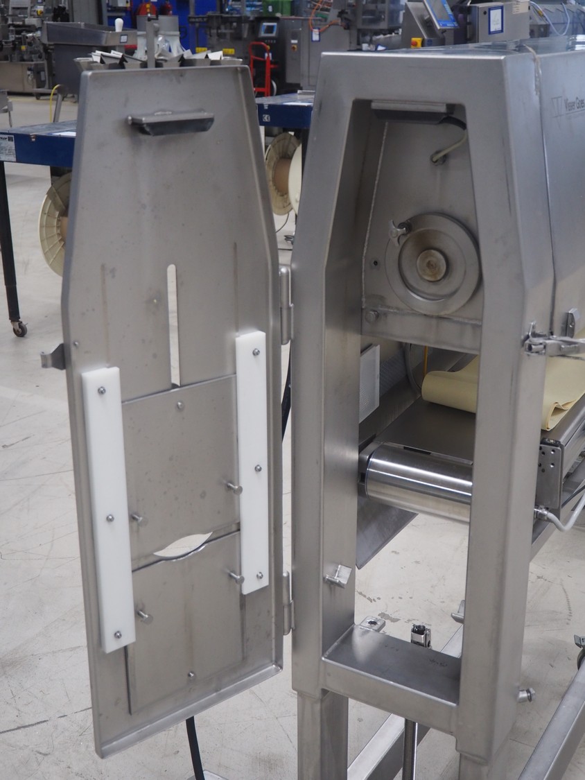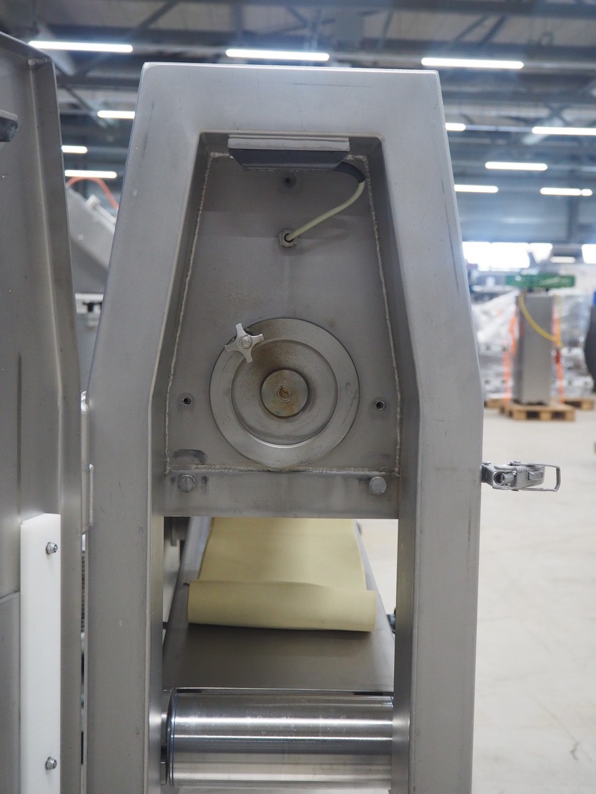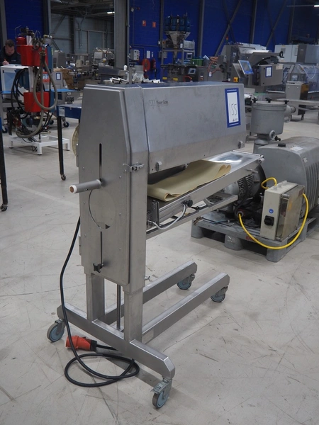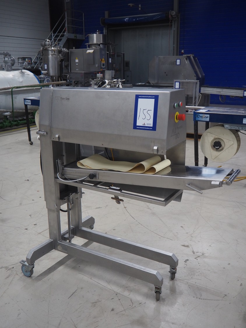 Mado mobile portioning machine, type: POG 421, number: 30153, year of construction: 2002, 400 V, 3 Ph, 50 Hz, 0.6 A, 0.2 kW, plastic belt, belt width: 195 mm, diameter clearance: 160 mm, total dimensions: 1480 mm x 760 mm x 1330 mm. Incomplete.