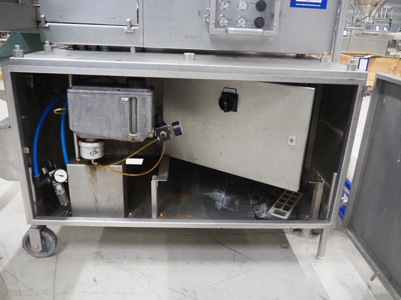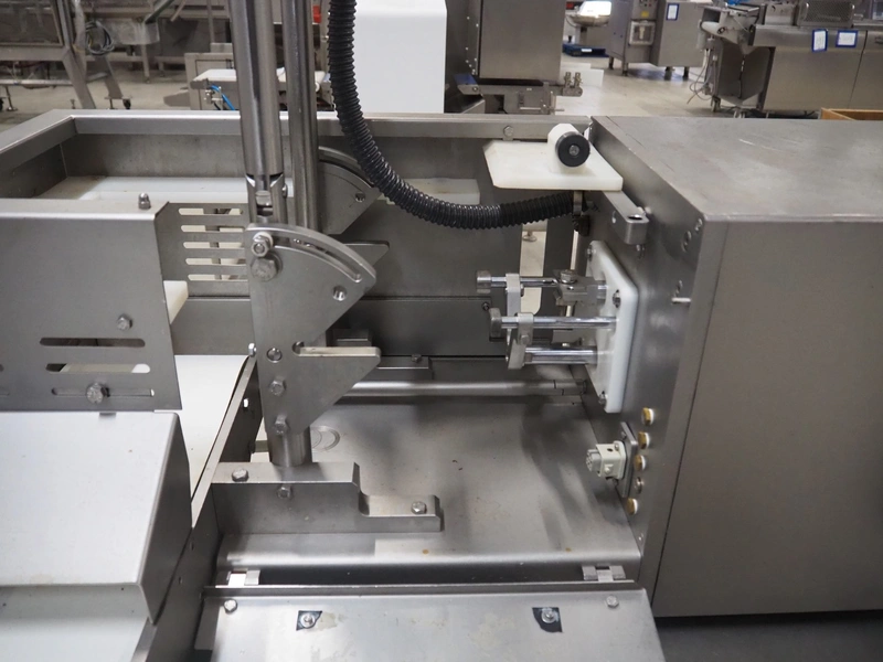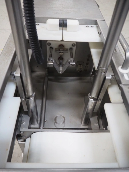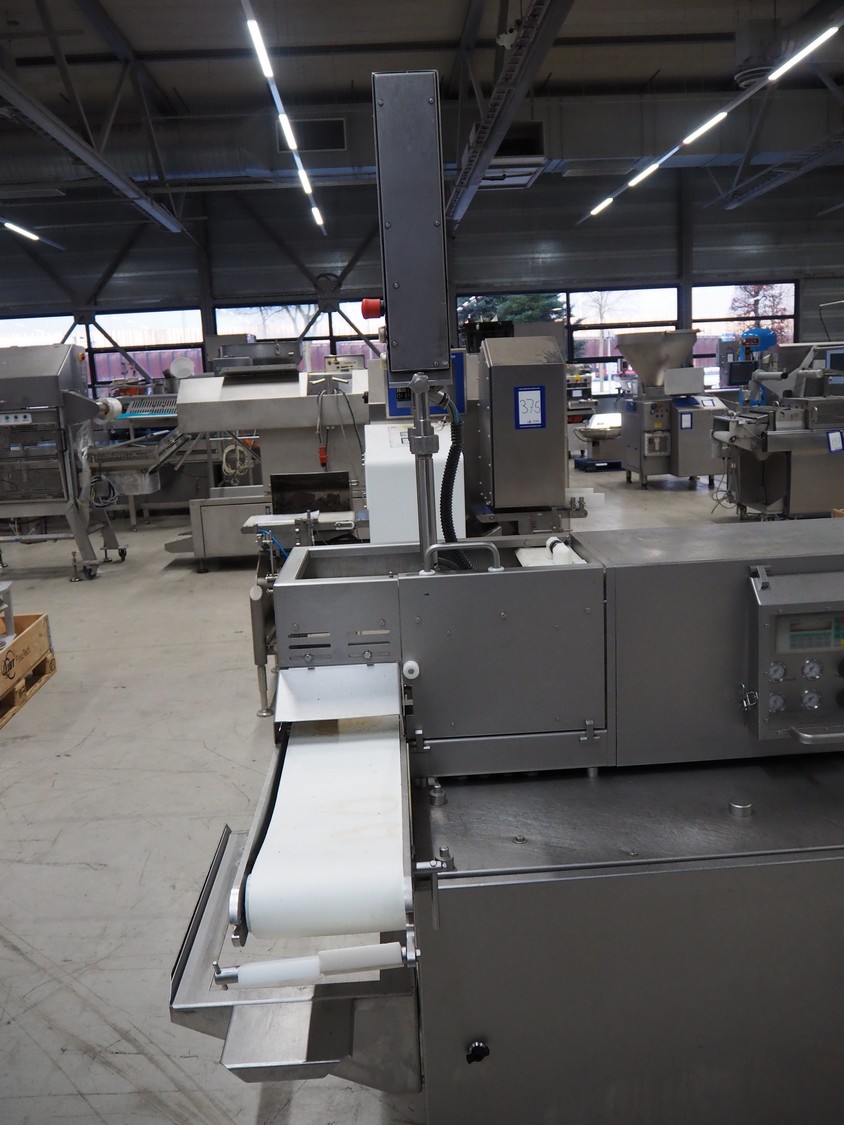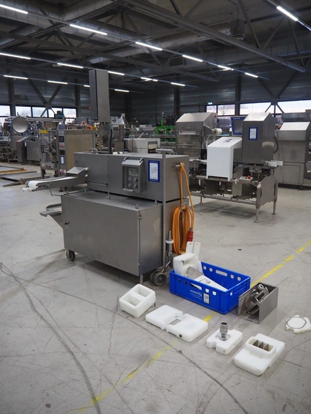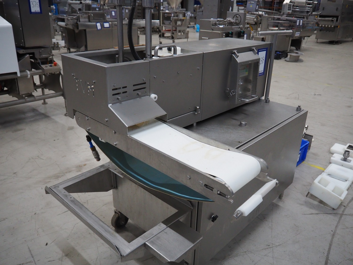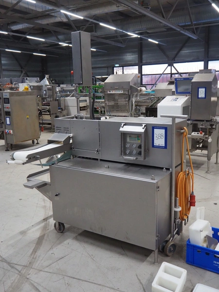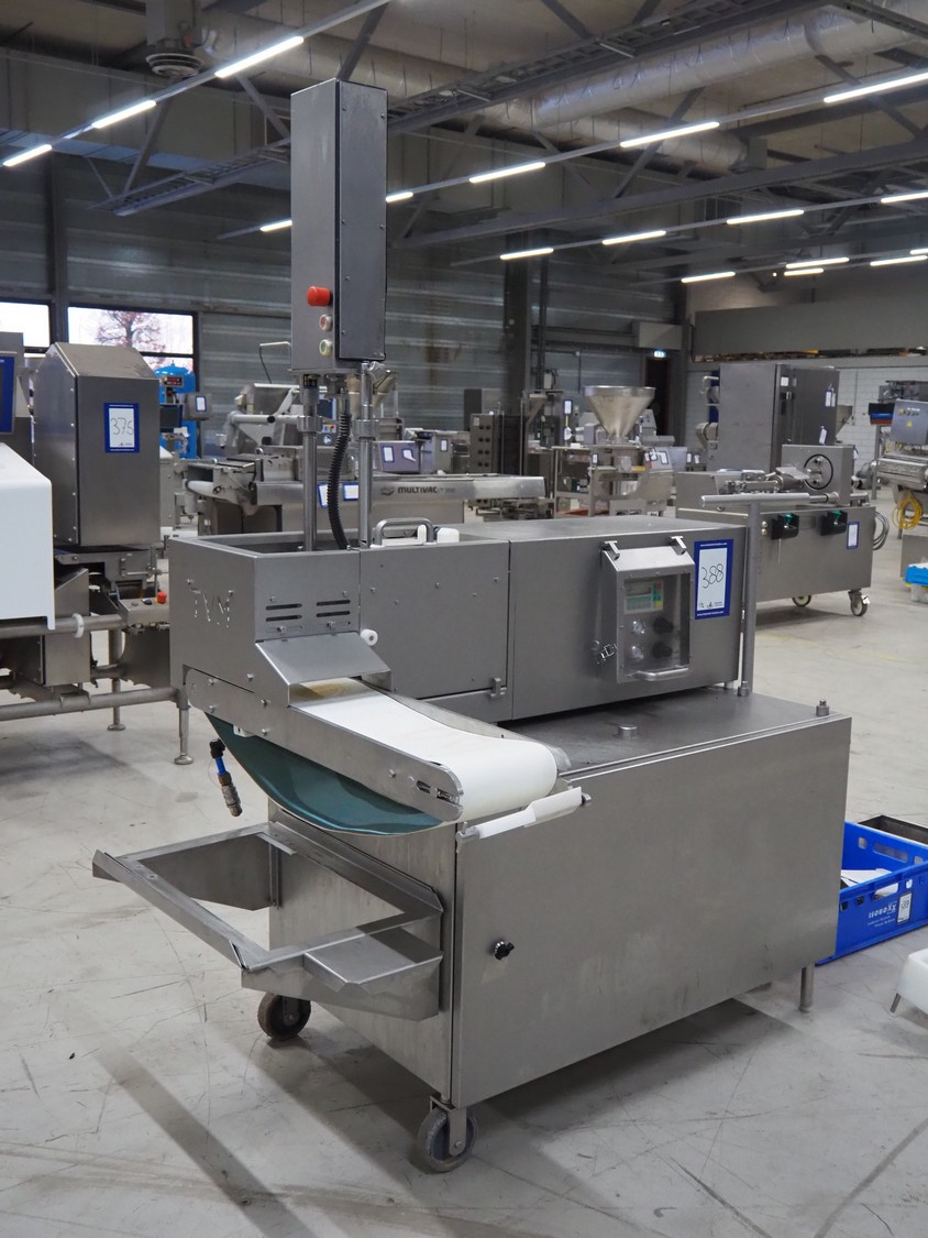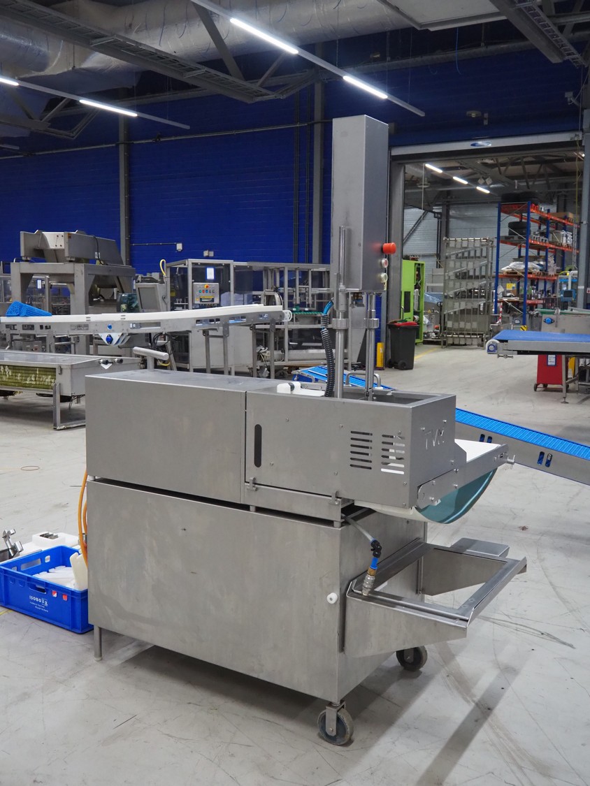 TVM mobile portioning machine, plastic outfeed belt, belt width: 200 mm, total dimensions: 1700 mm x 1150 mm x 2100 mm.