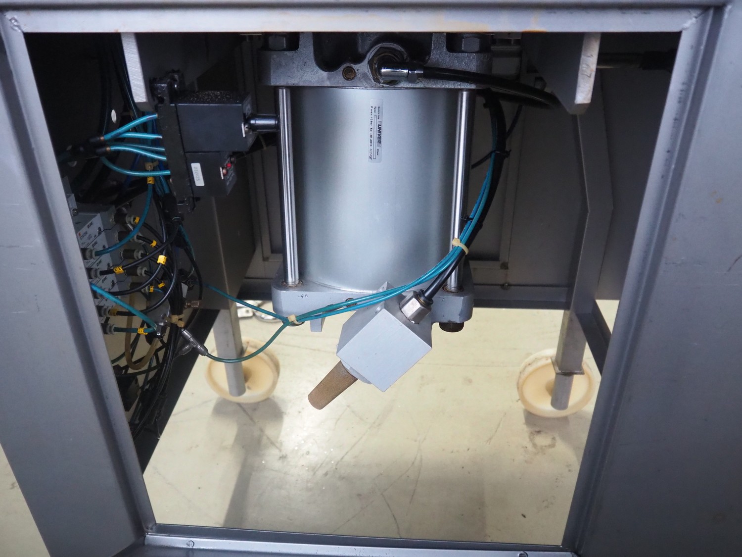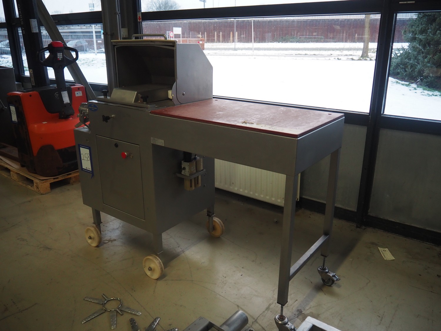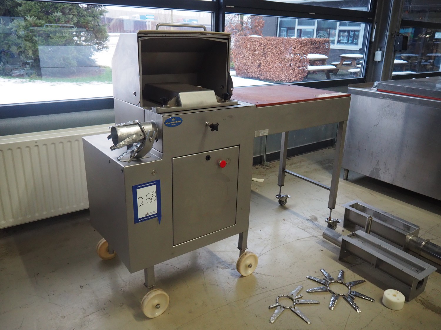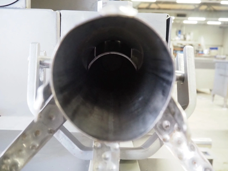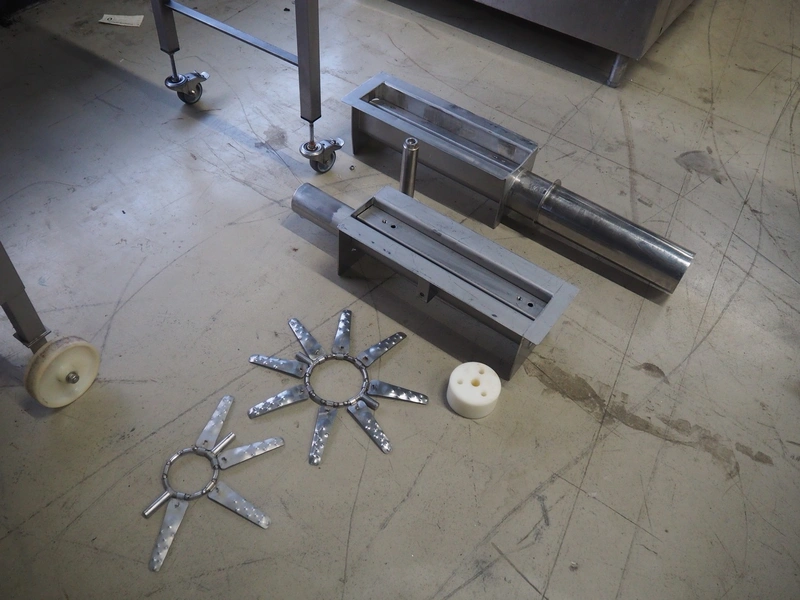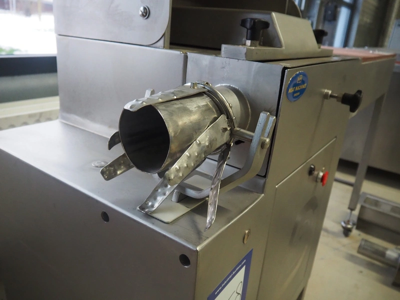 Dorit mobile meat press, type: Combi-press, clearance: Ø 100 mm x 495 mm, total dimensions: 1800 mm x 700 mm x 1420 mm. Including 2 extra outfeed pipes, dimensions outfeed pipes: (1x) 90 mm and (1x) 120 mm.