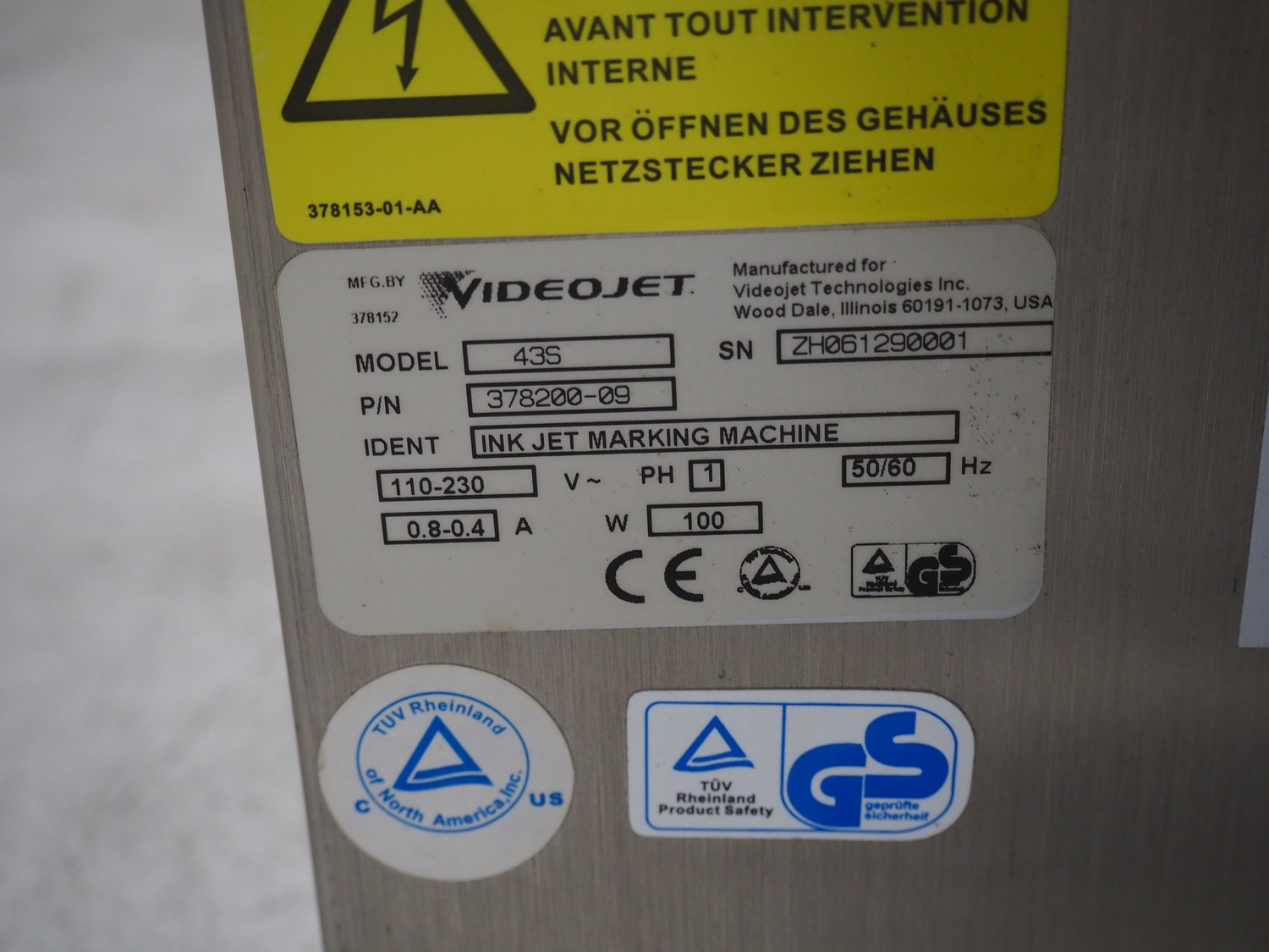 Videojet inkjet printer, model: 43S, serial number: ZH061290001, 100-230 V, 1 Ph, 50/60 Hz, 0.8/0.4 A, dimensions: 600 mm x 240 mm x 620 mm.