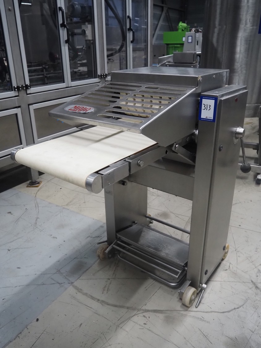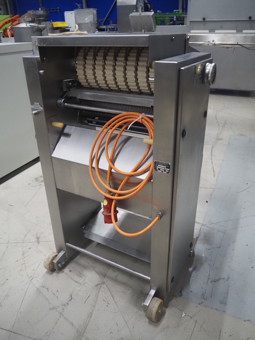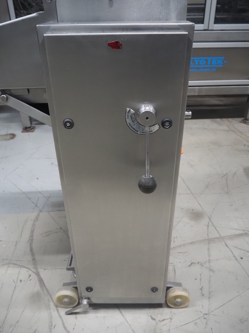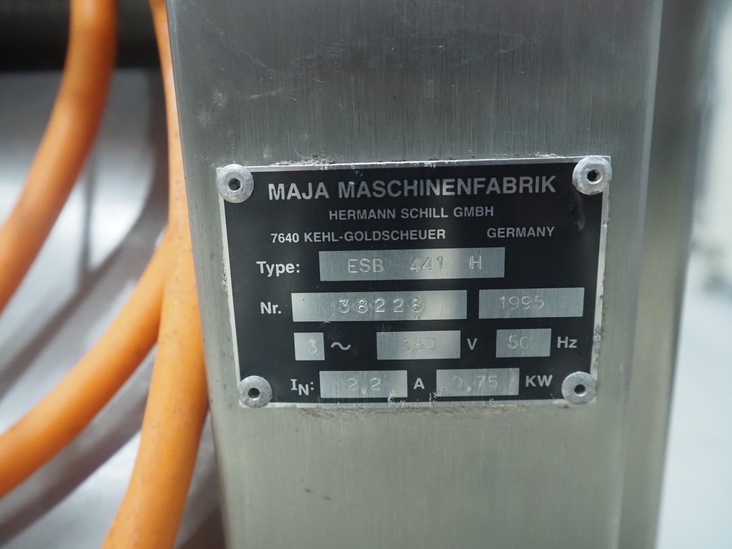 Maja Maschinenfabrik mobile skinning and derinding machine, type: ESB 441 H, number: 38228, year of construction: 1995, 380 V, 3 Ph, 50 Hz, 2.2 A, 0.75 kW, plastic belt, belt width: 370 mm, working width: 400 mm, total dimensions: 950 mm x 850 mm x 1150 mm.