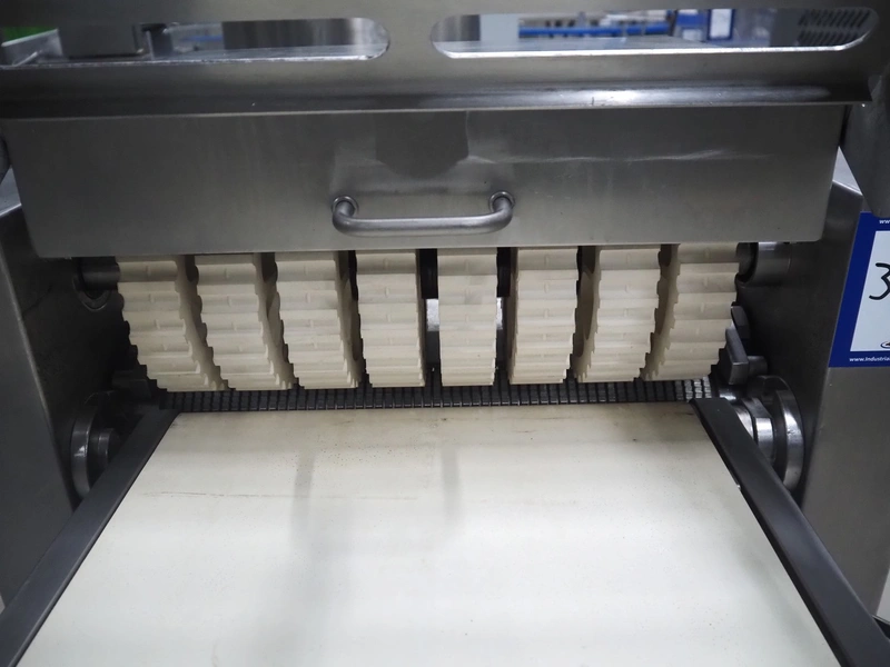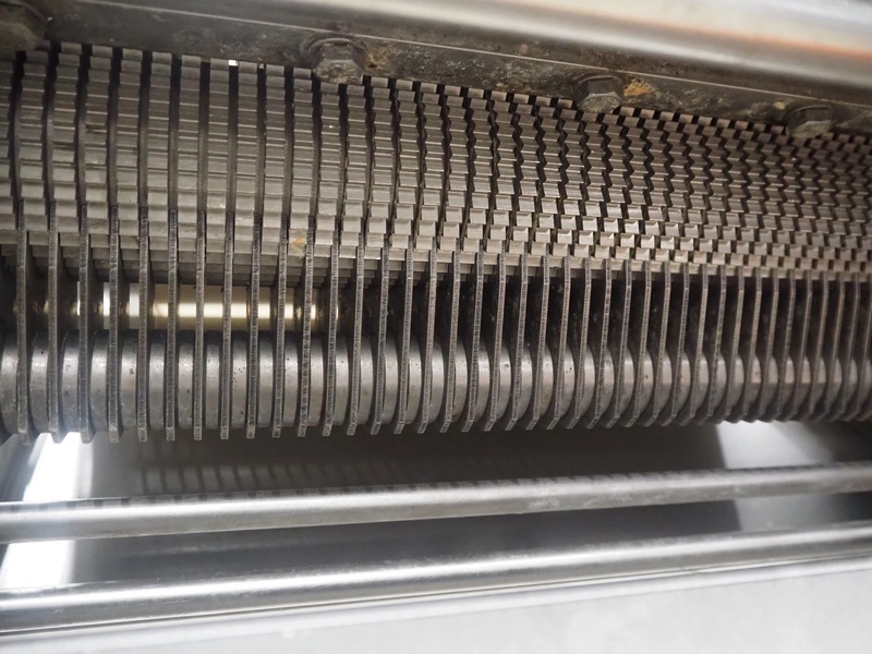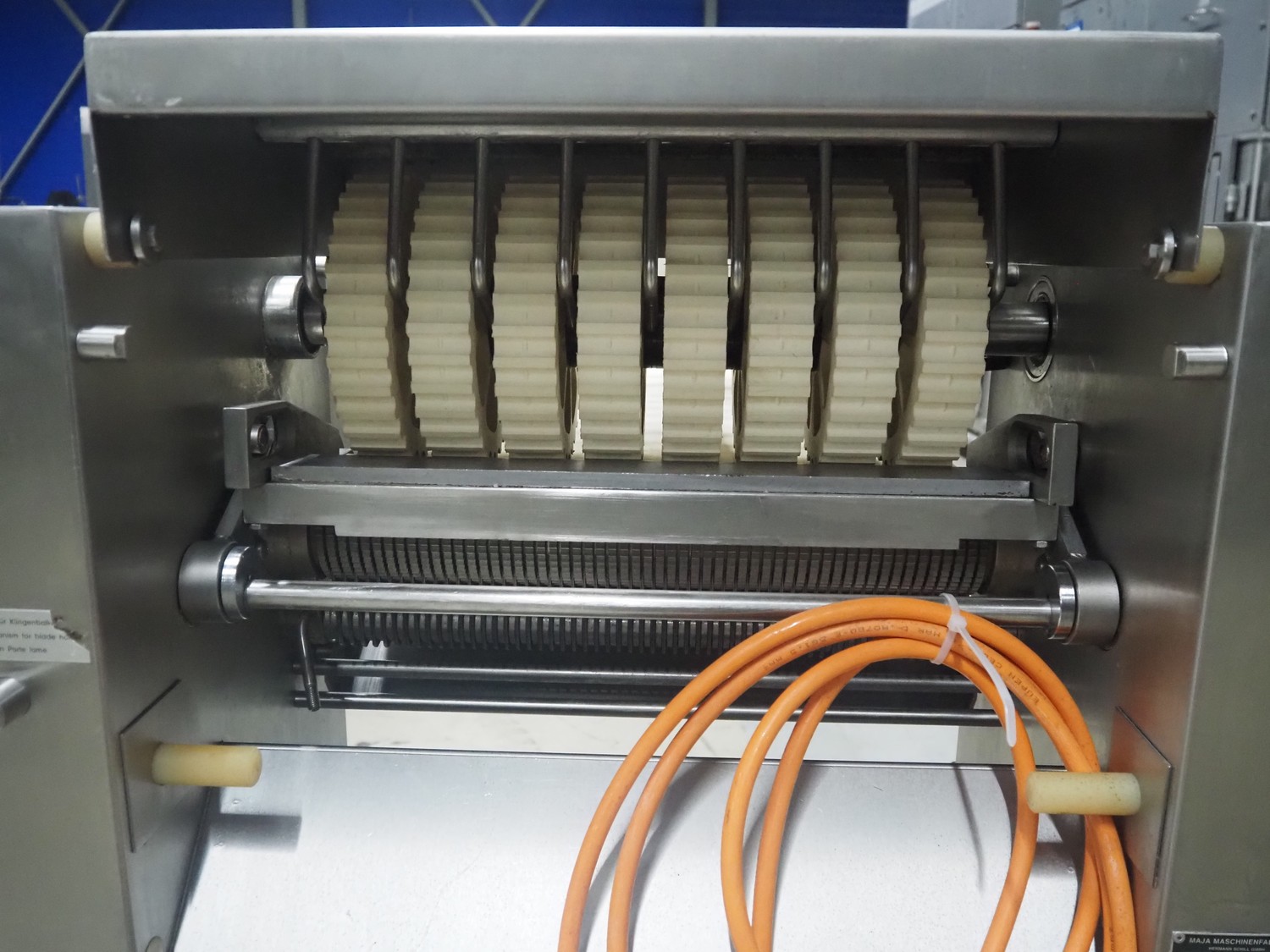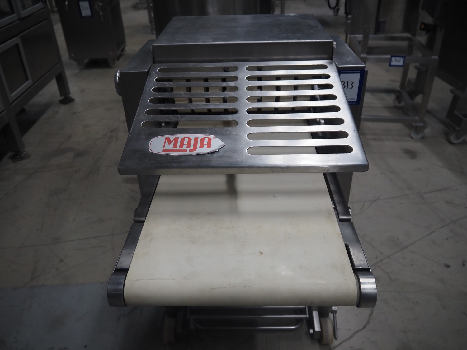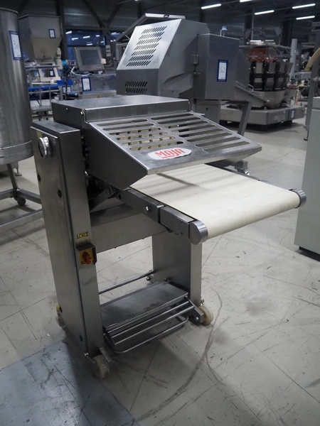 Maja Maschinenfabrik mobile skinning and derinding machine, type: ESB 441 H, number: 38228, year of construction: 1995, 380 V, 3 Ph, 50 Hz, 2.2 A, 0.75 kW, plastic belt, belt width: 370 mm, working width: 400 mm, total dimensions: 950 mm x 850 mm x 1150 mm.