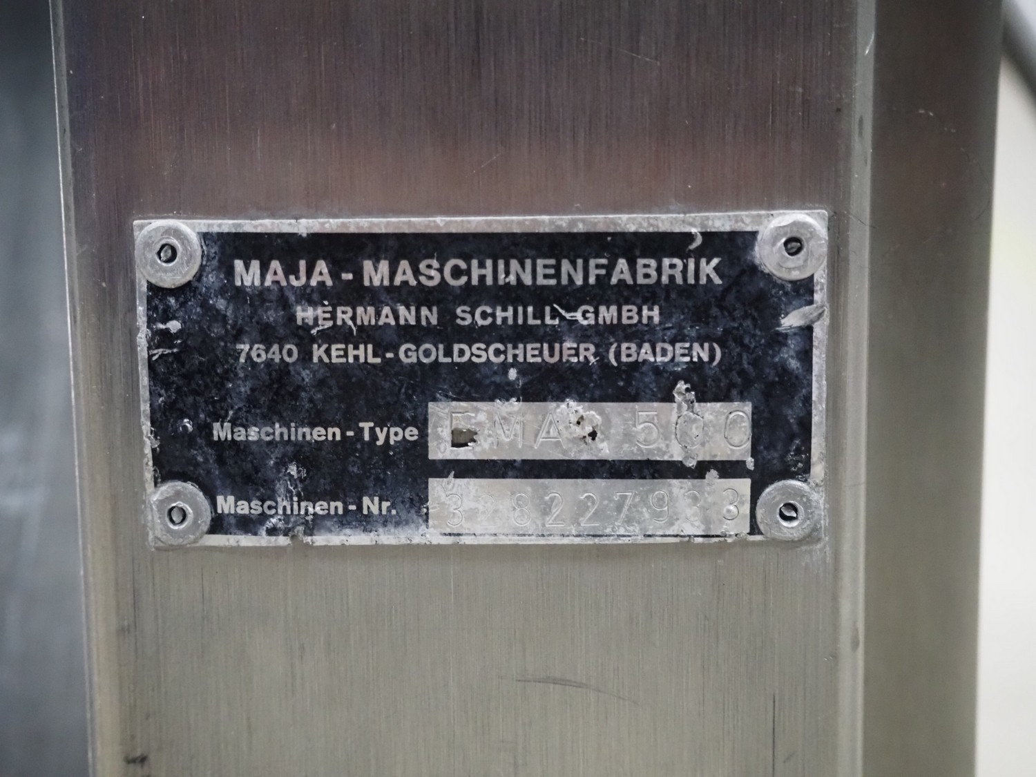 Maja-Maschinenfabrik mobile skinning machine, type: EMA 500, machine number: 328227933, working width: 430 mm, total dimensions: 760 mm x 570 mm x 980 mm.