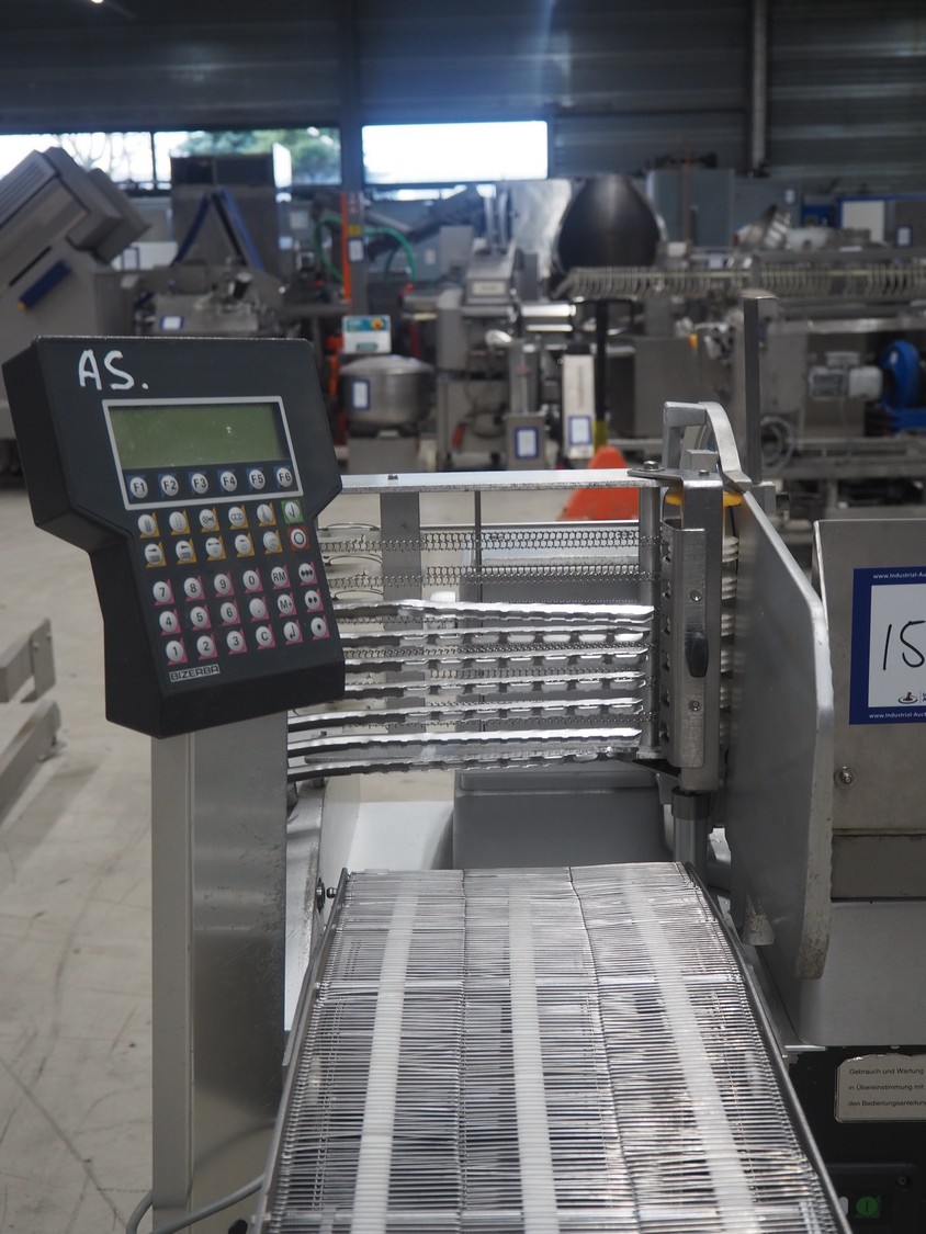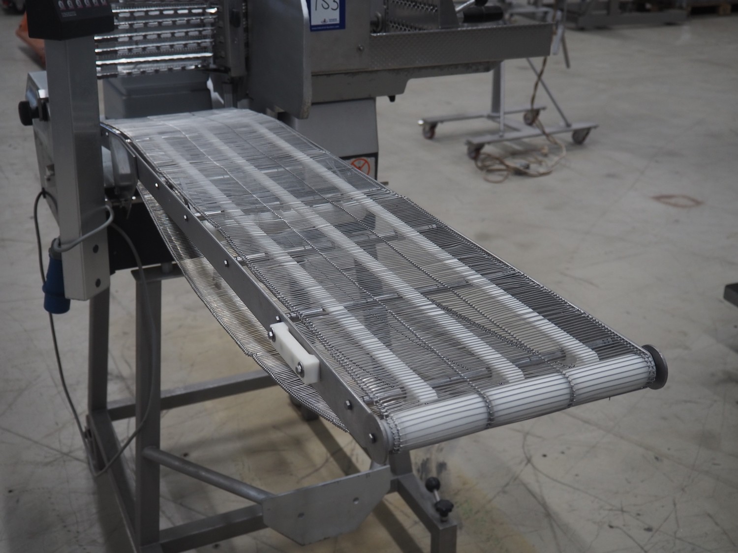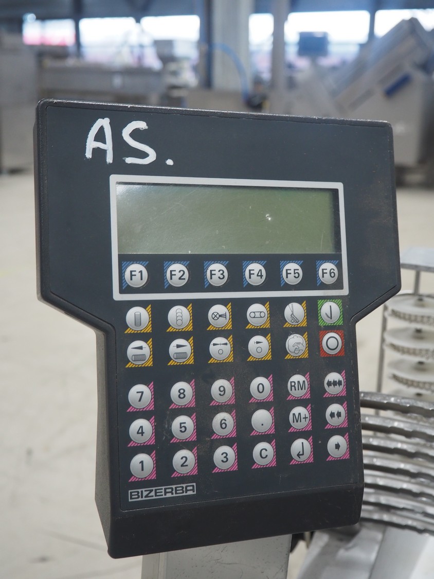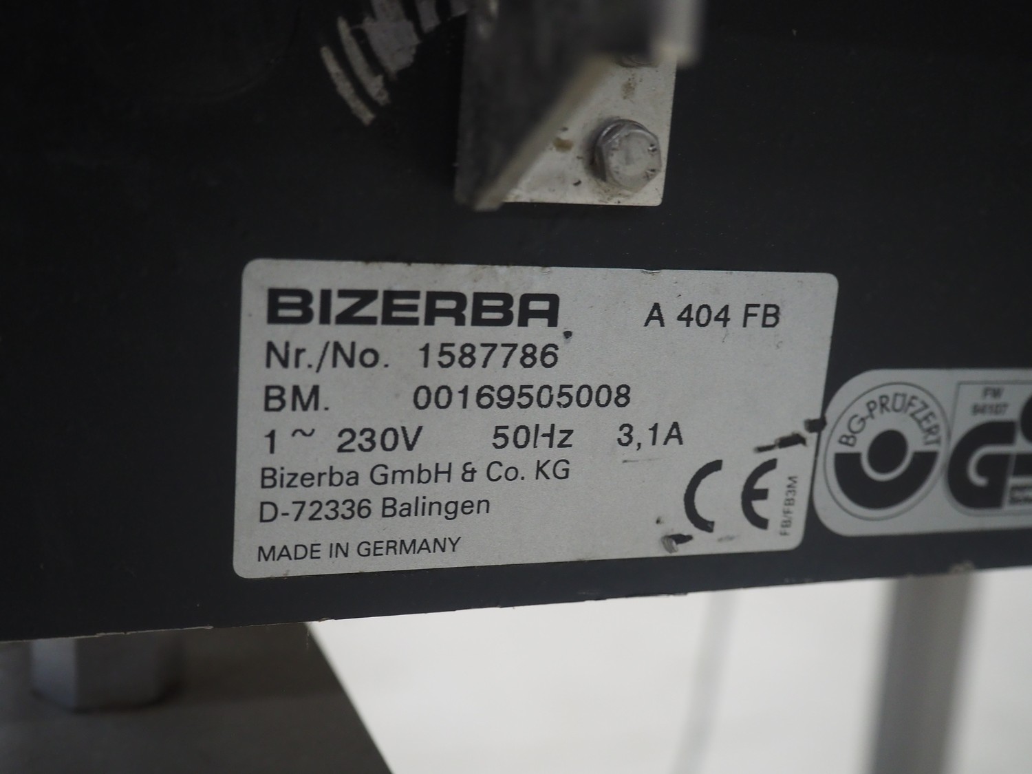 Bizerba automatic slicer, type: A 404 FB, number: 1587786, 230 V, 1 Ph, 50 Hz, 3.1 A, s/s mesh belt, belt width: 250 mm, total dimensions: 1600 mm x 1000 mm x 1400 mm.