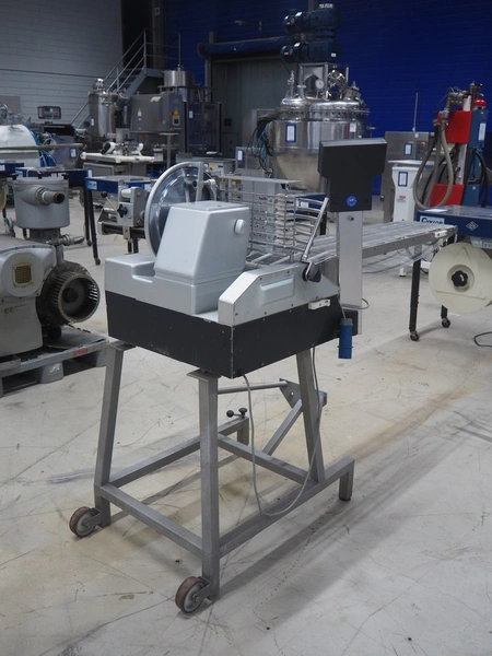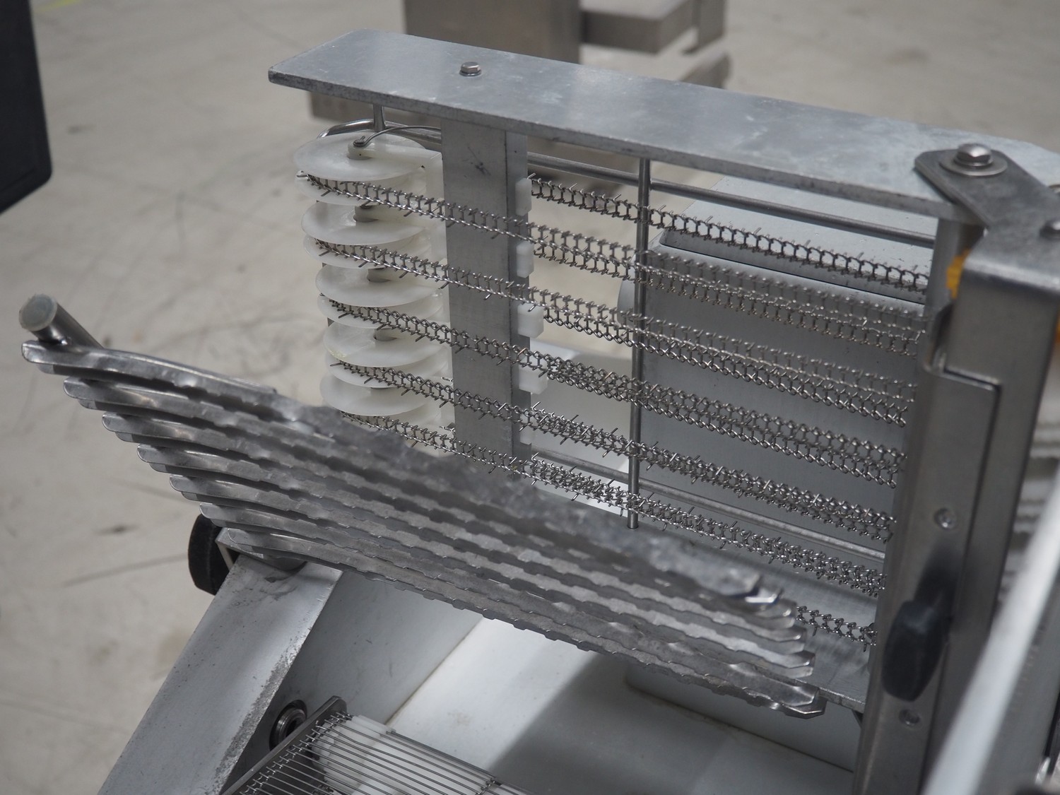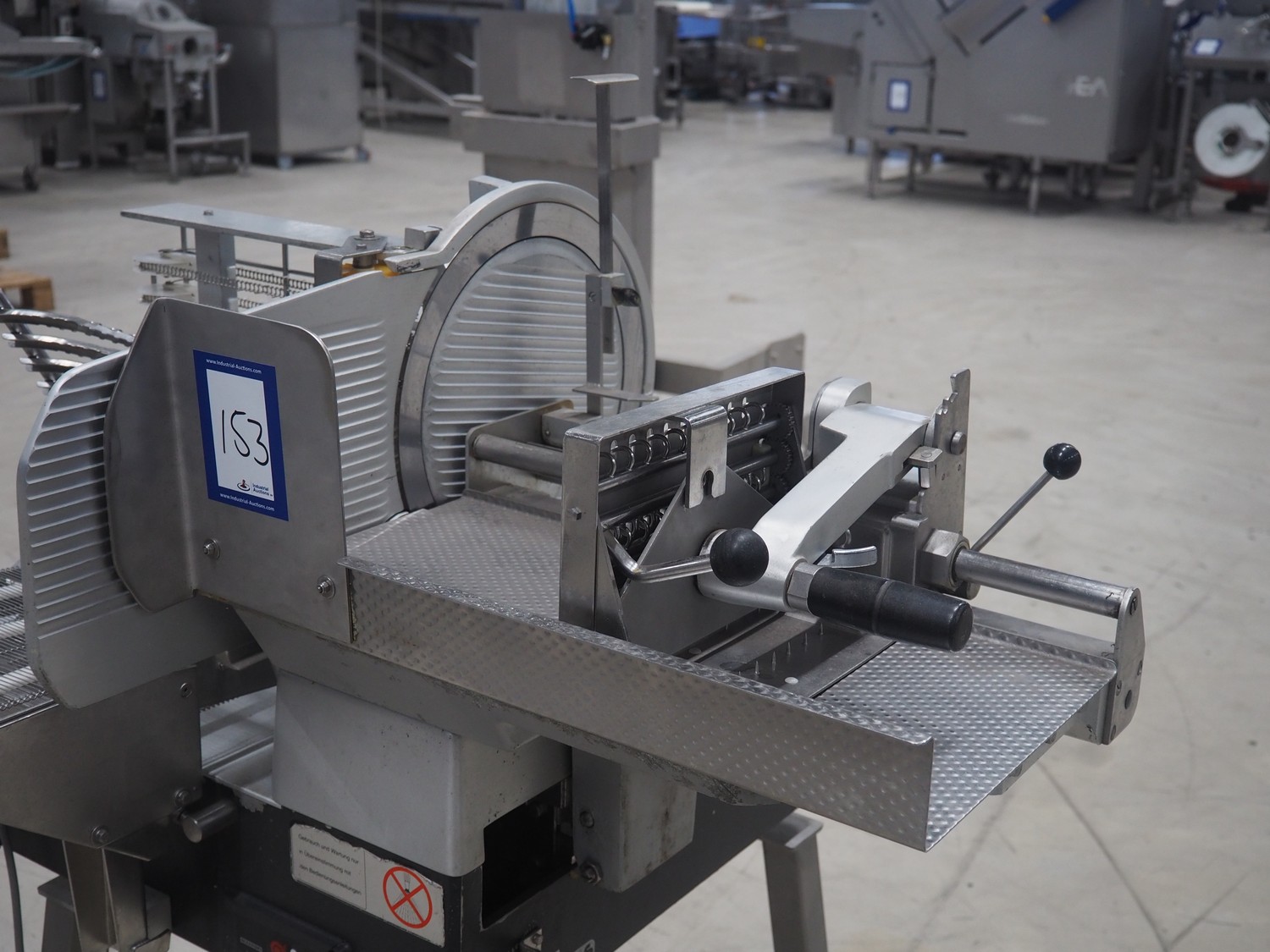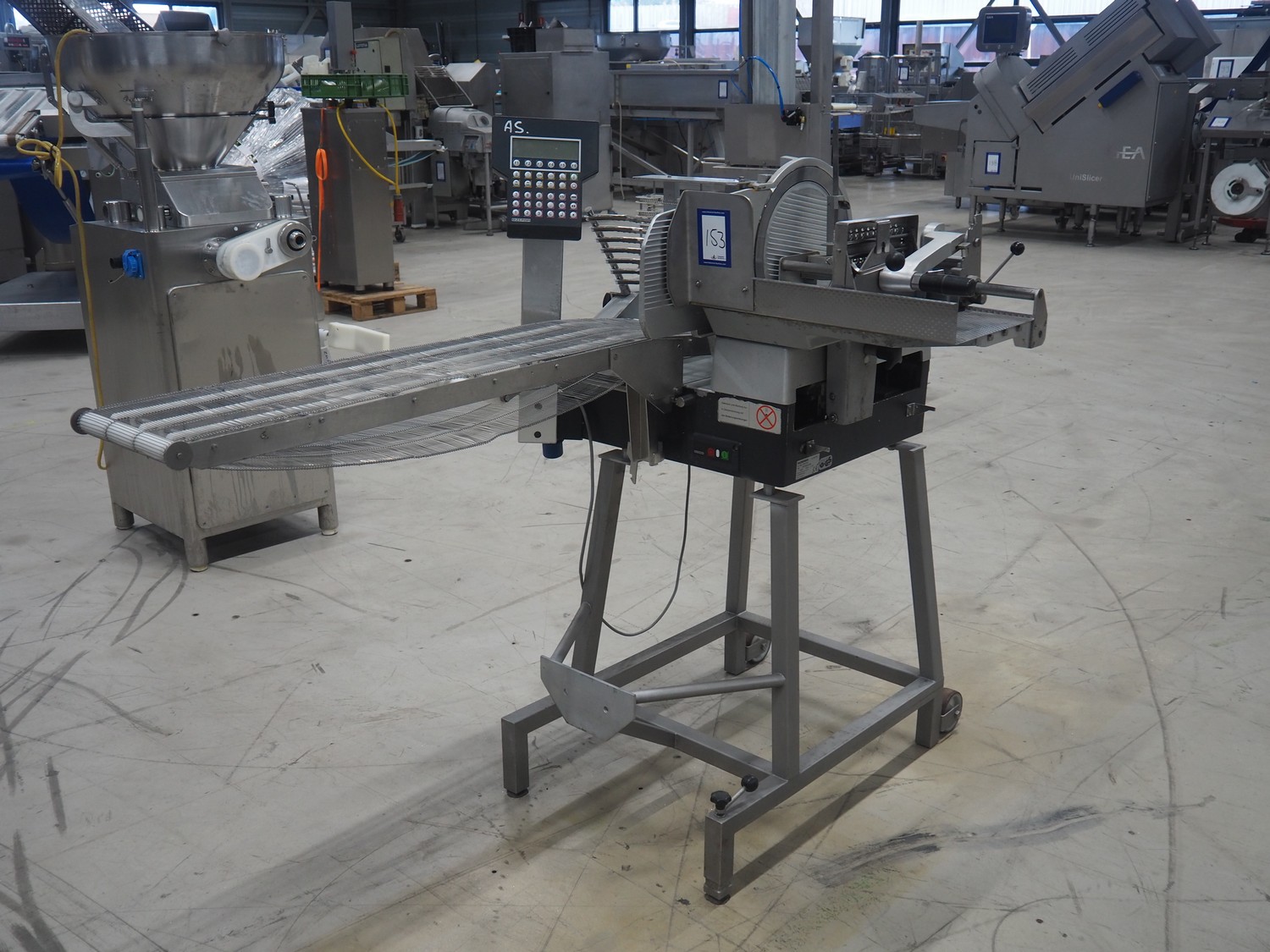 Bizerba automatic slicer, type: A 404 FB, number: 1587786, 230 V, 1 Ph, 50 Hz, 3.1 A, s/s mesh belt, belt width: 250 mm, total dimensions: 1600 mm x 1000 mm x 1400 mm.