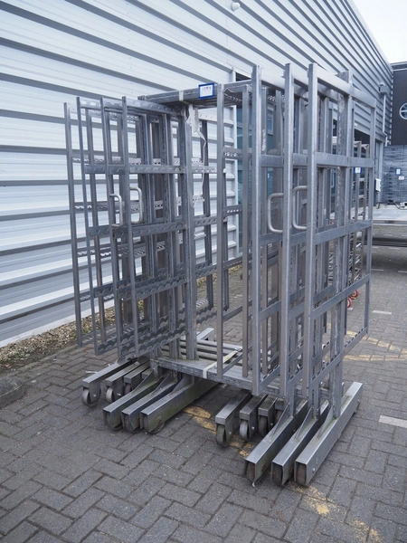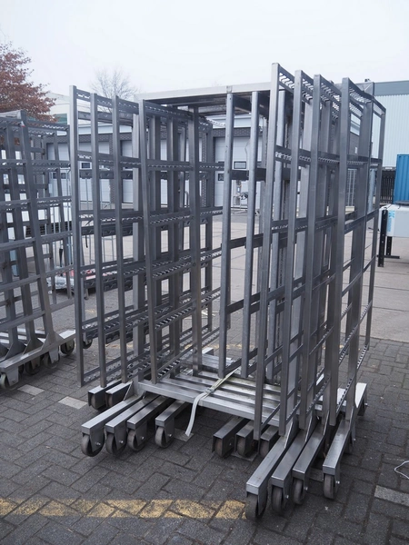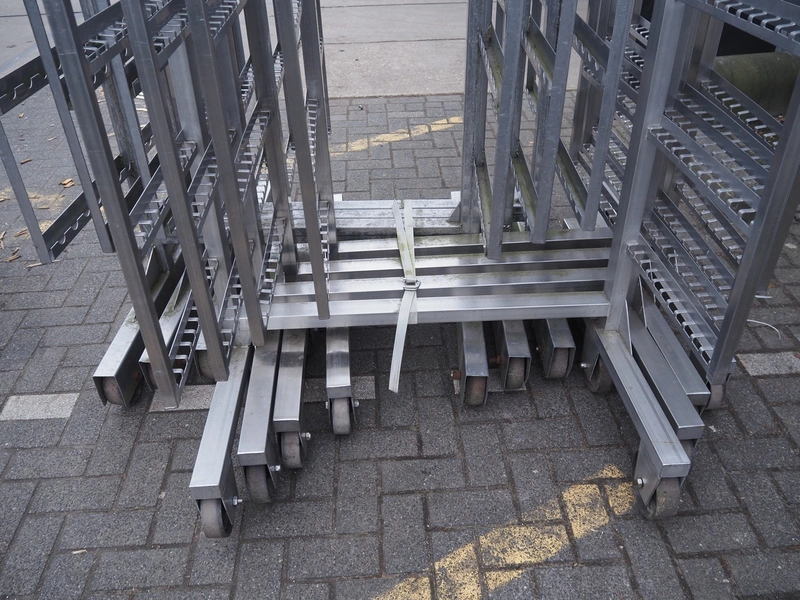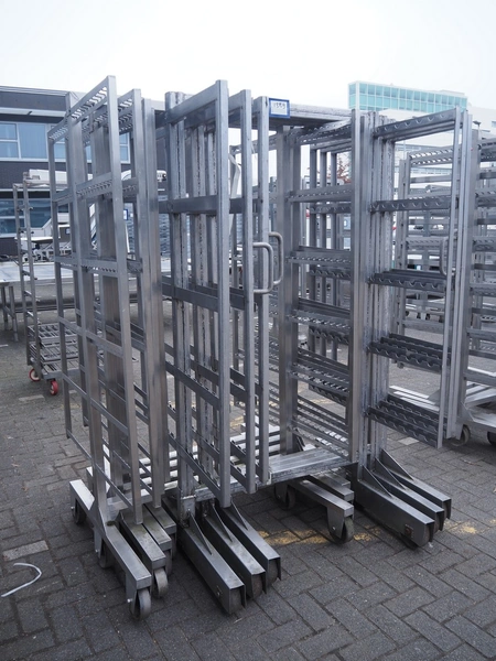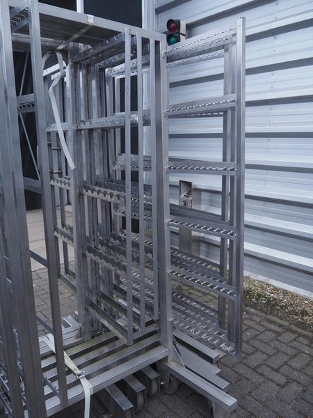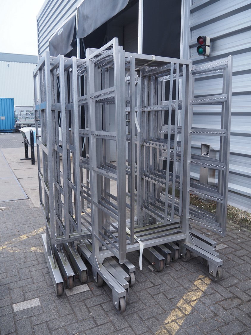 7 s/s smoke trolleys, 5 / 6 floors each, dimensions floors: 1000 mm x 960 mm, total dimensions: (7x) 1000 mm x 1000 mm x 2000 mm.