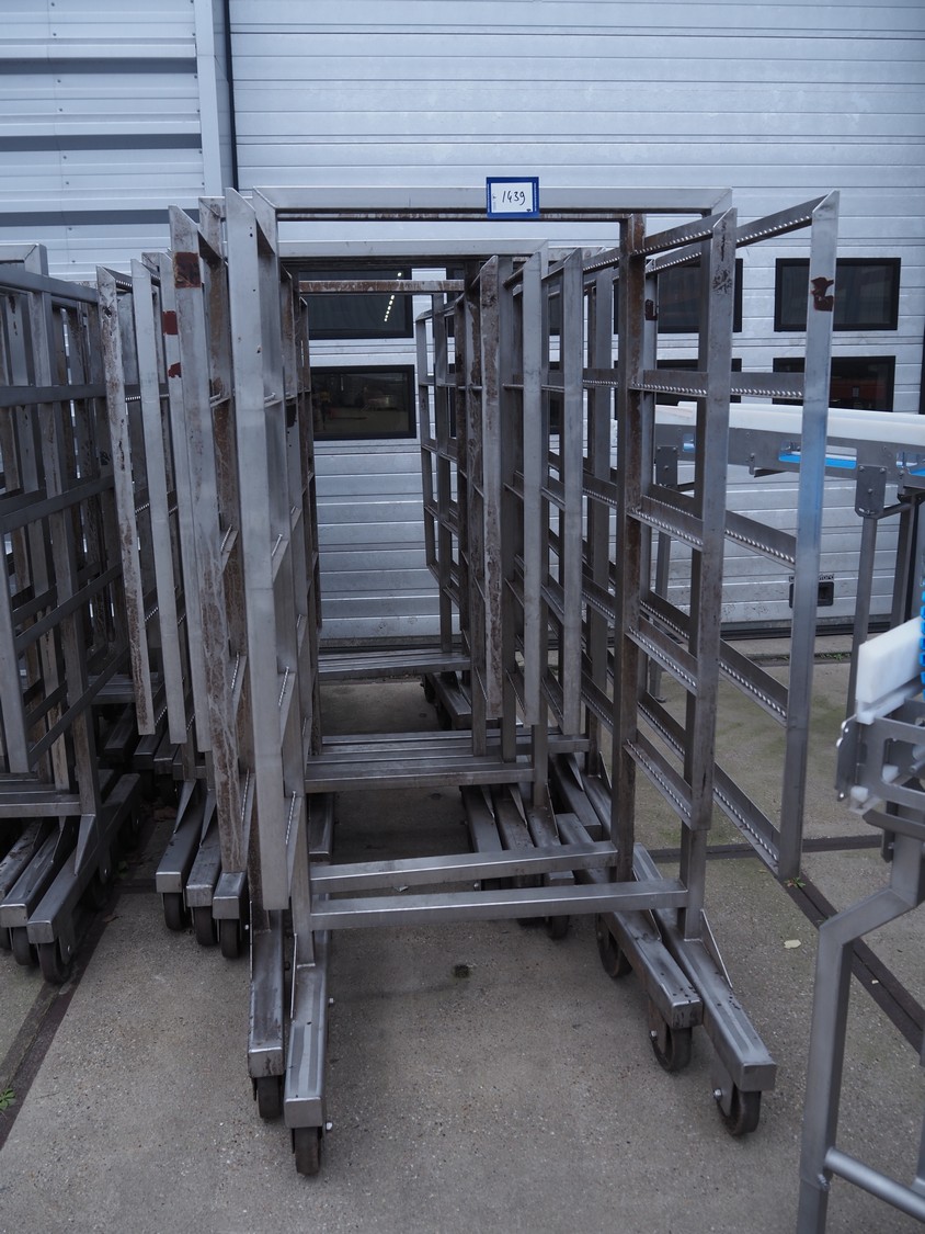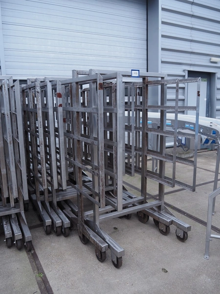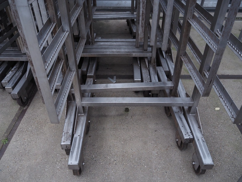 10 s/s smoke trolleys, 5 floors each, dimensions each floor: 960 mm x 900 mm, total dimensions: (10x) 960 mm x 910 mm x 1800 mm. Including 20 aluminium y-shaped smoke sticks per trolley, length each smoke stick: 880 mm.