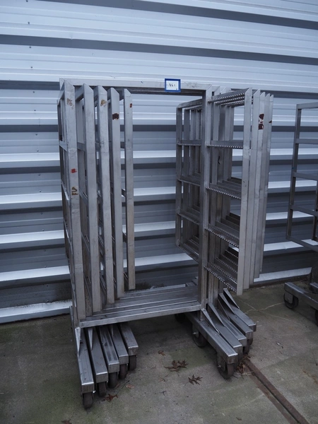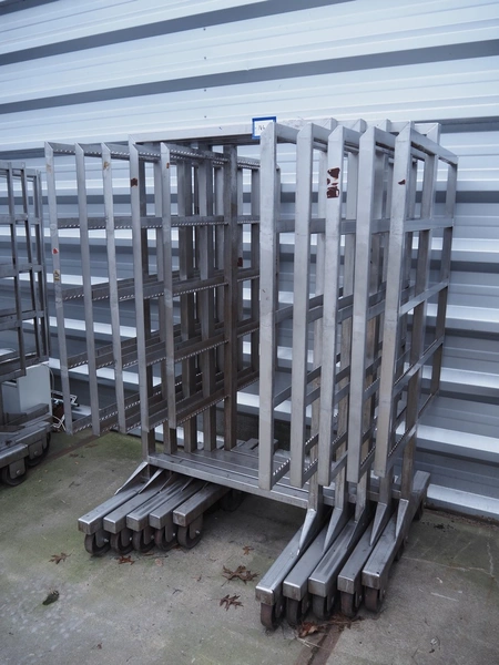 5 s/s smoke trolleys, 5 floors each, dimensions each floor: 960 mm x 900 mm, total dimensions: (5x) 960 mm x 910 mm x 1800 mm. Including 20 aluminium y-shaped smoke sticks per trolley, length each smoke stick: 880 mm.