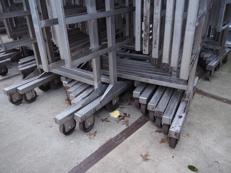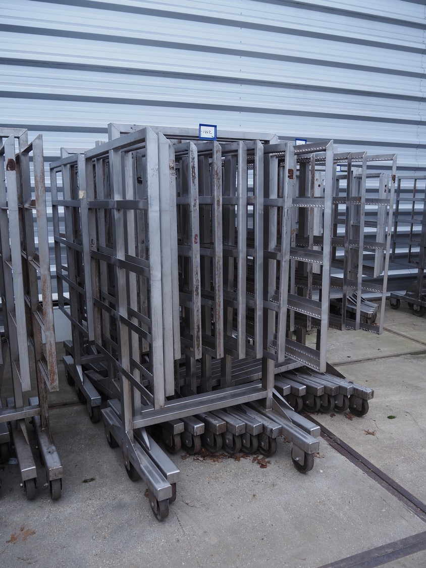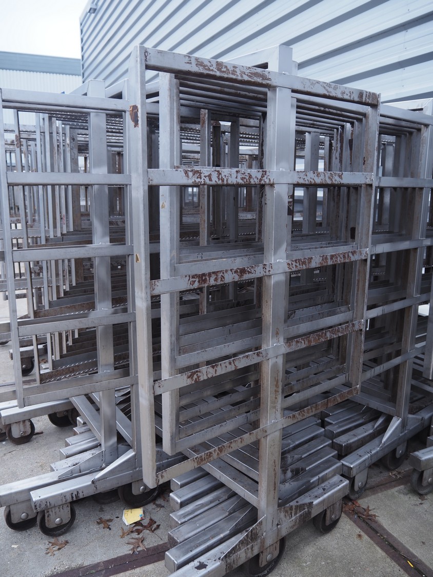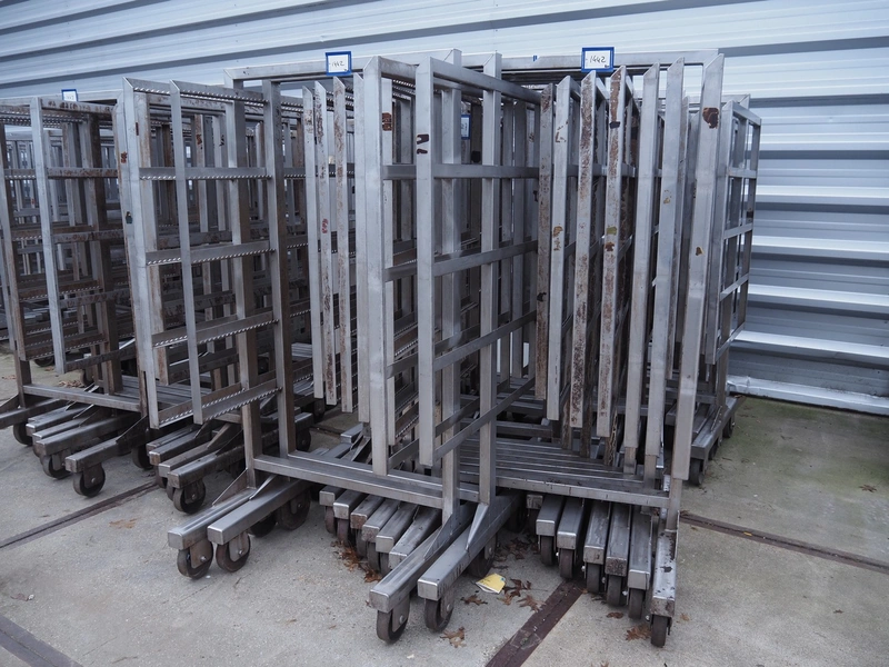 20 s/s smoke trolleys, 5 floors each, dimensions each floor: 960 mm x 900 mm, total dimensions: (20x) 960 mm x 910 mm x 1800 mm. Including 20 aluminium y-shaped smoke sticks per trolley, length each smoke stick: 880 mm.