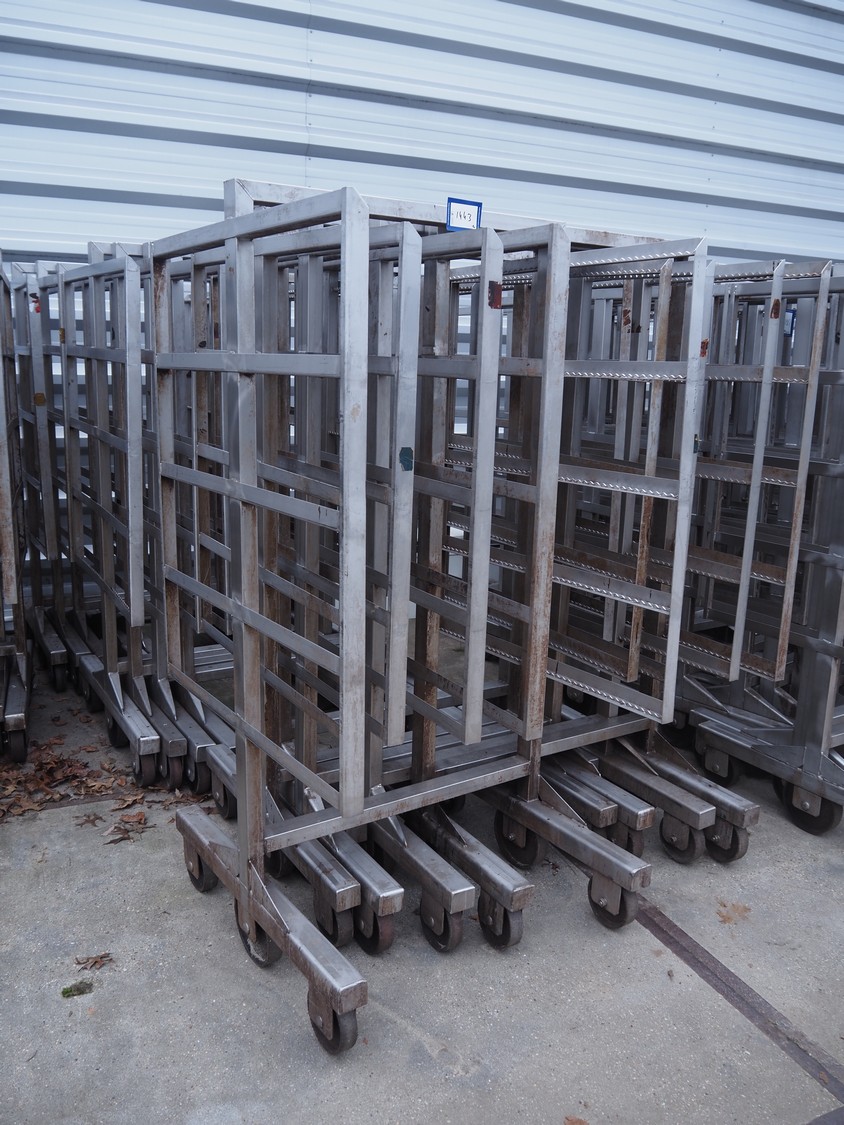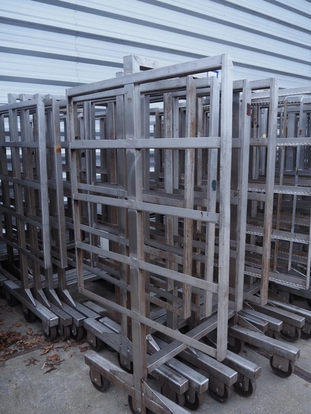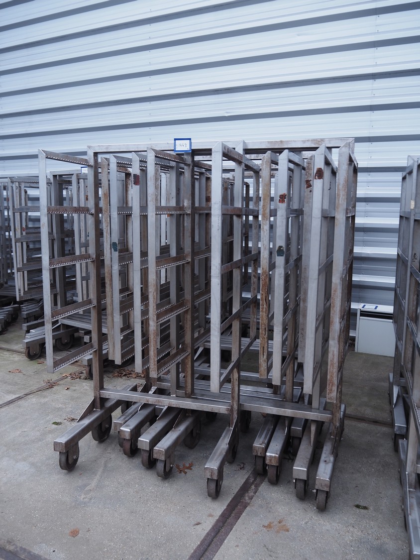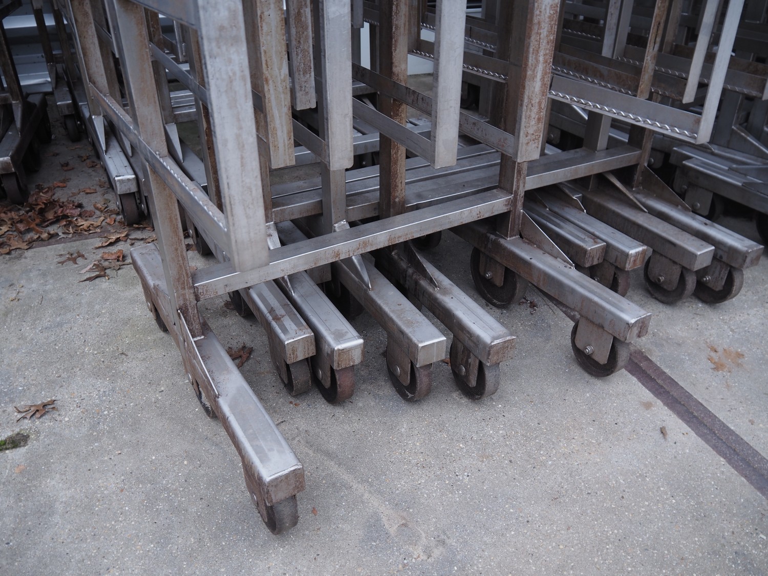 15 s/s smoke trolleys, 5 floors each, dimensions each floor: 960 mm x 900 mm, total dimensions: (15x) 960 mm x 910 mm x 1800 mm. Including 20 aluminium y-shaped smoke sticks per trolley, length each smoke stick: 880 mm.