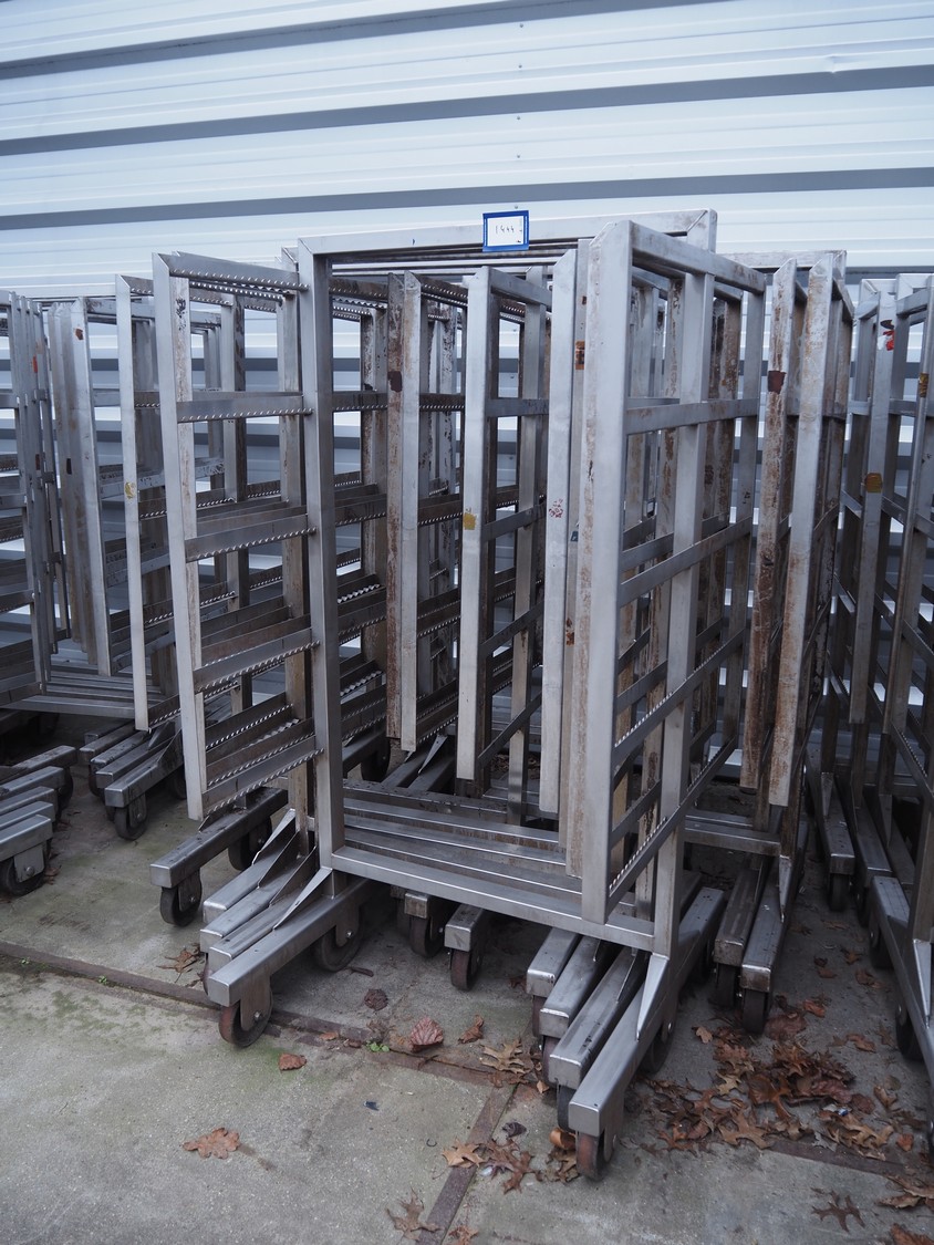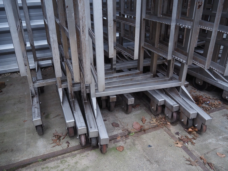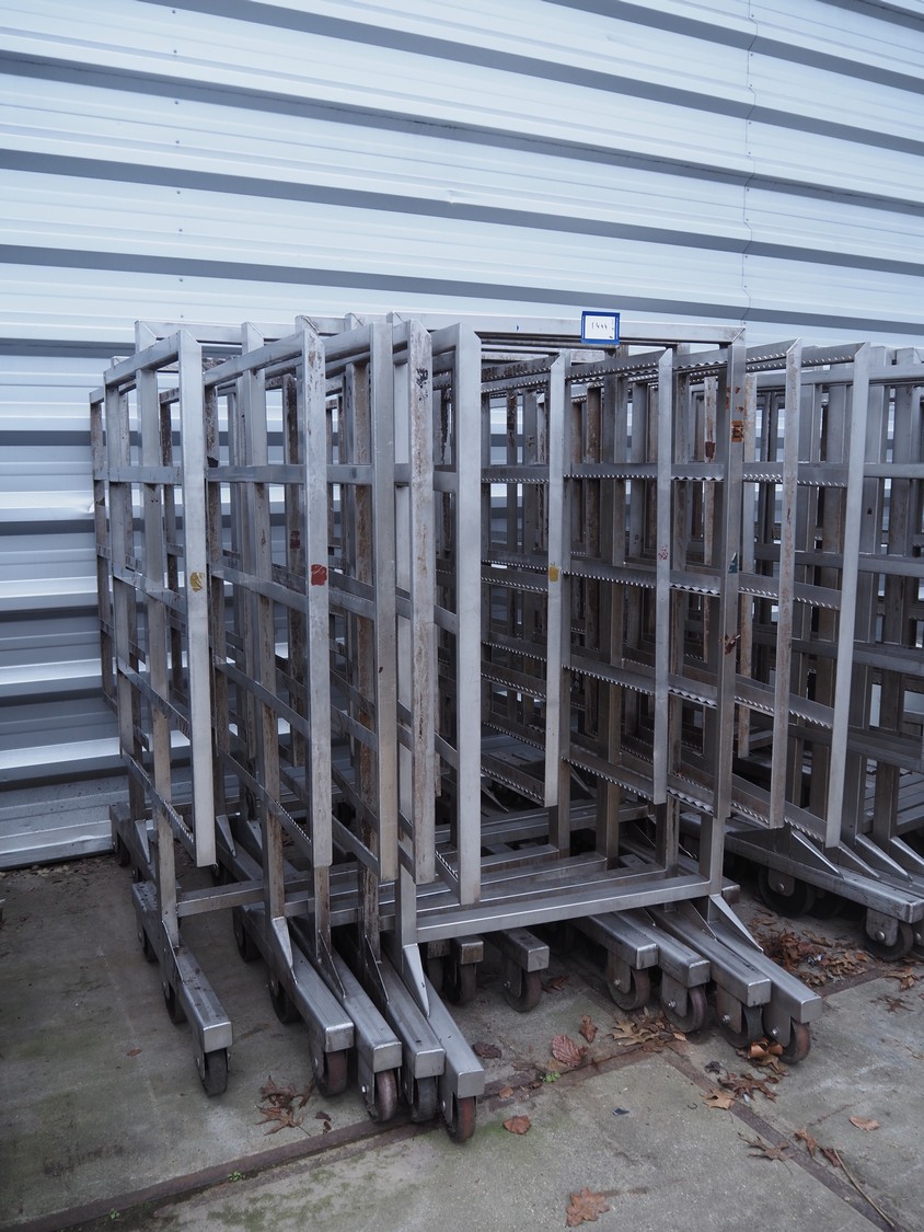 10 s/s smoke trolleys, 5 floors each, dimensions each floor: 960 mm x 900 mm, total dimensions: (10x) 960 mm x 910 mm x 1800 mm. Including 20 aluminium y-shaped smoke sticks per trolley, length each smoke stick: 880 mm.
