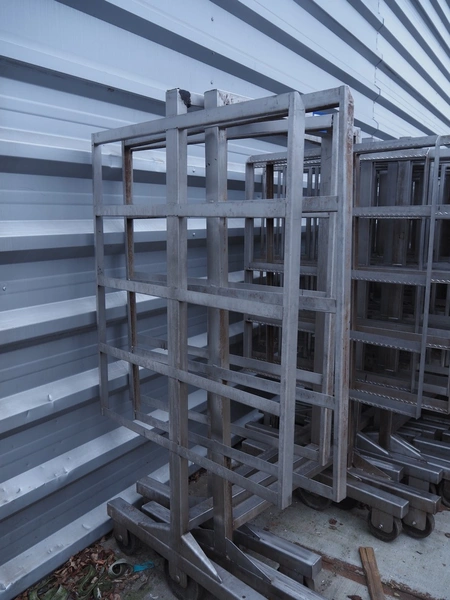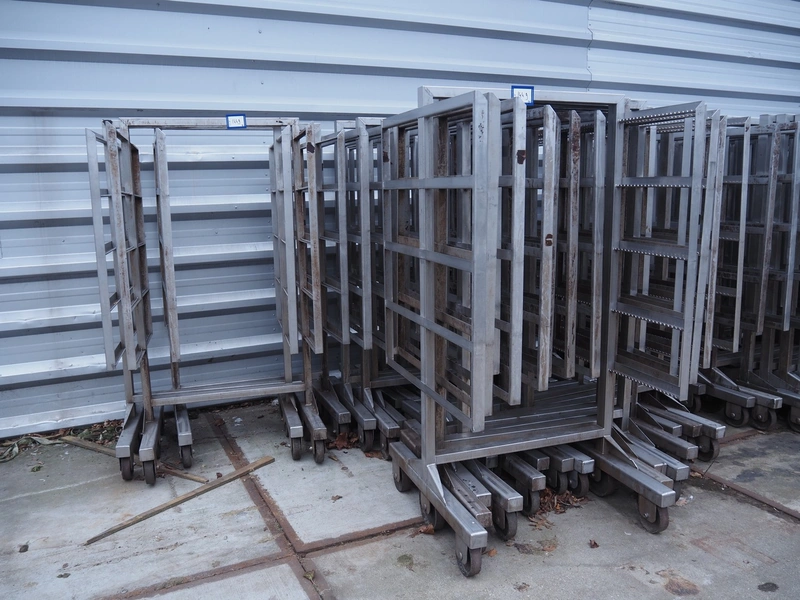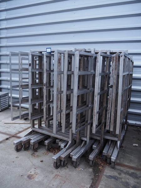 19 s/s smoke trolleys, 5 floors each, dimensions each floor: 960 mm x 900 mm, total dimensions: (19x) 960 mm x 910 mm x 1800 mm. Including 20 aluminium y-shaped smoke sticks per trolley, length each smoke stick: 880 mm.