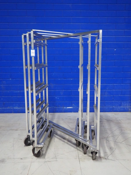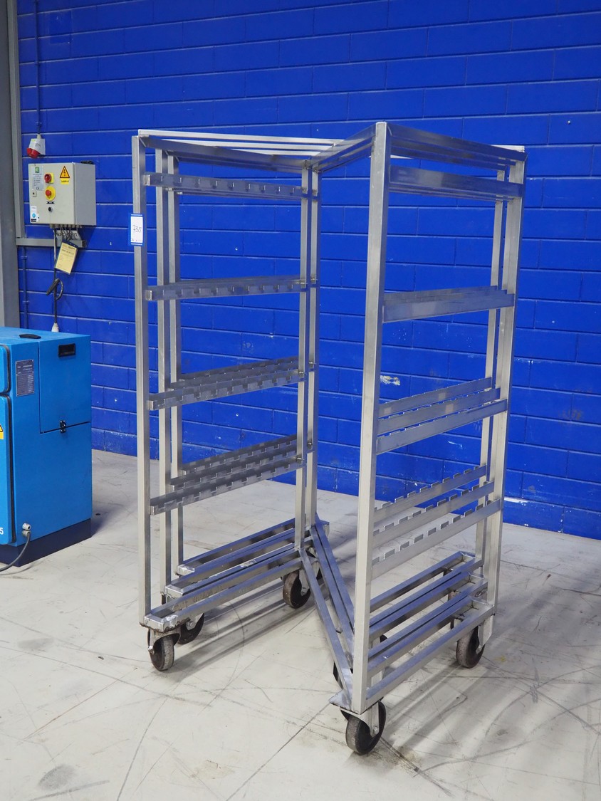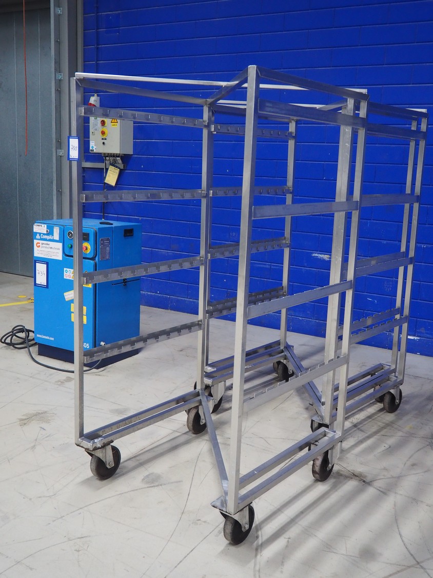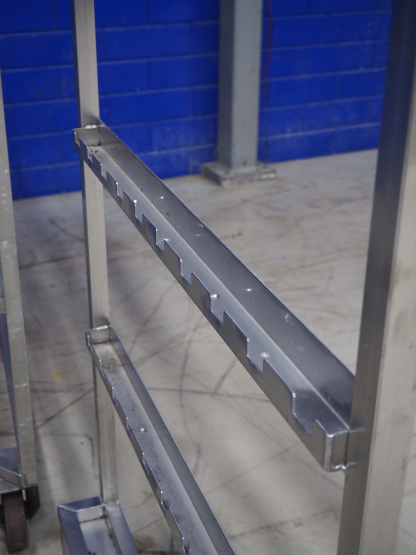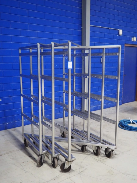 3 s/s smoke trolleys, Z-profile, 4 floors, dimensions each floor: 900 mm x 900 mm, total dimensions: (3x) 900 mm x 900 mm x 1800 mm.