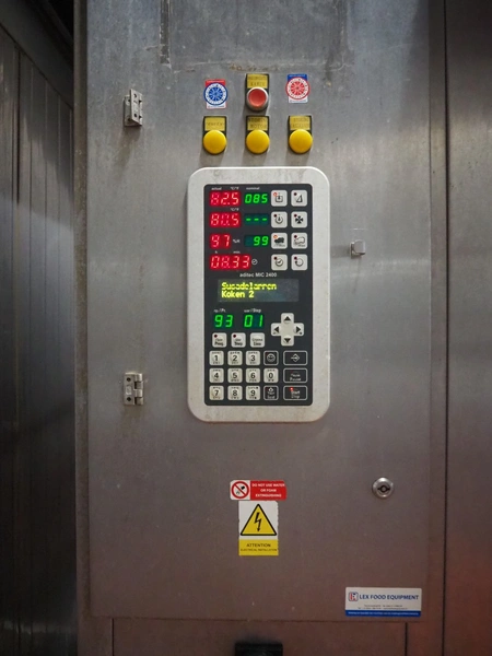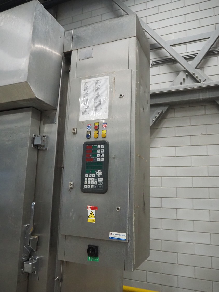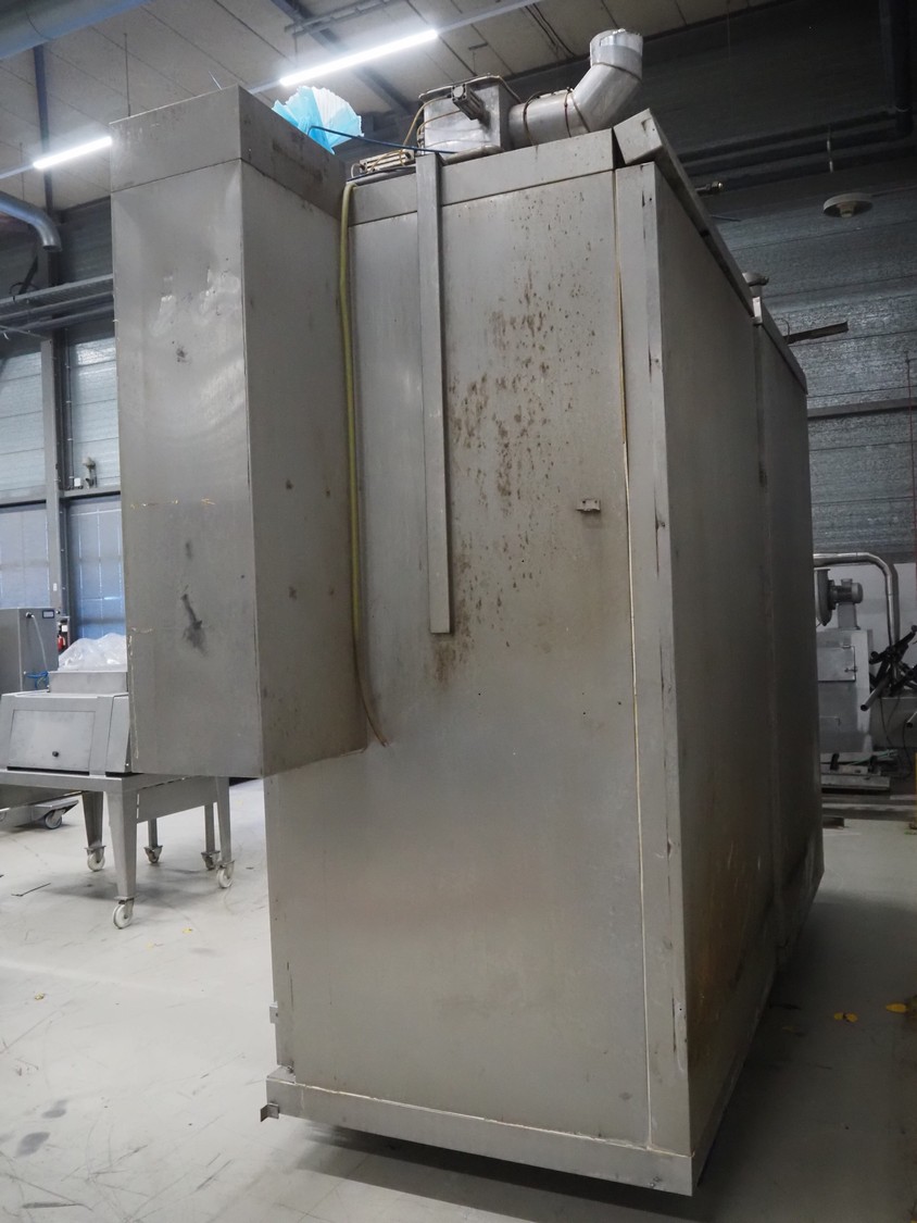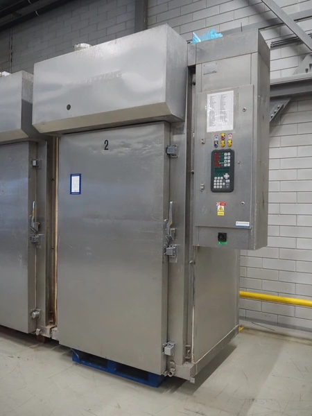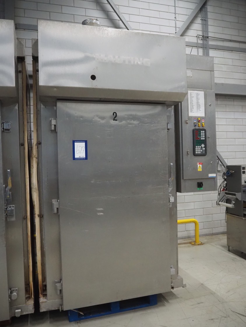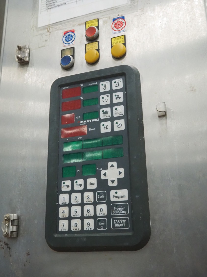 Mauting cooking and roasting chamber for 1 trolley, type: VPKM 2001 G-LL, serial number: 1138/05, year of construction: 2005, 400 V, 3 Ph, 9.5 A, 3.5 kW, weight: 1000 kg, Wieshaupt burner, type: WG10N/1A Z-LN, gas heated, dimensions: 1570 mm x 1200 mm x 3540 mm. Including s/s switch cabinet, dimensions: 500 mm x 400 mm x 1570 mm.