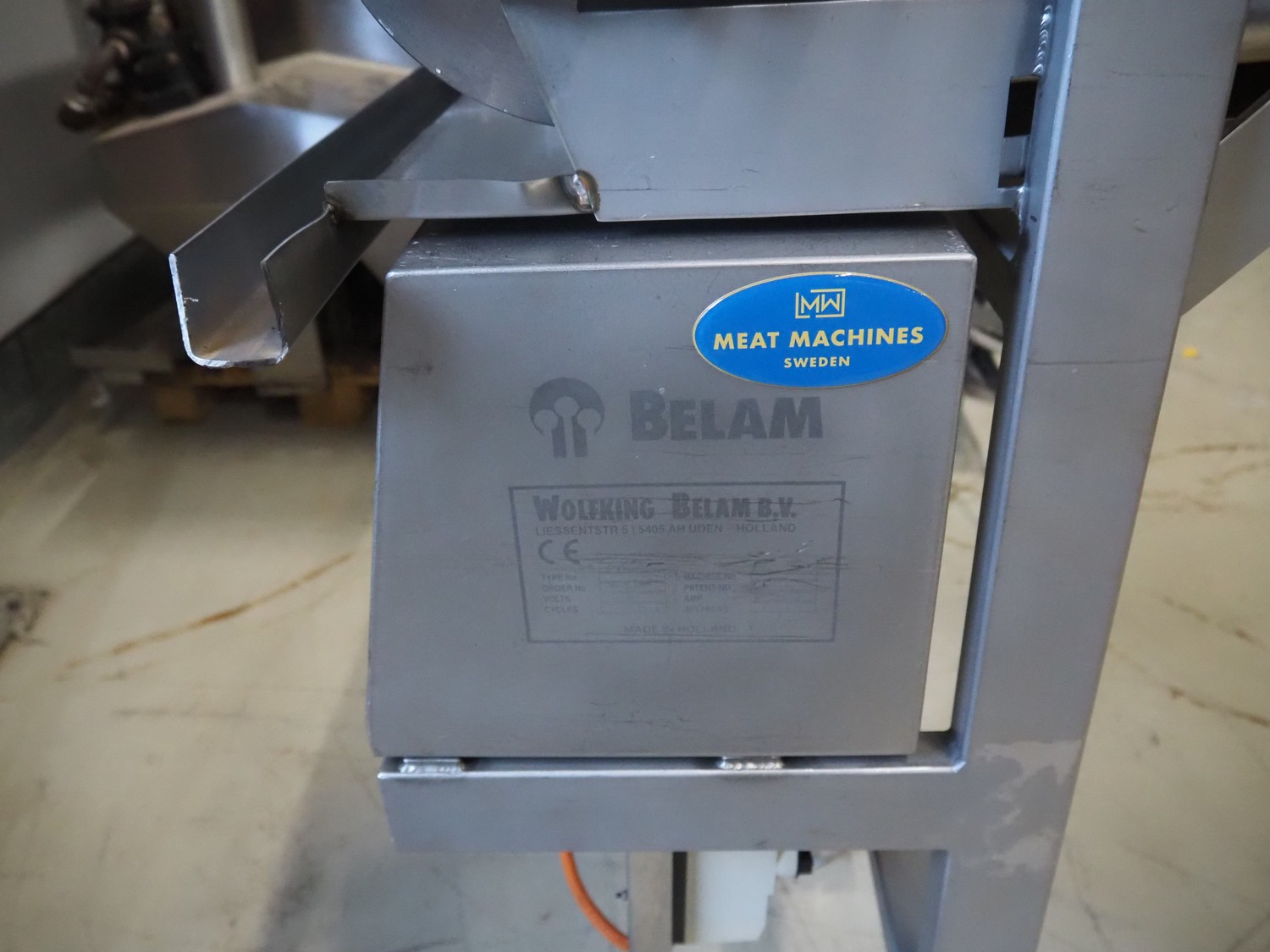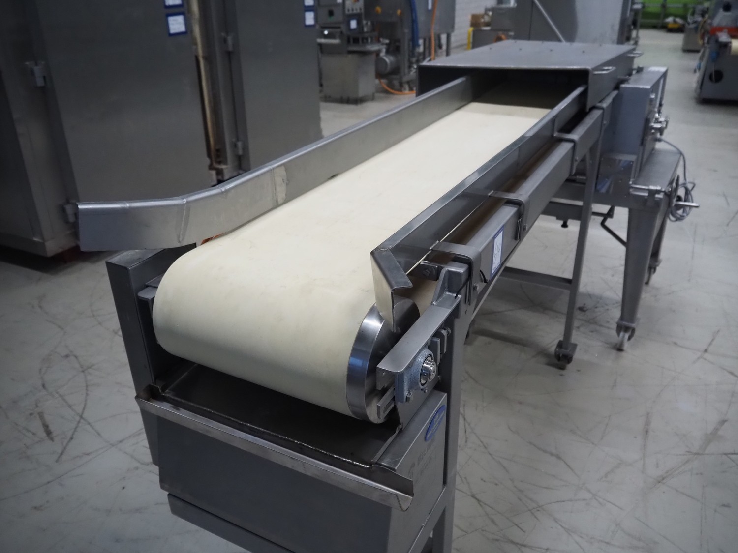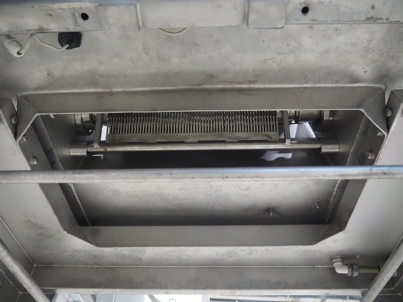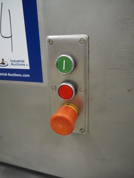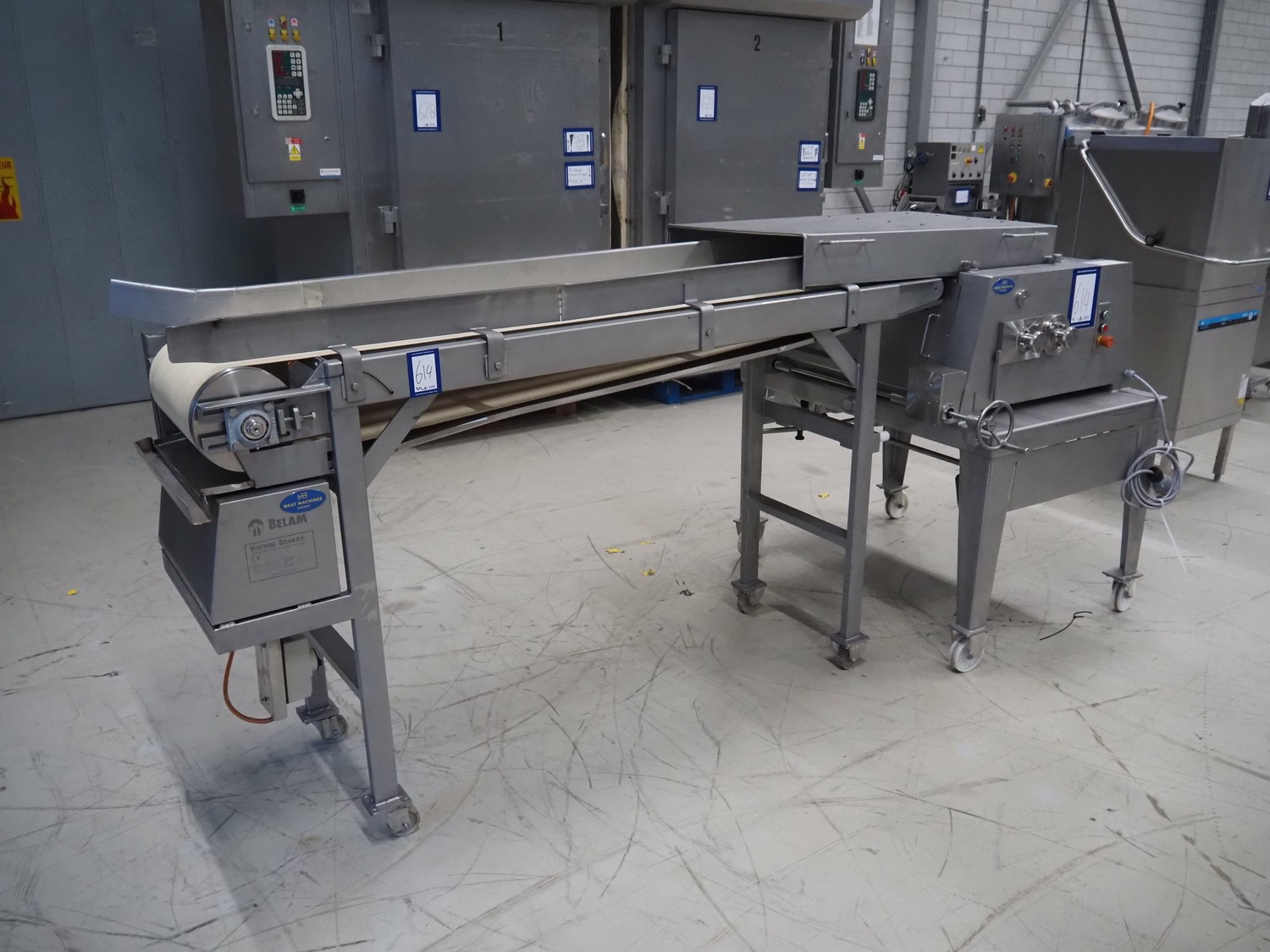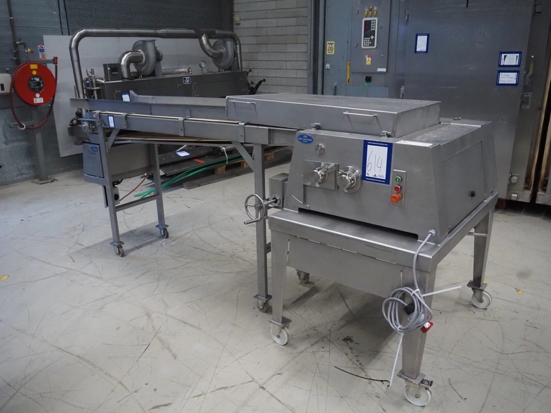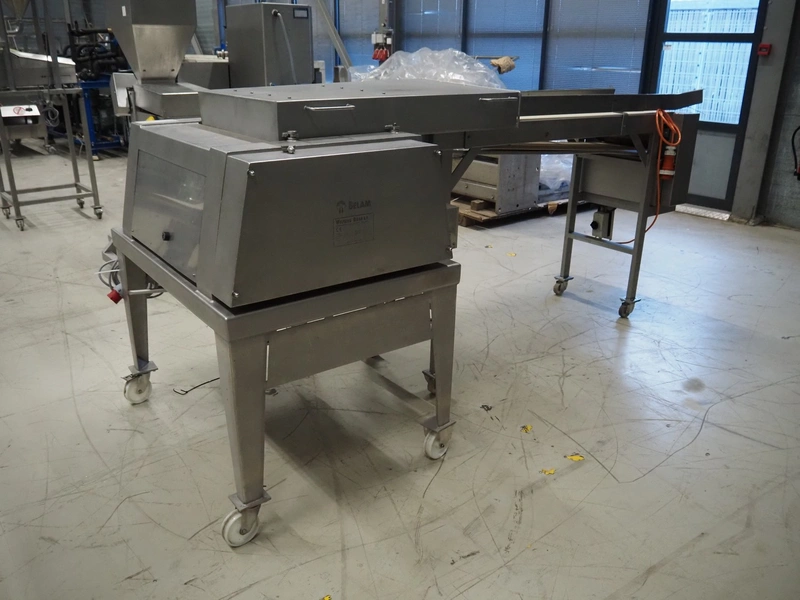 Wolfking Belam B.V. mobile steaker with mobile infeed belt, infeed belt, 400 V, 50 Hz, plastic belt, belt width: 410 mm, steaker type: IT-4 S, machine number: 9801-953.0032, year of construction: 1998, 400 V, 50 Hz, 6 A, working width: 440 mm, total dimensions: 3650 mm x 1400 mm x 1370 mm.