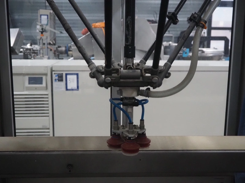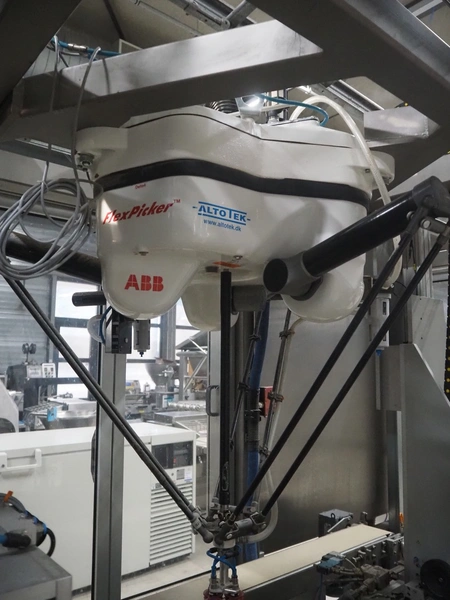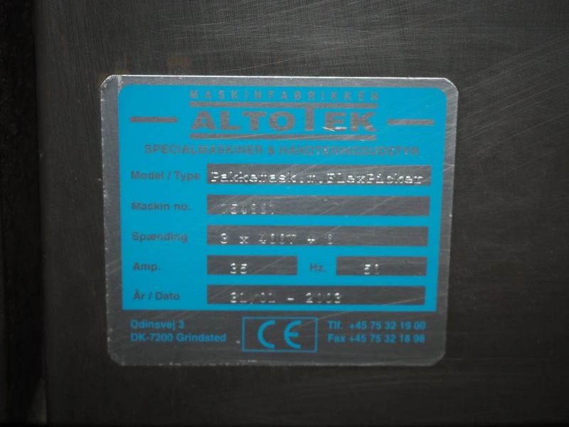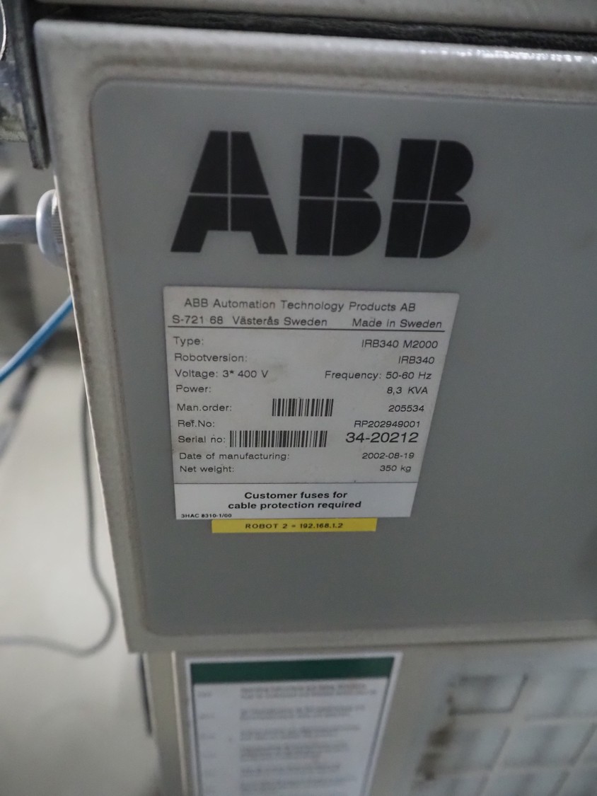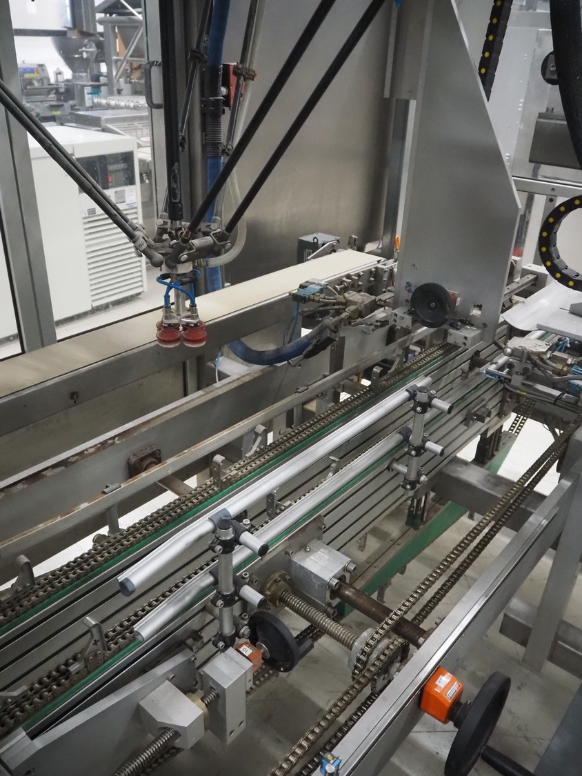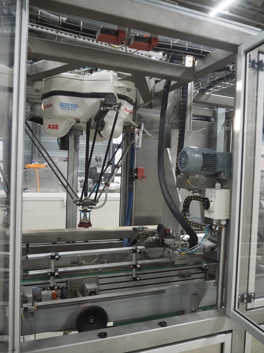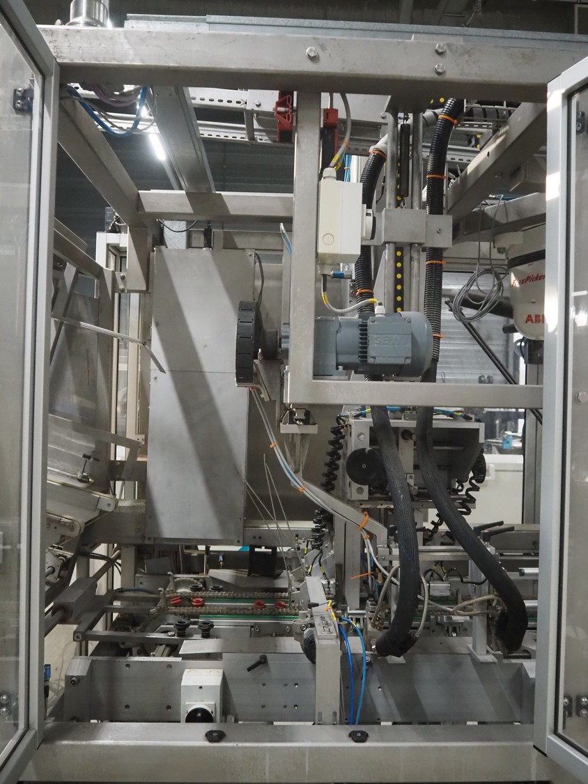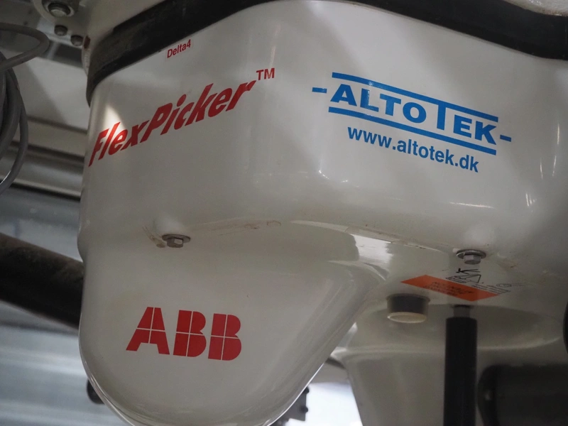 Altotek case erecting and filling machine with FlexPicker, machine number: 754867, year of construction: 31/01-2003, 400 V, 3 Ph, 50 Hz, 35 A, Nordson glue unit, minimum box sizes: 175 mm x 115 mm x 100 mm, maximum box sizes: 350 mm x 250 mm x 250 mm, s/s chain conveyor with dividers, belt width: 200 mm, distance between dividers: 350 mm, divider height: 50 mm, plastic belts, belt width: 130 mm, total dimensions: 4500 mm x 2000 mm x 2600 mm. With ABB control panel and cabinet for robot, type: IRB340 M2000, serial number: 34-20212, year of construction: 19-08-2002, dimensions: 900 mm x 550 mm x 1100 mm.