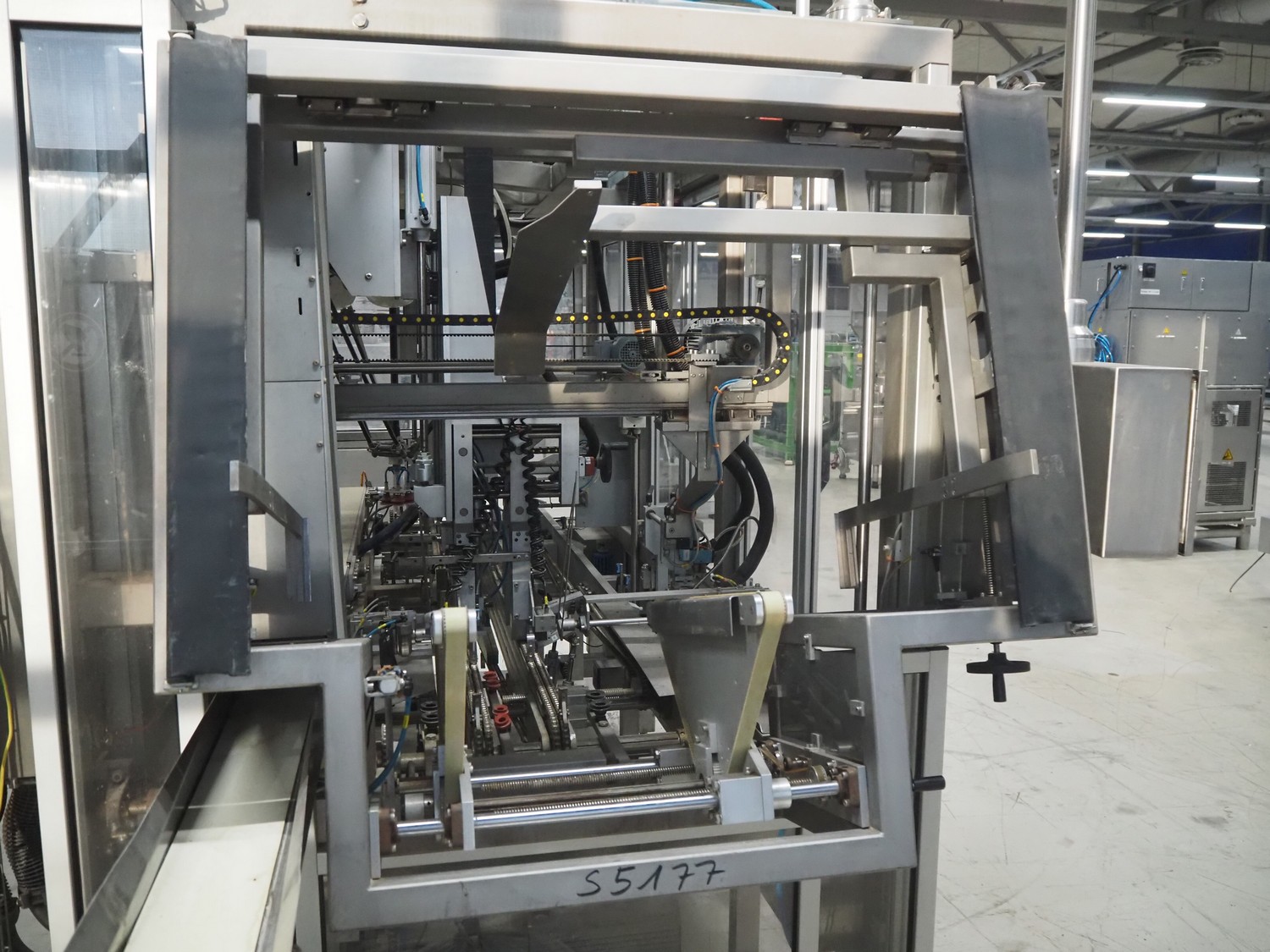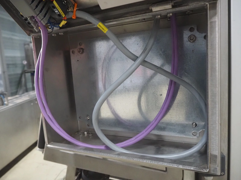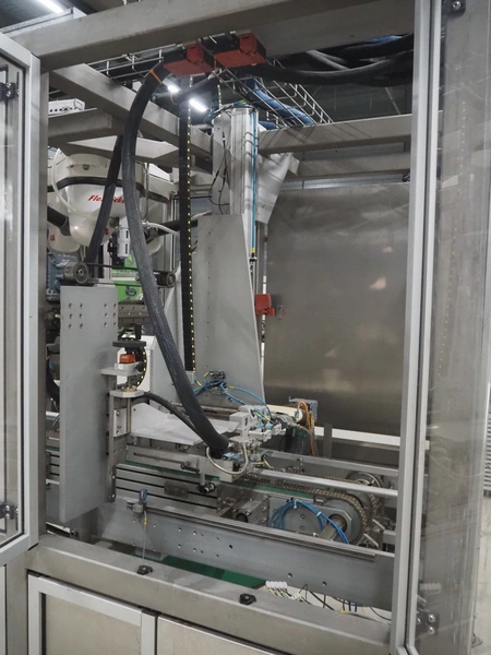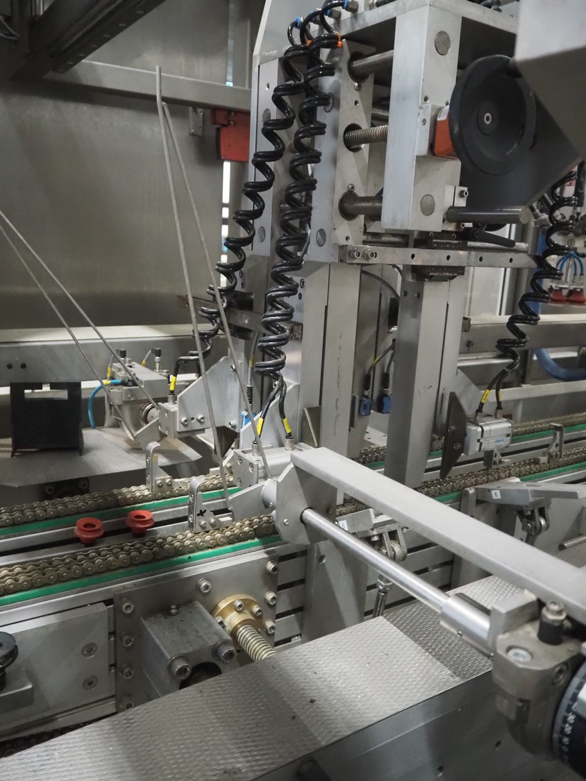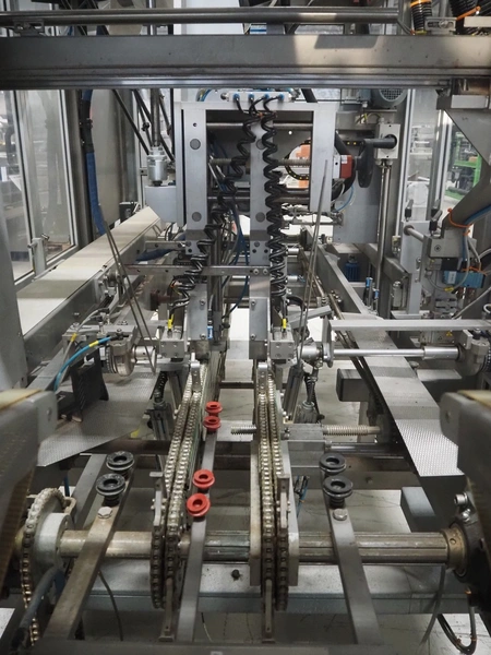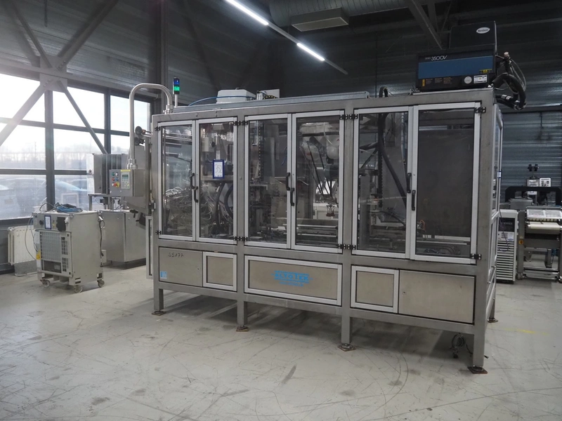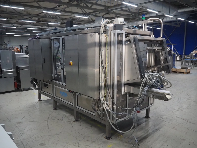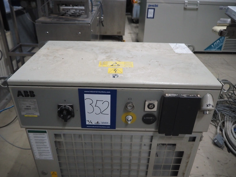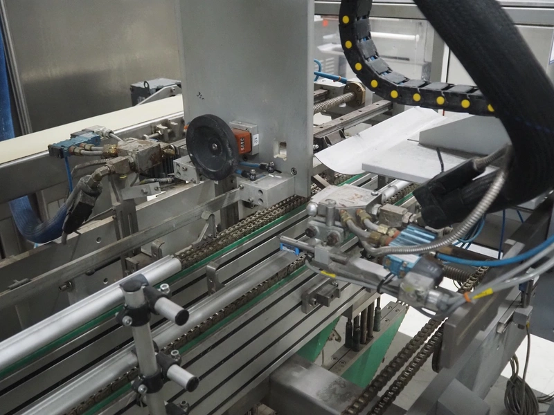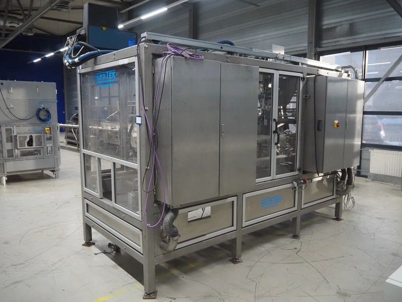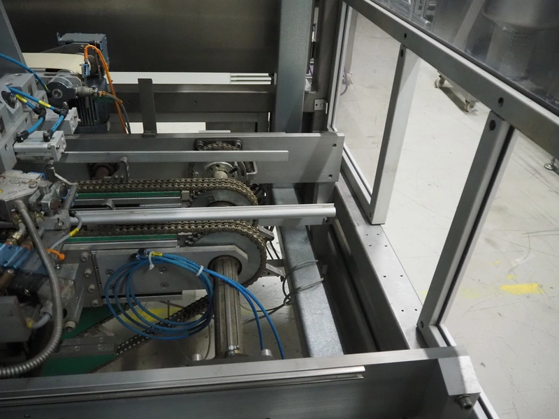 Altotek case erecting and filling machine with FlexPicker, machine number: 754867, year of construction: 31/01-2003, 400 V, 3 Ph, 50 Hz, 35 A, Nordson glue unit, minimum box sizes: 175 mm x 115 mm x 100 mm, maximum box sizes: 350 mm x 250 mm x 250 mm, s/s chain conveyor with dividers, belt width: 200 mm, distance between dividers: 350 mm, divider height: 50 mm, plastic belts, belt width: 130 mm, total dimensions: 4500 mm x 2000 mm x 2600 mm. With ABB control panel and cabinet for robot, type: IRB340 M2000, serial number: 34-20212, year of construction: 19-08-2002, dimensions: 900 mm x 550 mm x 1100 mm.