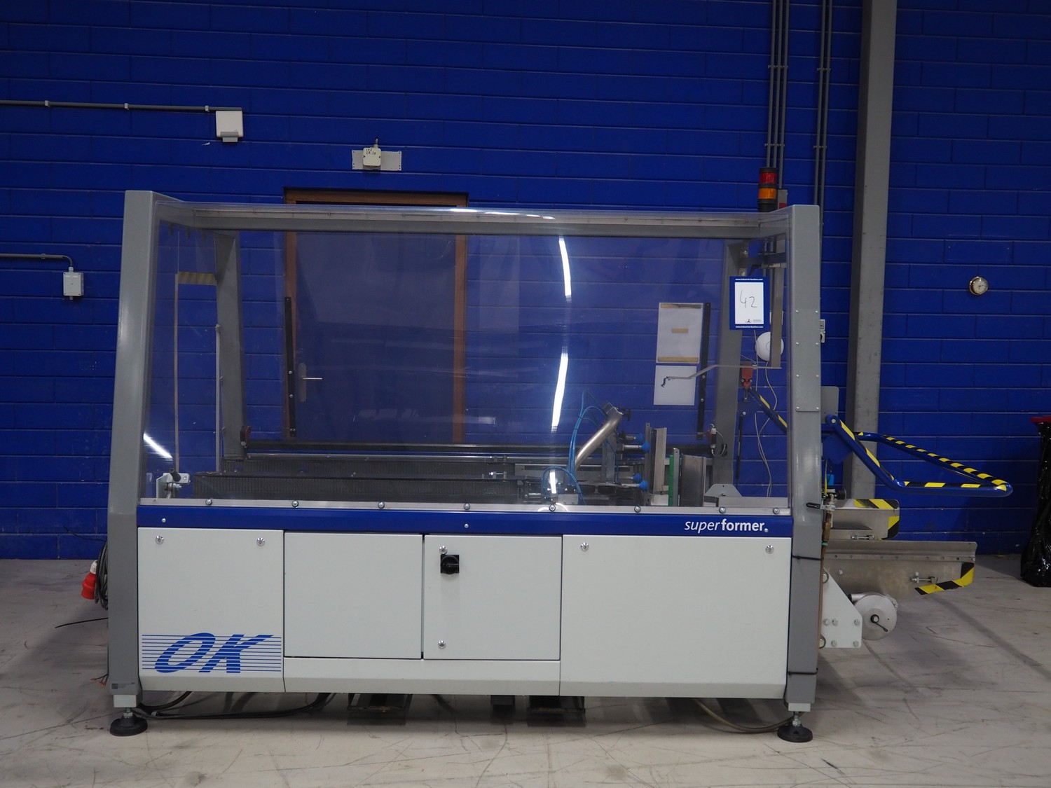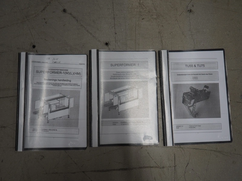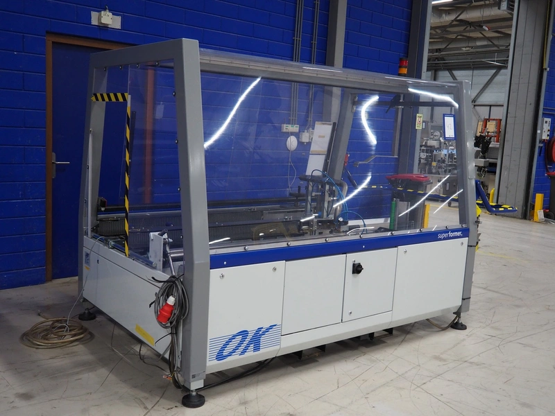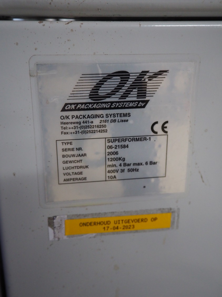 O/K Packaging Systems bv case erector, type: Superformer-1, serial number: 06-21584, year of construction: 2006, 400 V, 3 Ph, 50 Hz, 10 A, weight: 1200 kg, maximum box width: 350 mm, plastic belts, belt width: (2x) 95 mm, total dimensions: 3250 mm x 1700 mm x 2130 mm.