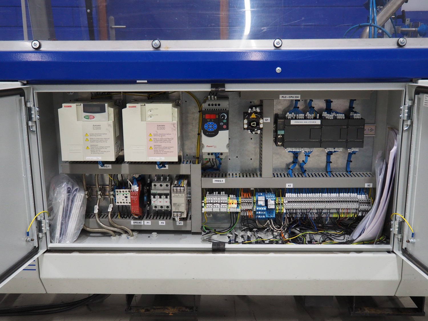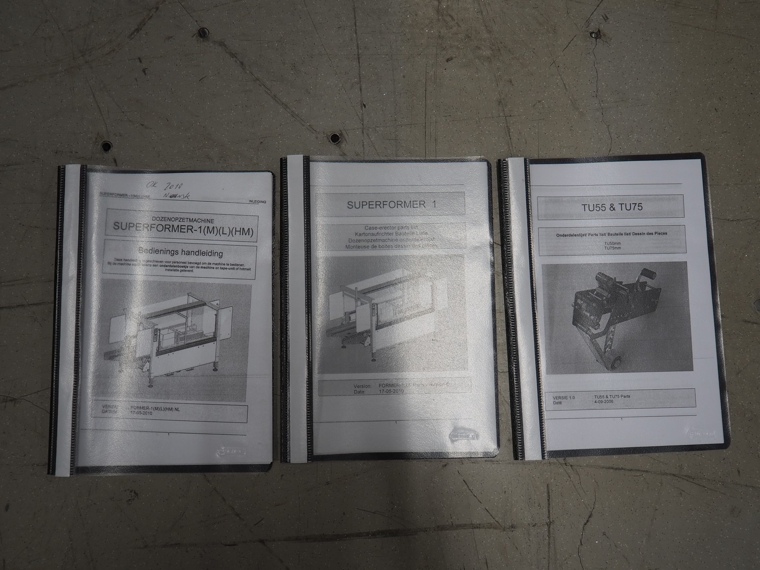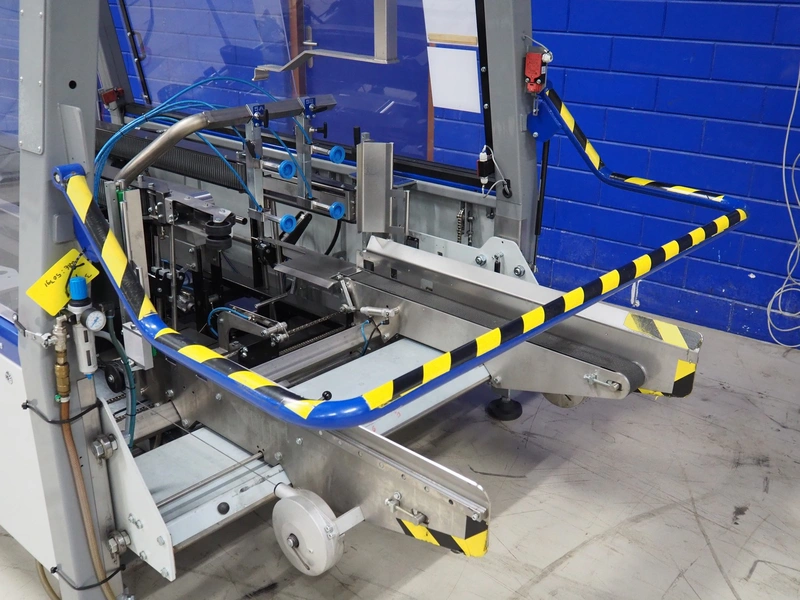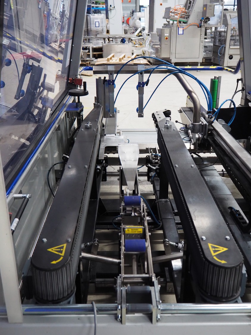 O/K Packaging Systems bv case erector, type: Superformer-1, serial number: 06-21584, year of construction: 2006, 400 V, 3 Ph, 50 Hz, 10 A, weight: 1200 kg, maximum box width: 350 mm, plastic belts, belt width: (2x) 95 mm, total dimensions: 3250 mm x 1700 mm x 2130 mm.